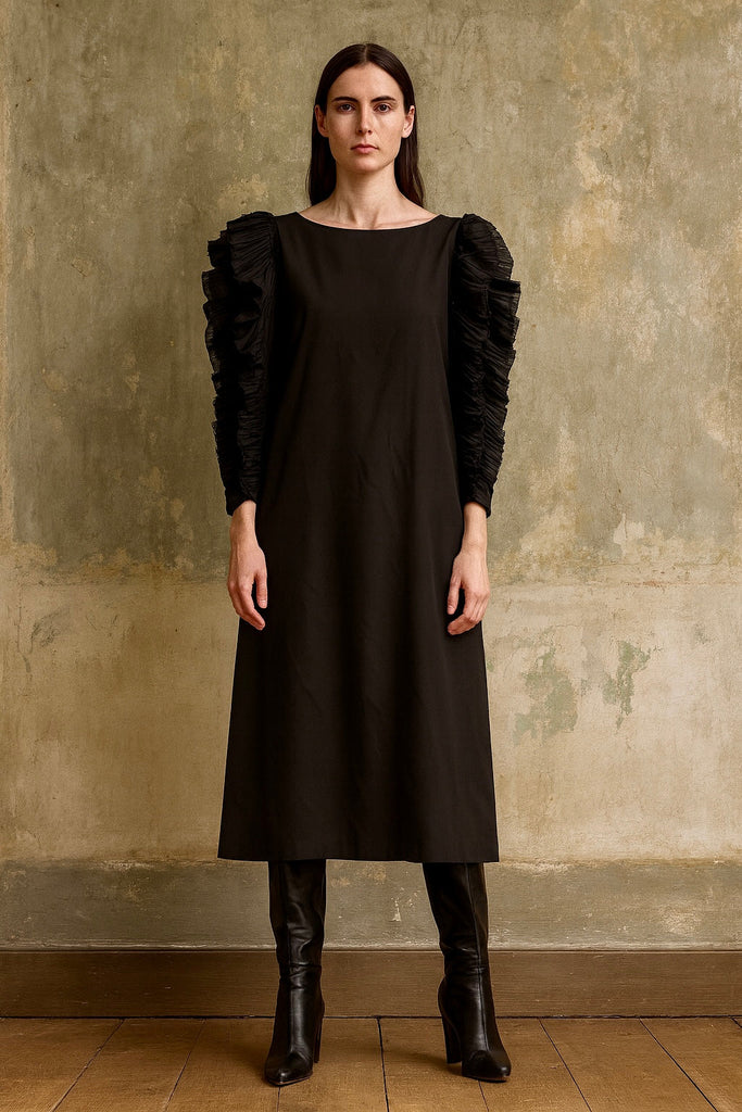 Mary McFadden, 80s silk shift dress with ruffle sleeves