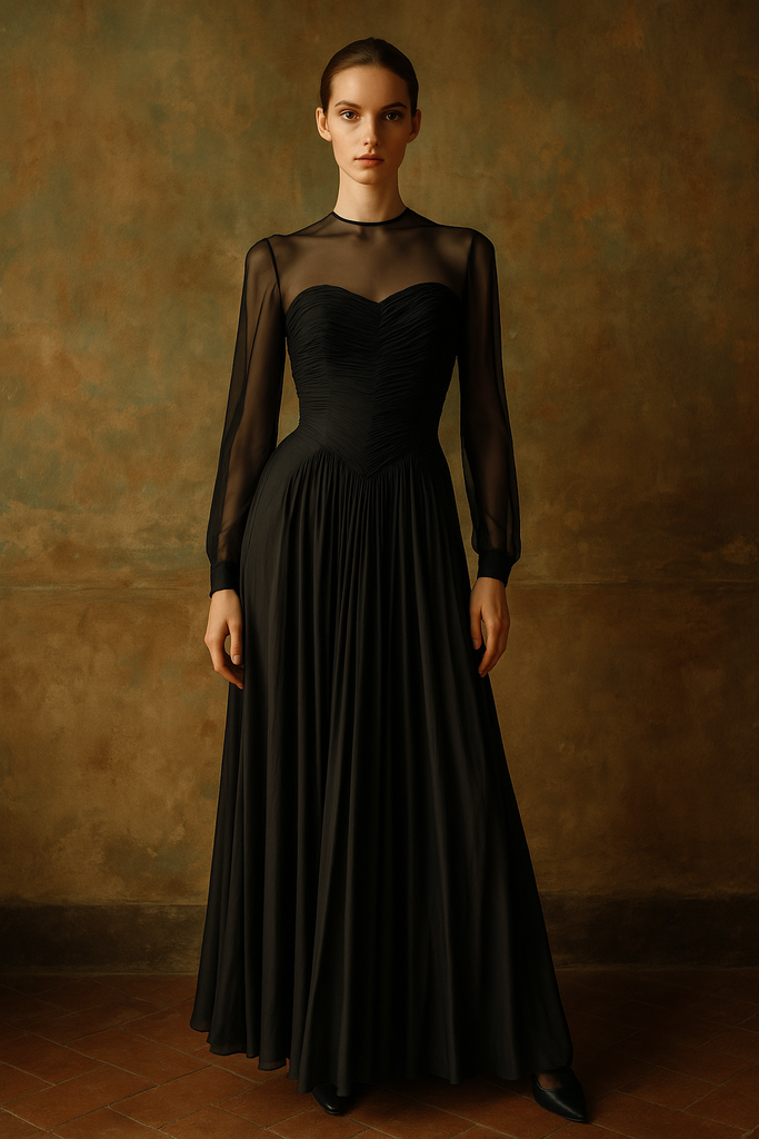 Richilene, couture 70s black pleated chiffon dress