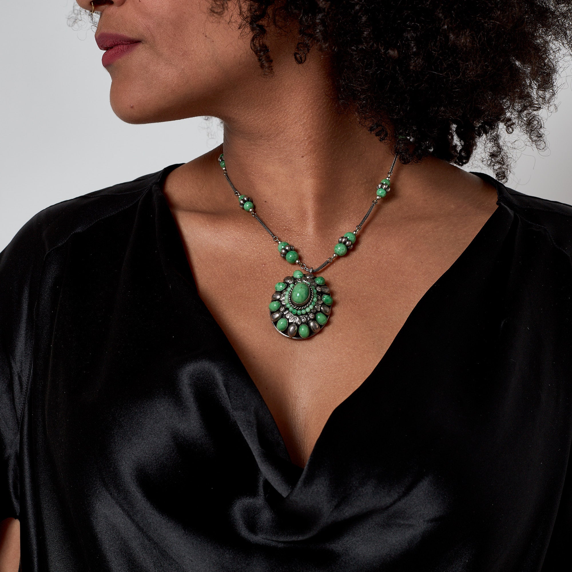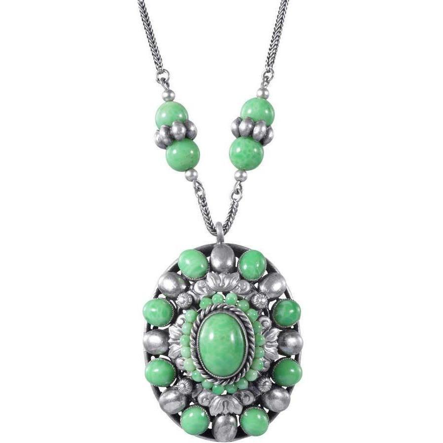 This beautiful 1920s Peking glass pendant necklace is most likely to be of Czech origin and we suspect it may be the work of Czech costume jewellery designers the Neiger brothers. The oval shaped pendant features large jade coloured Peking glass cabochons and beads juxtaposed with silver toned metal work. The elaborate metal work depicts a ring of flora to surround the large glass centrepiece and intermittent oval shapes around the edges to echo the smaller oval cabochons in shape and size. The pendant is backed with an ornate filigree metal design. The original silver toned chain is 16 inches long (not including the pendant) and 0.1 inches thick and interspersed with decorative beaded links sympathetic in design. There is a screw fastening original to the necklace to secure. An opulent and romantic piece with a timeless Art Nouveau aesthetic in excellent vintage condition.
