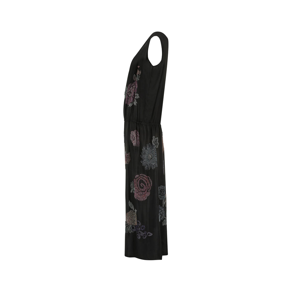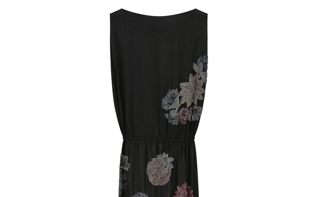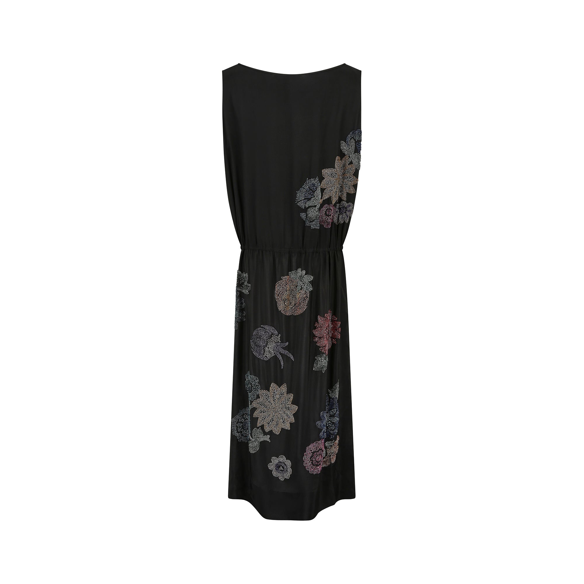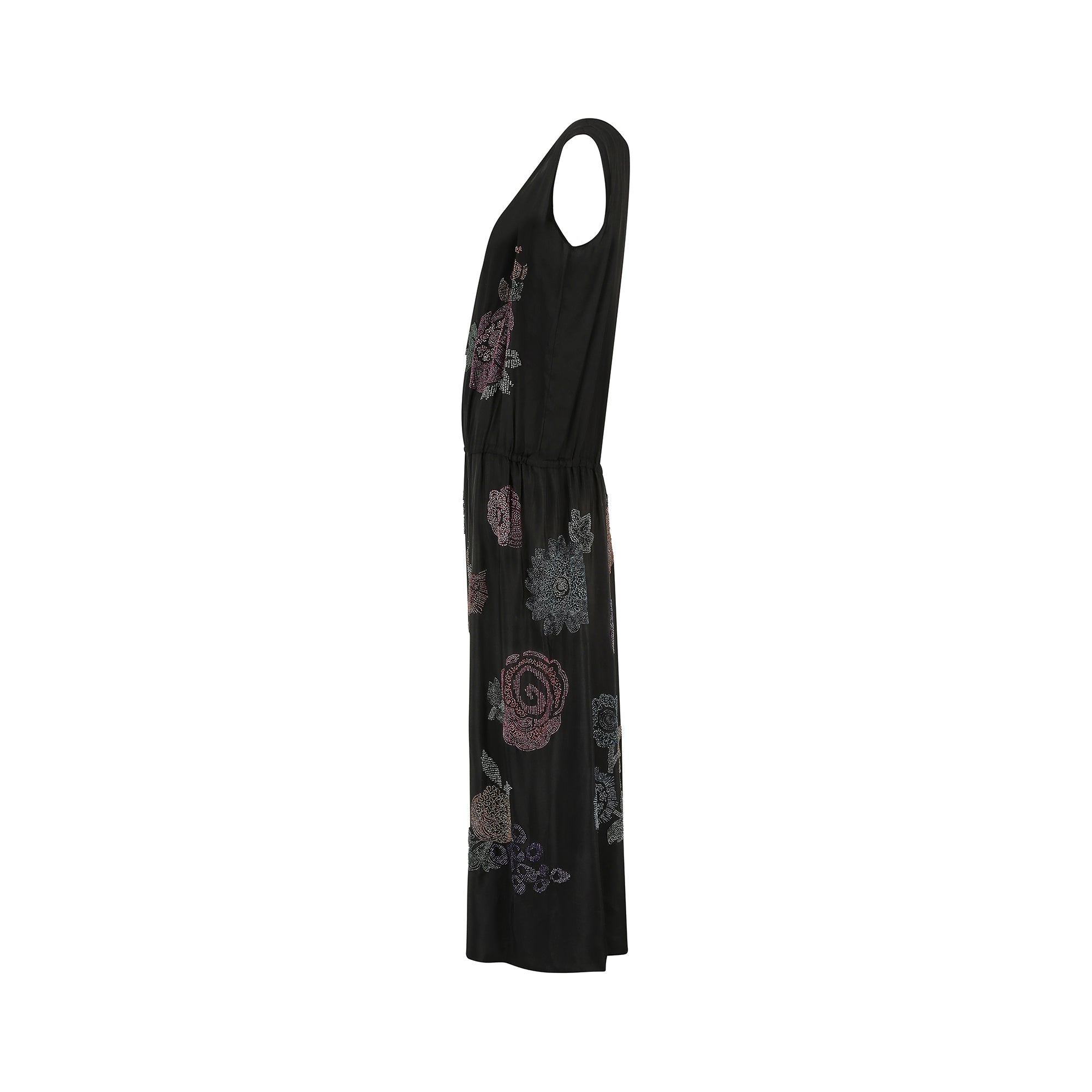 This dress has a sleeveless, blouson top style v-neck and is fashioned with a lightly gathered drop-waist. This fluid, tubular tailoring was typical of the must-have dresses of this era and the silk crepe is adorned with brightly beaded flowers, among them sunflowers, thistles and gerberas. The original label sits inside the waistband and reads “Adair 4. Cité Paradis Paris”. A century old, this piece is in flawless antique condition - absolutely extraordinary for something of this age. The dress slips on over the head and can be worn with due care and attention. Due to the relaxed nature of the design, she will fit up to a US 6-8 or UK 10-12.