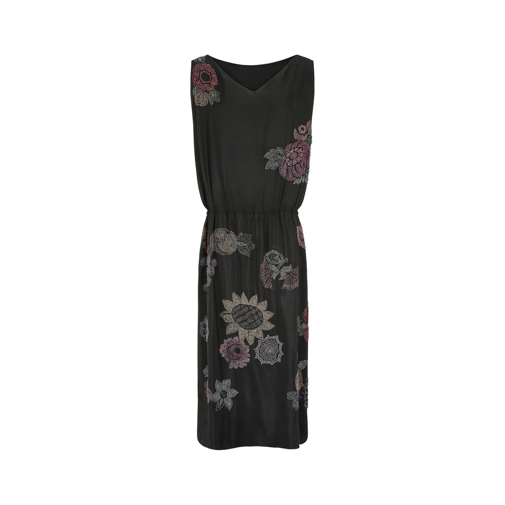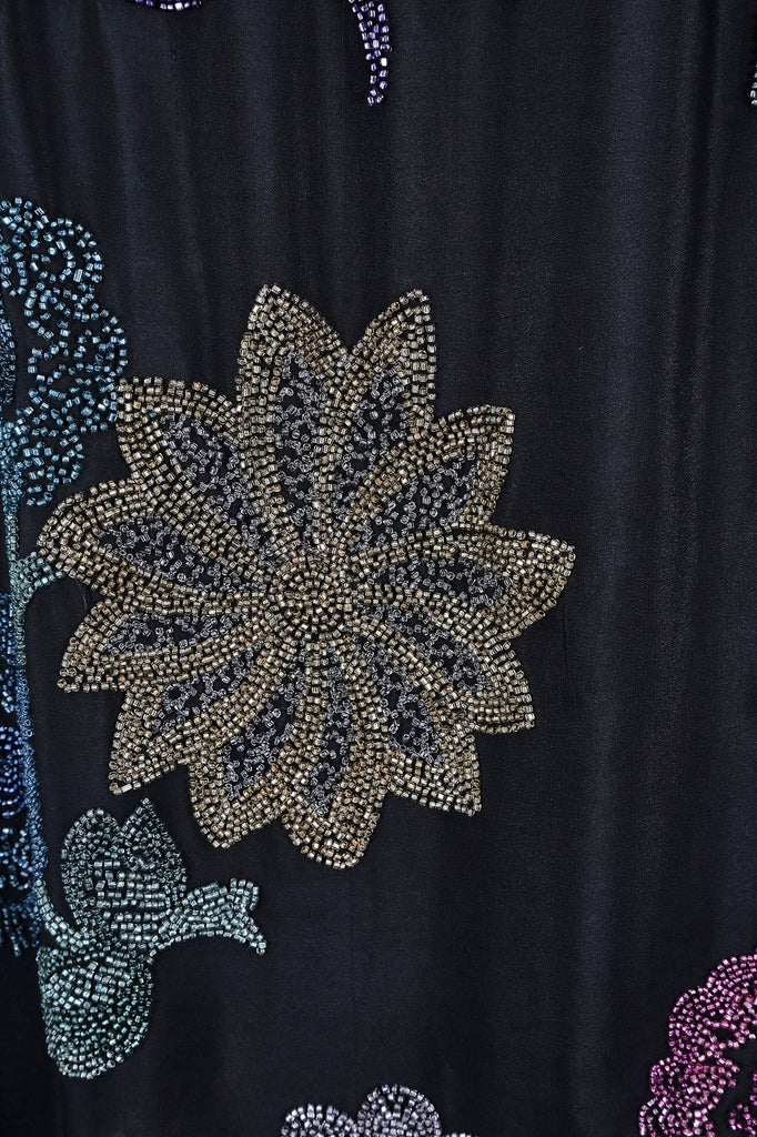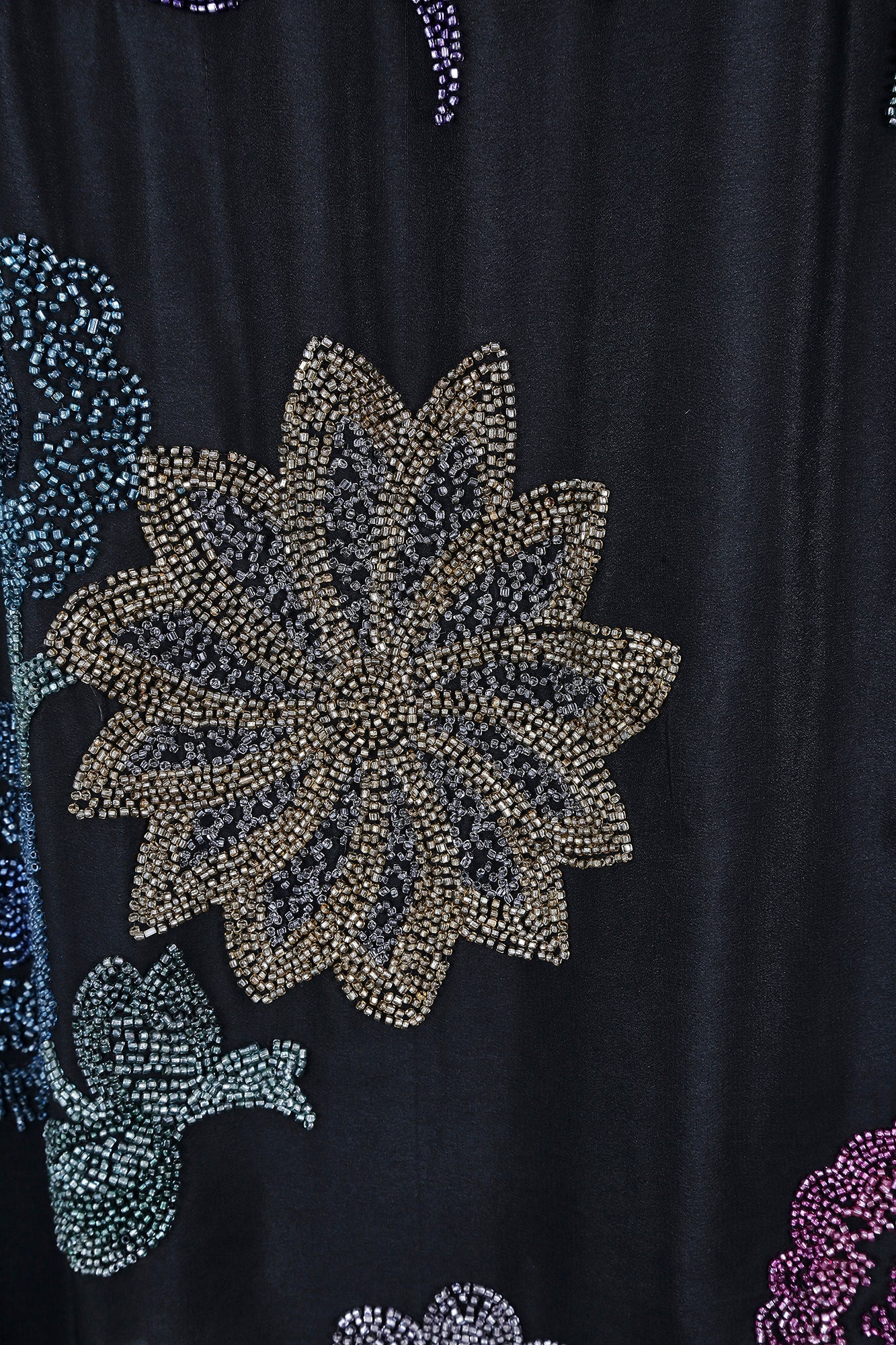 1920s House of Adair Floral Black Crepe Beaded Flapper Dress