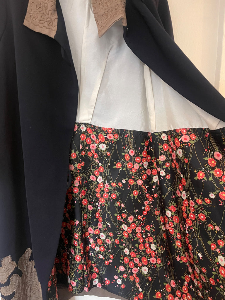 This wonderfully made original 1920s flapper coat is crafted from smooth navy and khaki wool. It is tailored to a cocooning shape with an asymmetric fastening, wide sleeves and a high neckline. The detail across this jacket is beautiful, the khaki wool around the bottom hem, collar and along the bottom half of the sleeves is detailed with elaborate tonal ribbon work. These khaki areas have beautiful irregular, swirling hems where they meet the navy wool. The coat fastens along the left side of the front with two large patterned plastic buttons through fabric loops. It is also secured at the collar with a hidden snap closure. Inside, the coat is lined with two stunning silks, one in pale cream at the top and, below this, a beautiful black silk detailed with pink, red and white florals. The lining looks to be a carefully sewn-in replacement and peeking underneath, I can see the last remnants of the original blue lining which likely shattered due to age.