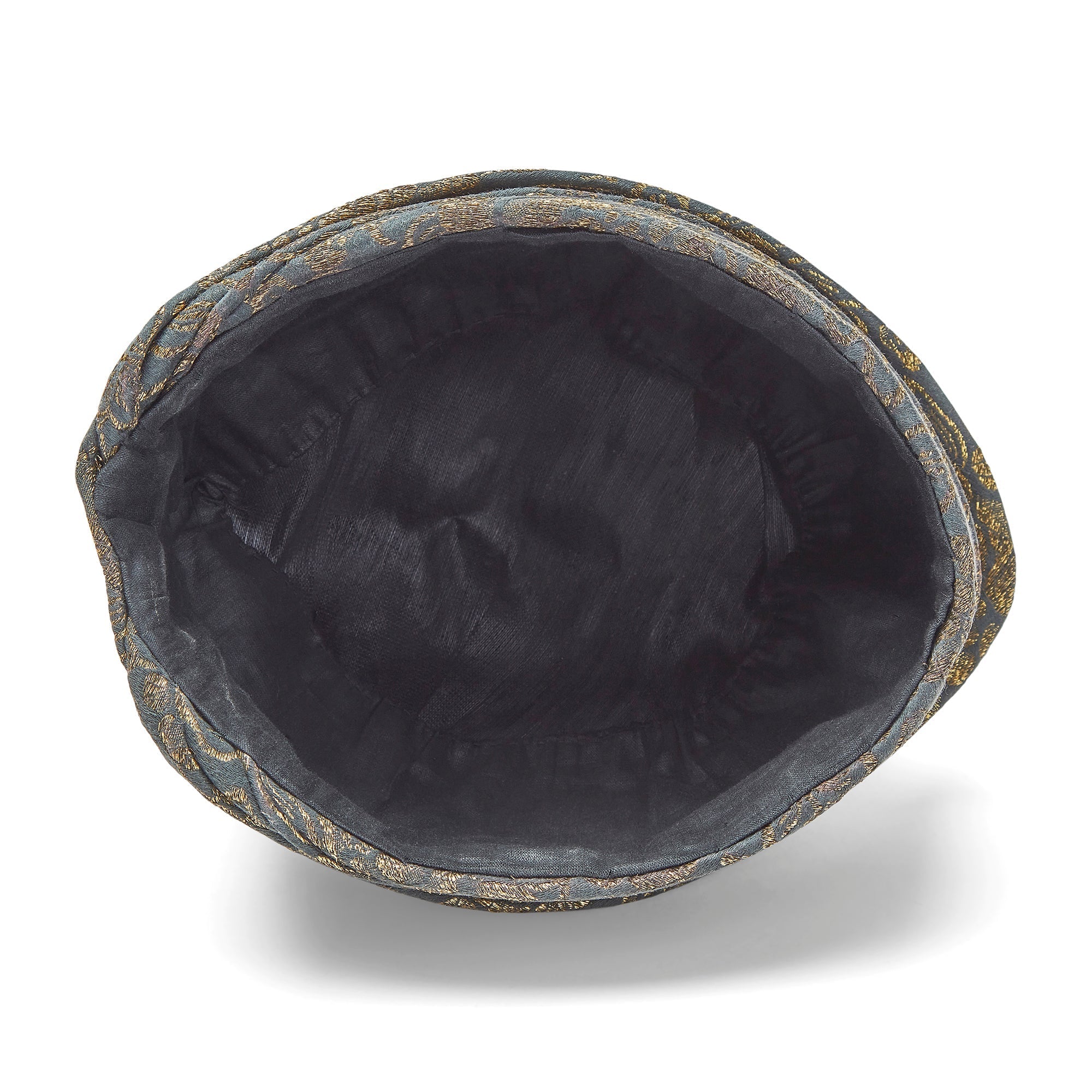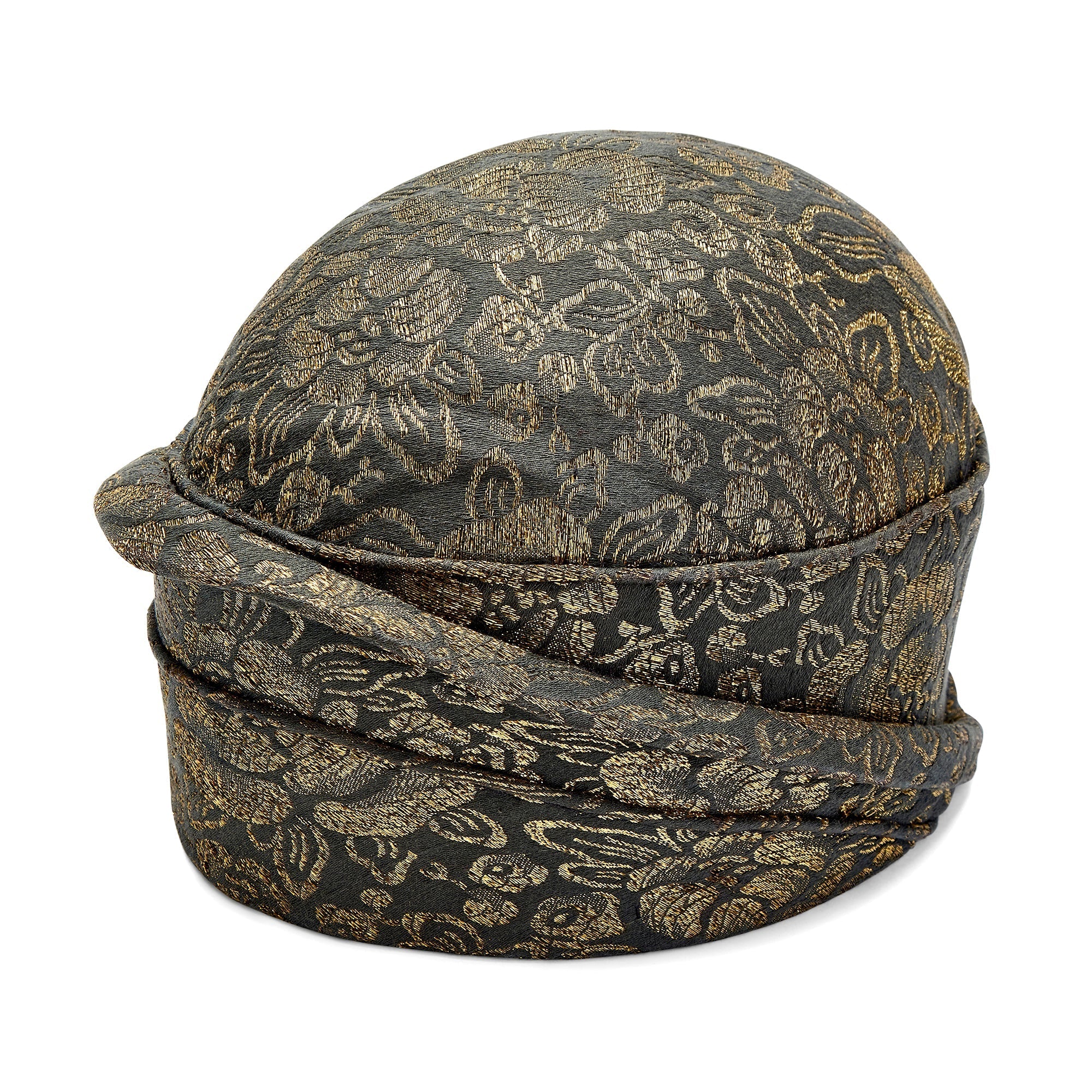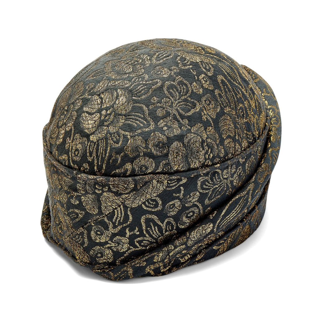 This highly collectable hat was designed in the 1920s and is tailored to a classic cloche shape. An expensive and well made couture piece, it is crafted from a charcoal lamé detailed with gold metallic thread. This shimmering thread forms floral motifs across the entire outer surface. Designed to look as though it wraps around the head, it is tailored with swathes of fabric which circle the solid form of the hat and create a theatrical peak at the front. The inside of the hat is lined with inky black shot-silk which makes it a comfortable wear.