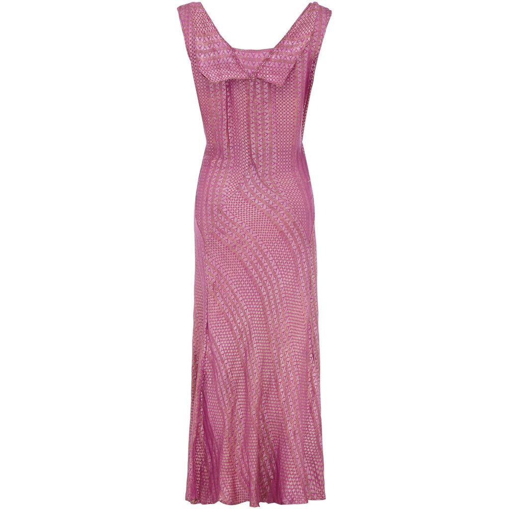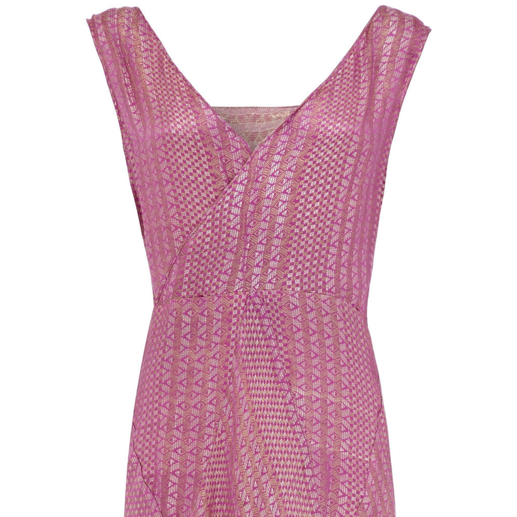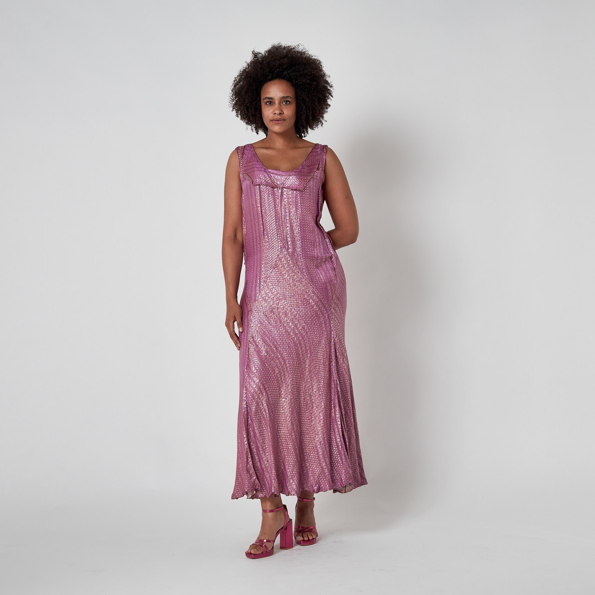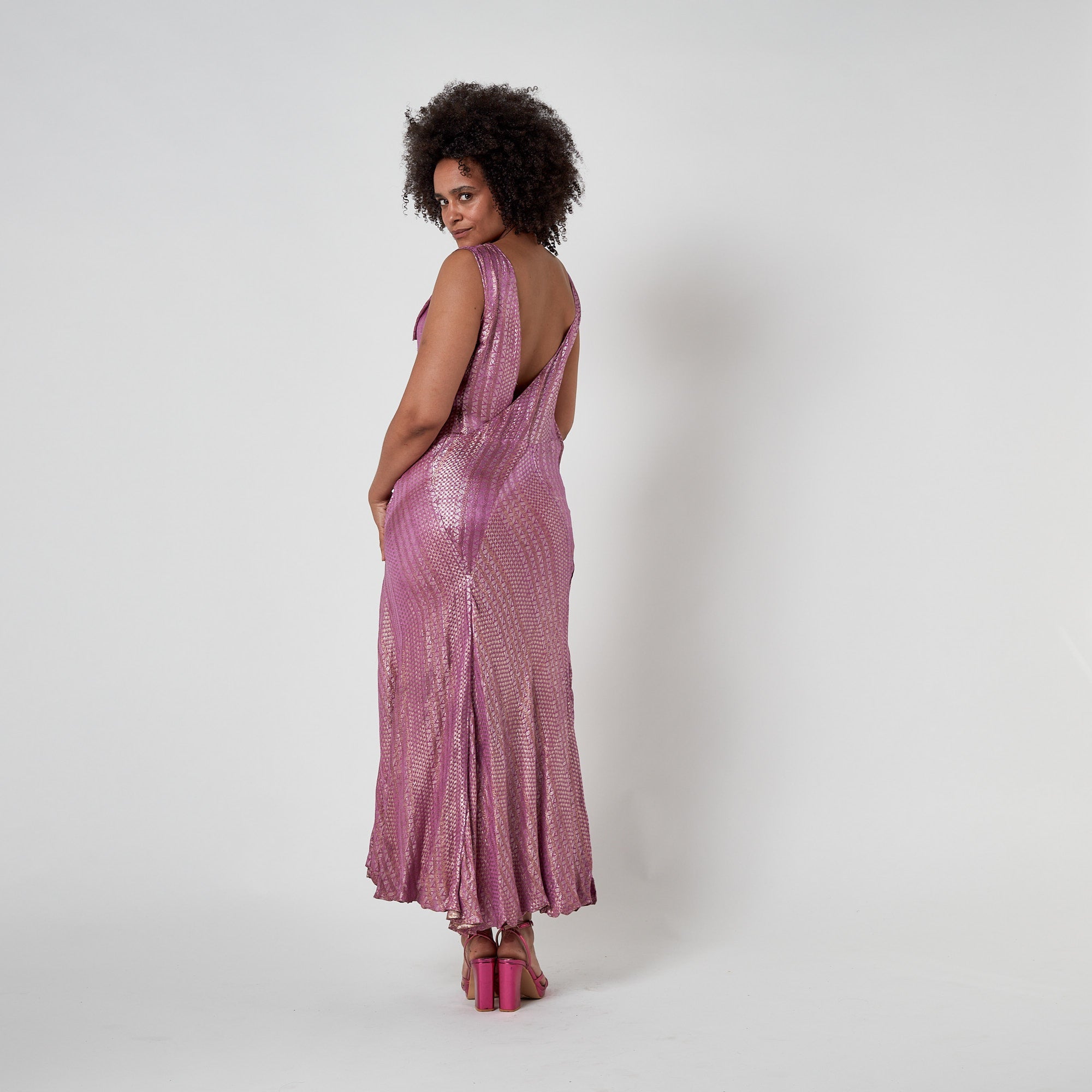 This is a sensational 1920s full-length pink flapper dress. The detail of the fabric is extraordinary, with aztec-style gold and silver woven lamé design would make a memorable choice for a summer party. It features a V-neckline crossing over the bust, with artfully tailored bias-cut sections through the floor-length skirt adding volume and fluidity of movement. In true flapper style there is slightly dropped, unfitted waistline. The nature of the cut would effortlessly accommodate a broader hip measurement to create a highly defined hourglass silhouette for a curvier figure. There are no fastenings and the dress just slips on over the head with a pretty collar detail at the lowered back.