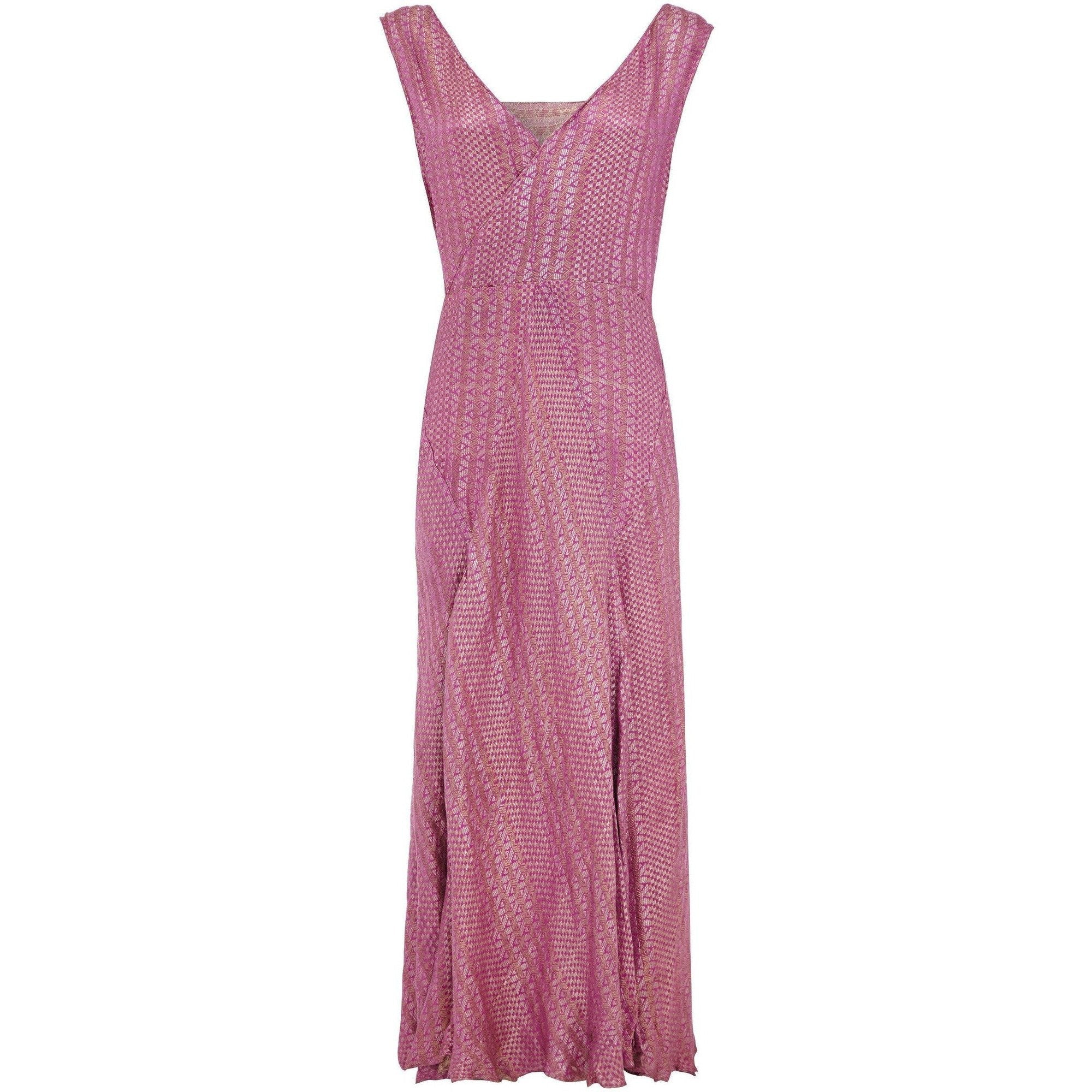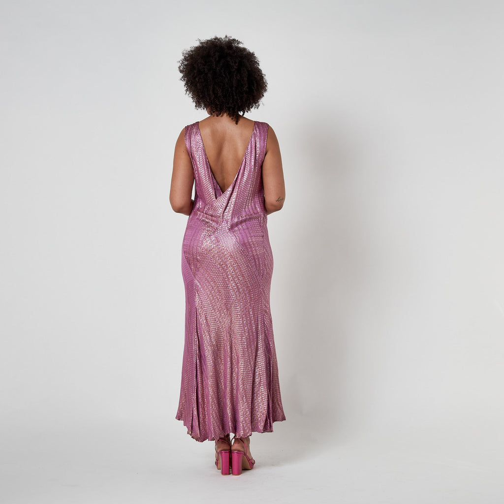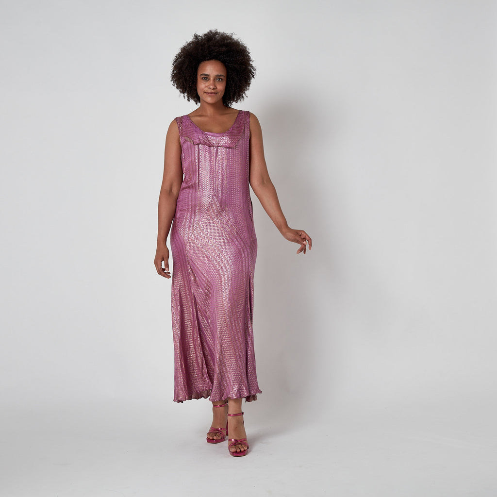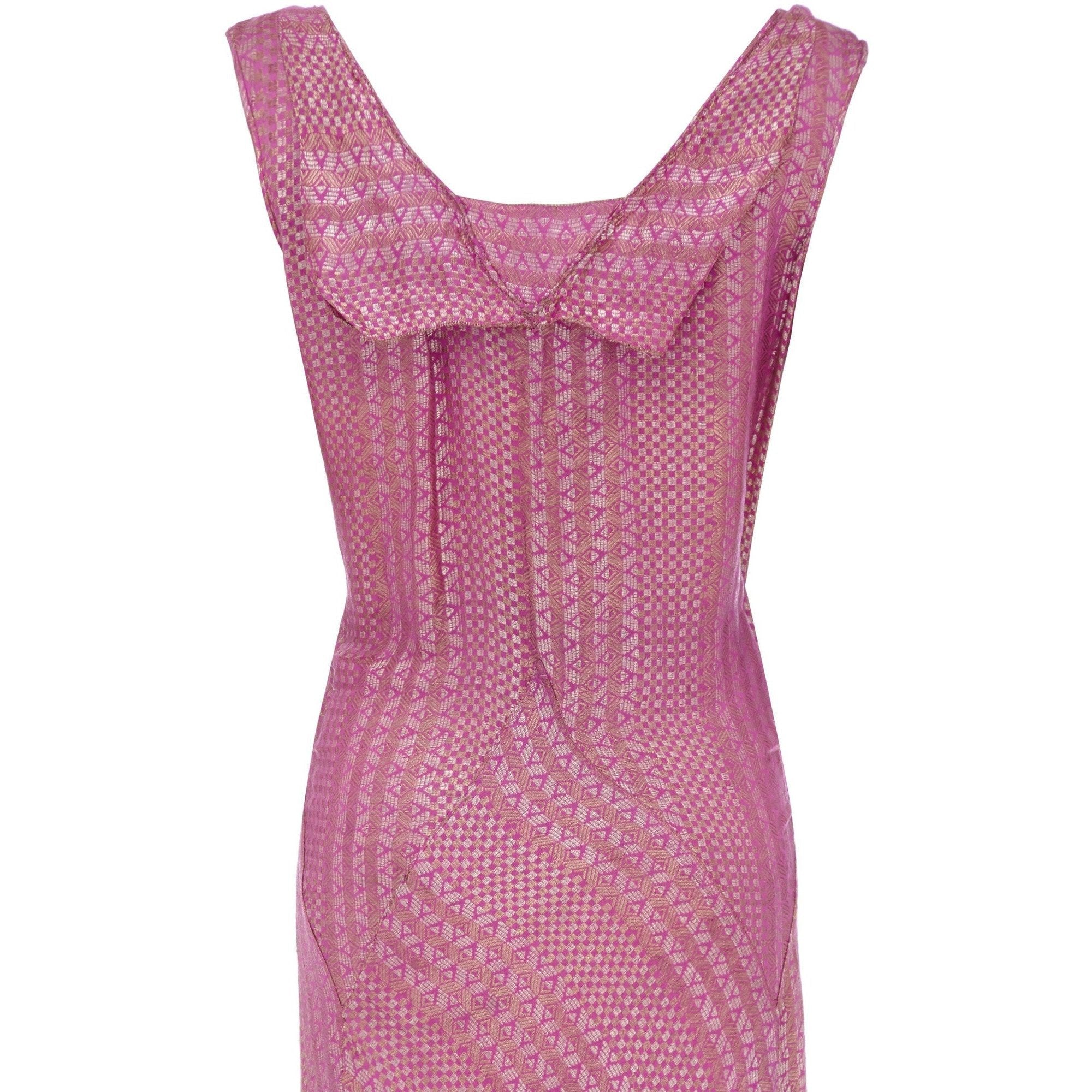 This is a sensational 1920s full-length pink flapper dress. The detail of the fabric is extraordinary, with aztec-style gold and silver woven lamé design would make a memorable choice for a summer party. It features a V-neckline crossing over the bust, with artfully tailored bias-cut sections through the floor-length skirt adding volume and fluidity of movement. In true flapper style there is slightly dropped, unfitted waistline. The nature of the cut would effortlessly accommodate a broader hip measurement to create a highly defined hourglass silhouette for a curvier figure. There are no fastenings and the dress just slips on over the head with a pretty collar detail at the lowered back.