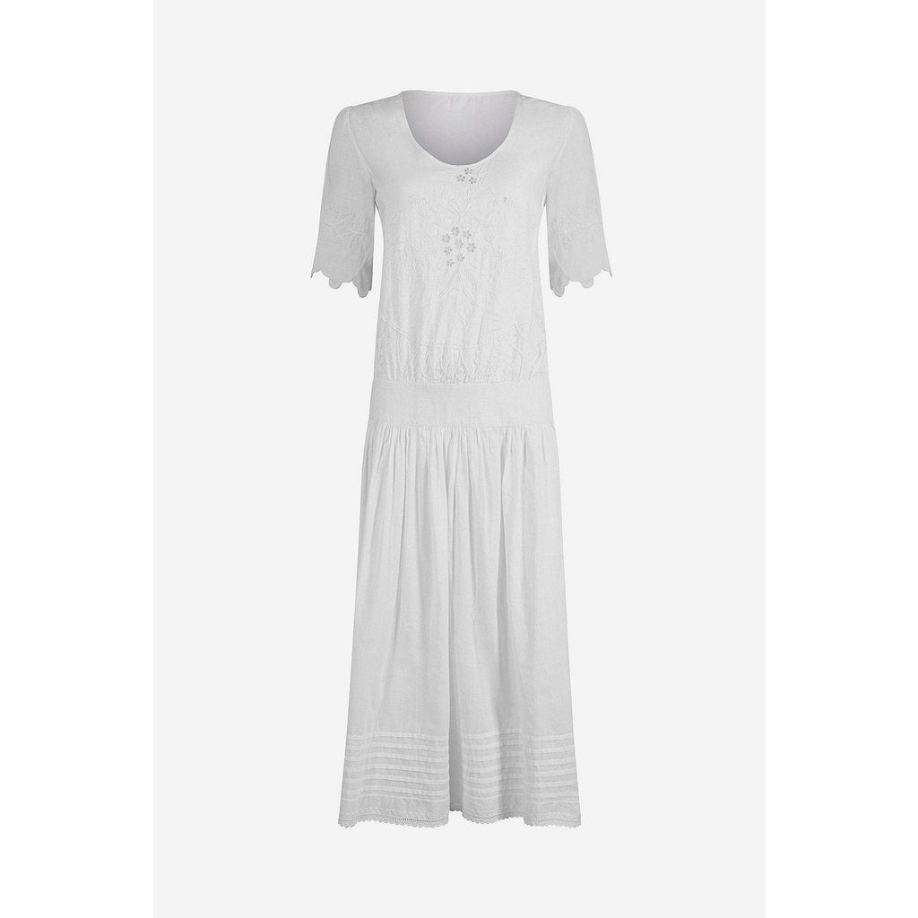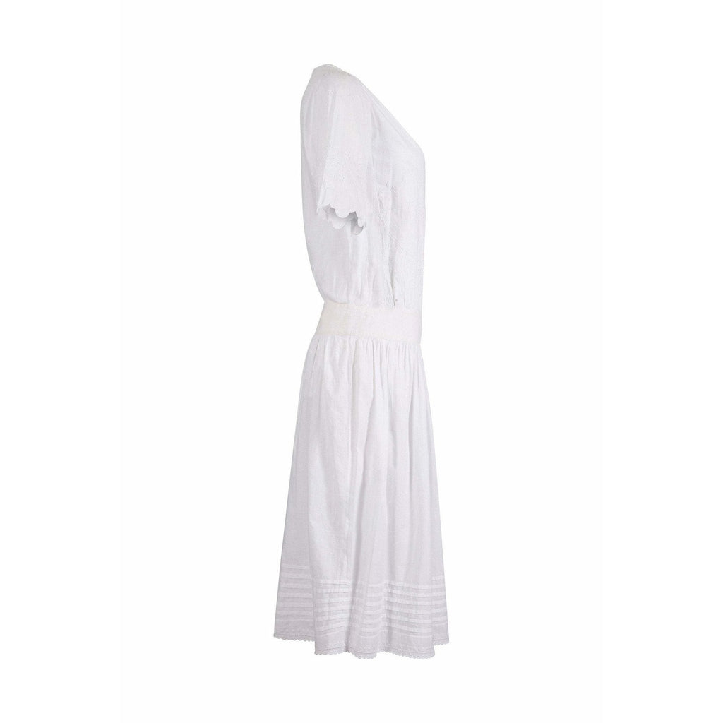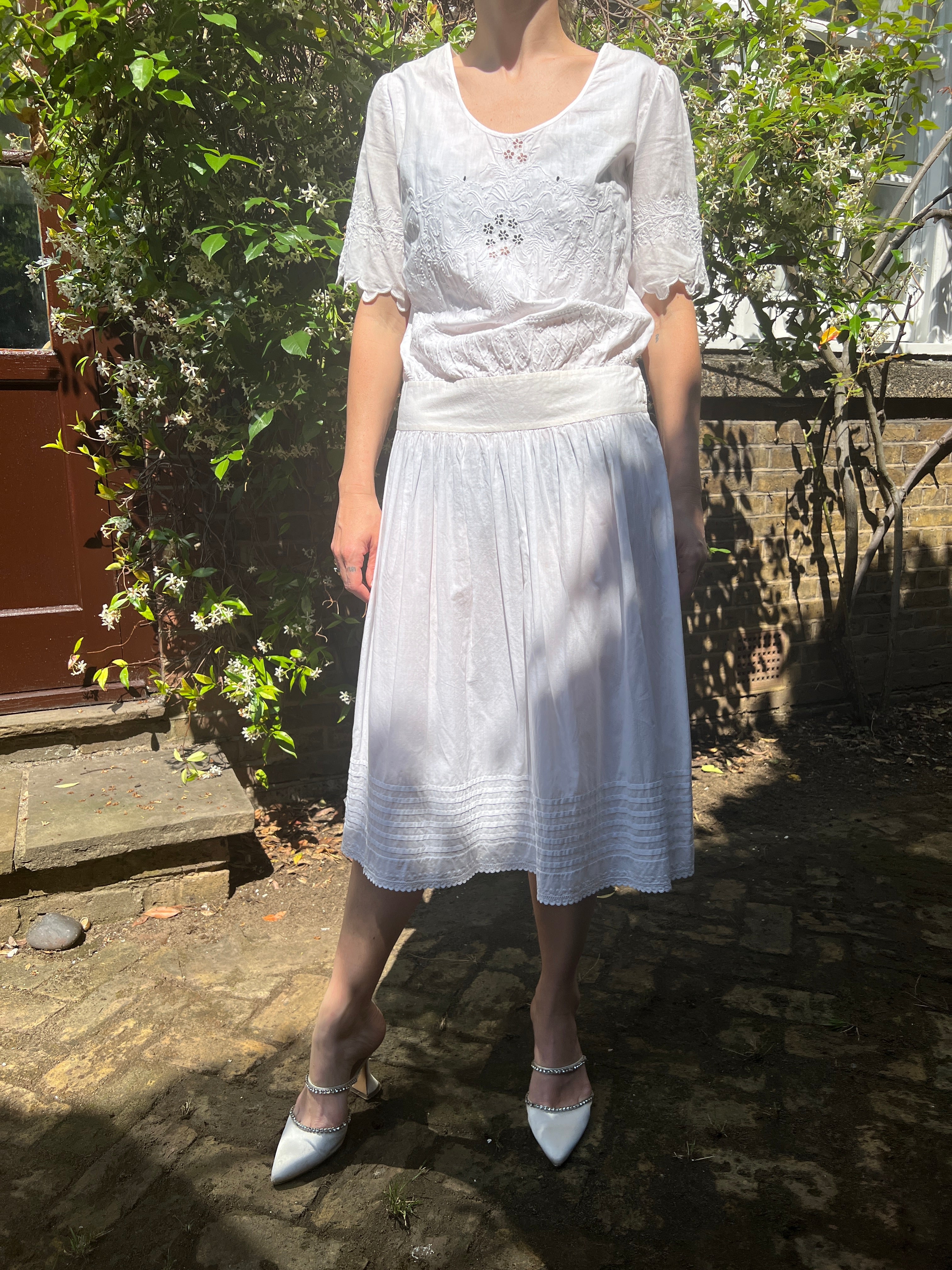 This exquisite antique 1920s hand embroidered cotton whitework tea dress is in absolutely astonishing vintage condition for a piece of this era, with no flaws to mention and would make an enchanting choice of alternative bridal wear. The dress is a simple shift cut with a wide drop waistband at the hip, a gentle scoop neckline and pretty elbow length sleeves with a scalloped trim. The soft, lightweight cotton fabric is skilfully adorned with a detailed floral motif on the bodice and sleeves, detailing flower shaped eyelets at the centre bust and neckline. The skirt is delicately gathered below the waistband and finishes at the ankle in a series of horizontal pin tucks and a dainty scalloped lace hem. Modern popper fastenings have been discretely added to the left side at some point to enable the wearer to slip into the dress more effortlessly. This beautiful piece is truly immaculate and a rare find for the discerning collector or vintage loving bride. We estimate this will fit sizes up to a UK 10-12 or US 6-8 and smaller. Our model is a UK 8-10 and 5ft 11in. (180cm) and this dress was a good fit on her.
