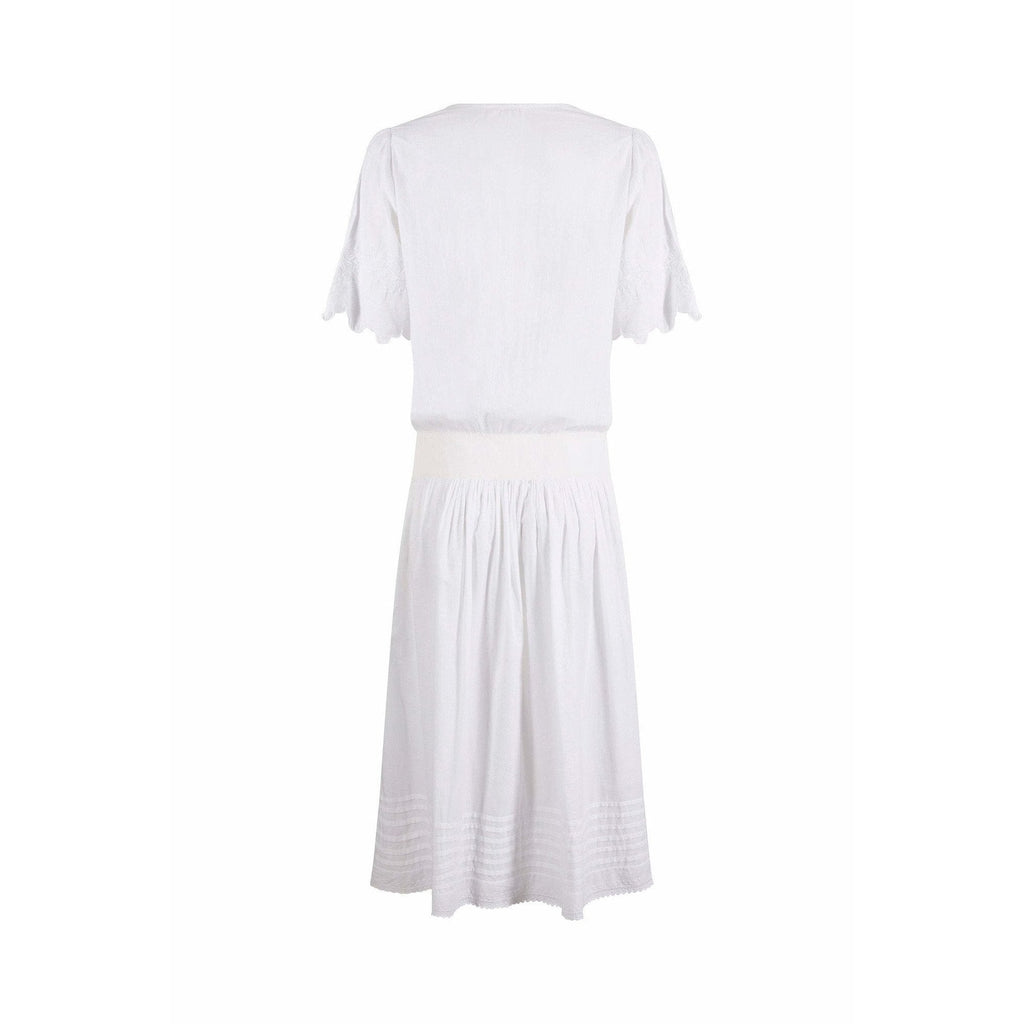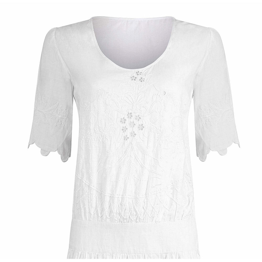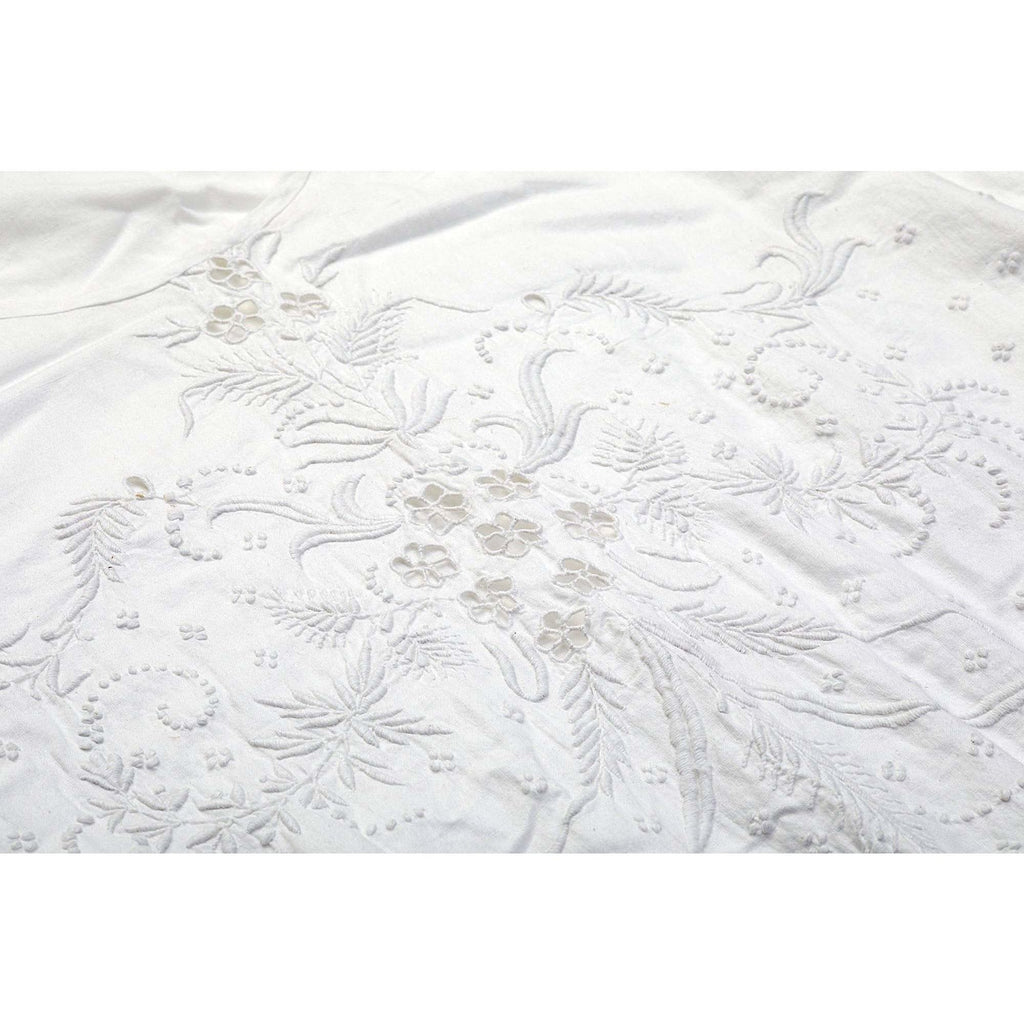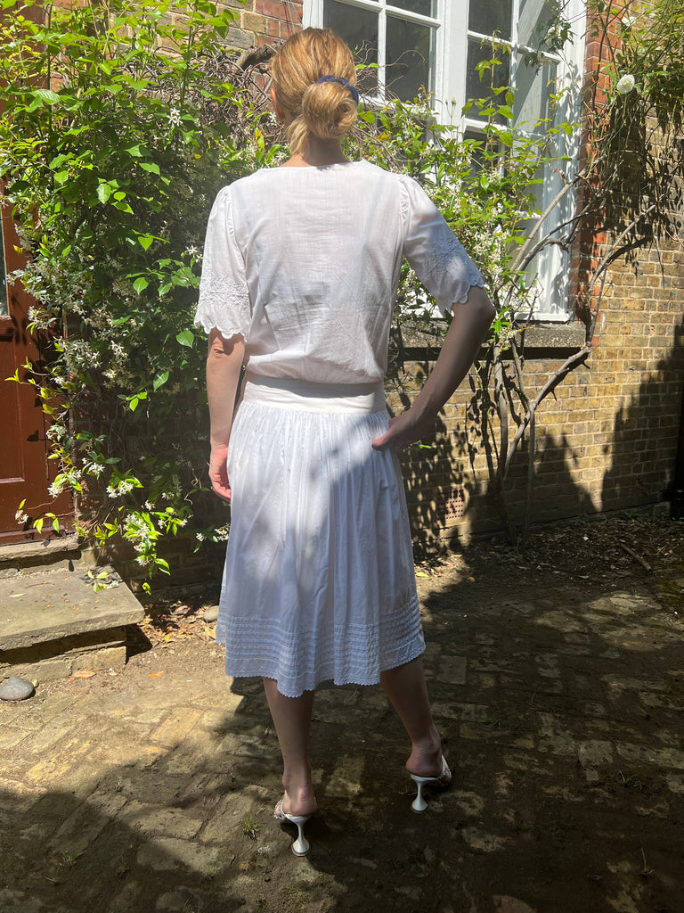 This exquisite antique 1920s hand embroidered cotton whitework tea dress is in absolutely astonishing vintage condition for a piece of this era, with no flaws to mention and would make an enchanting choice of alternative bridal wear. The dress is a simple shift cut with a wide drop waistband at the hip, a gentle scoop neckline and pretty elbow length sleeves with a scalloped trim. The soft, lightweight cotton fabric is skilfully adorned with a detailed floral motif on the bodice and sleeves, detailing flower shaped eyelets at the centre bust and neckline. The skirt is delicately gathered below the waistband and finishes at the ankle in a series of horizontal pin tucks and a dainty scalloped lace hem. Modern popper fastenings have been discretely added to the left side at some point to enable the wearer to slip into the dress more effortlessly. This beautiful piece is truly immaculate and a rare find for the discerning collector or vintage loving bride. We estimate this will fit sizes up to a UK 10-12 or US 6-8 and smaller. Our model is a UK 8-10 and 5ft 11in. (180cm) and this dress was a good fit on her.