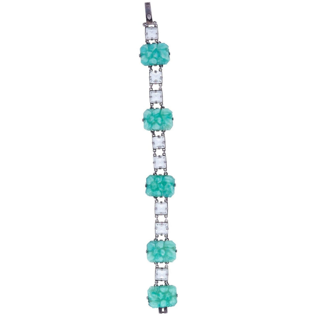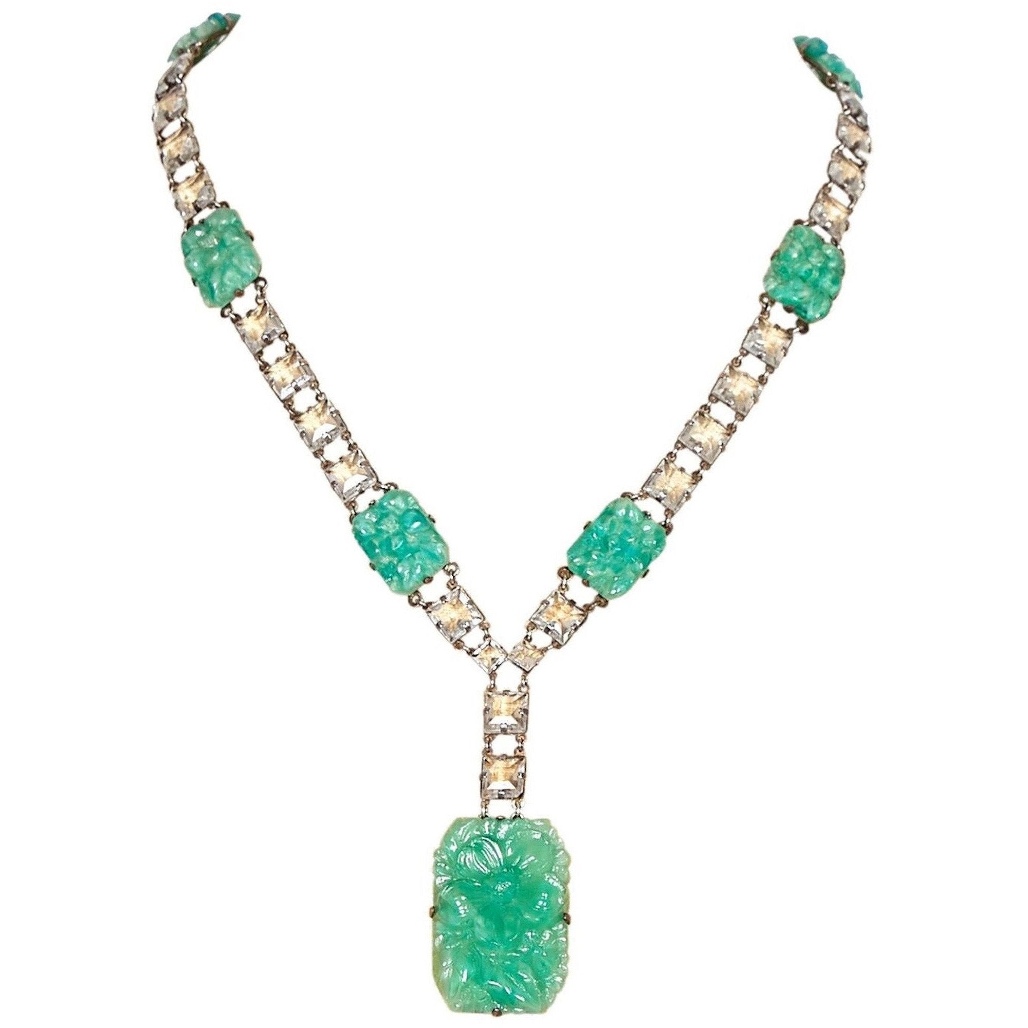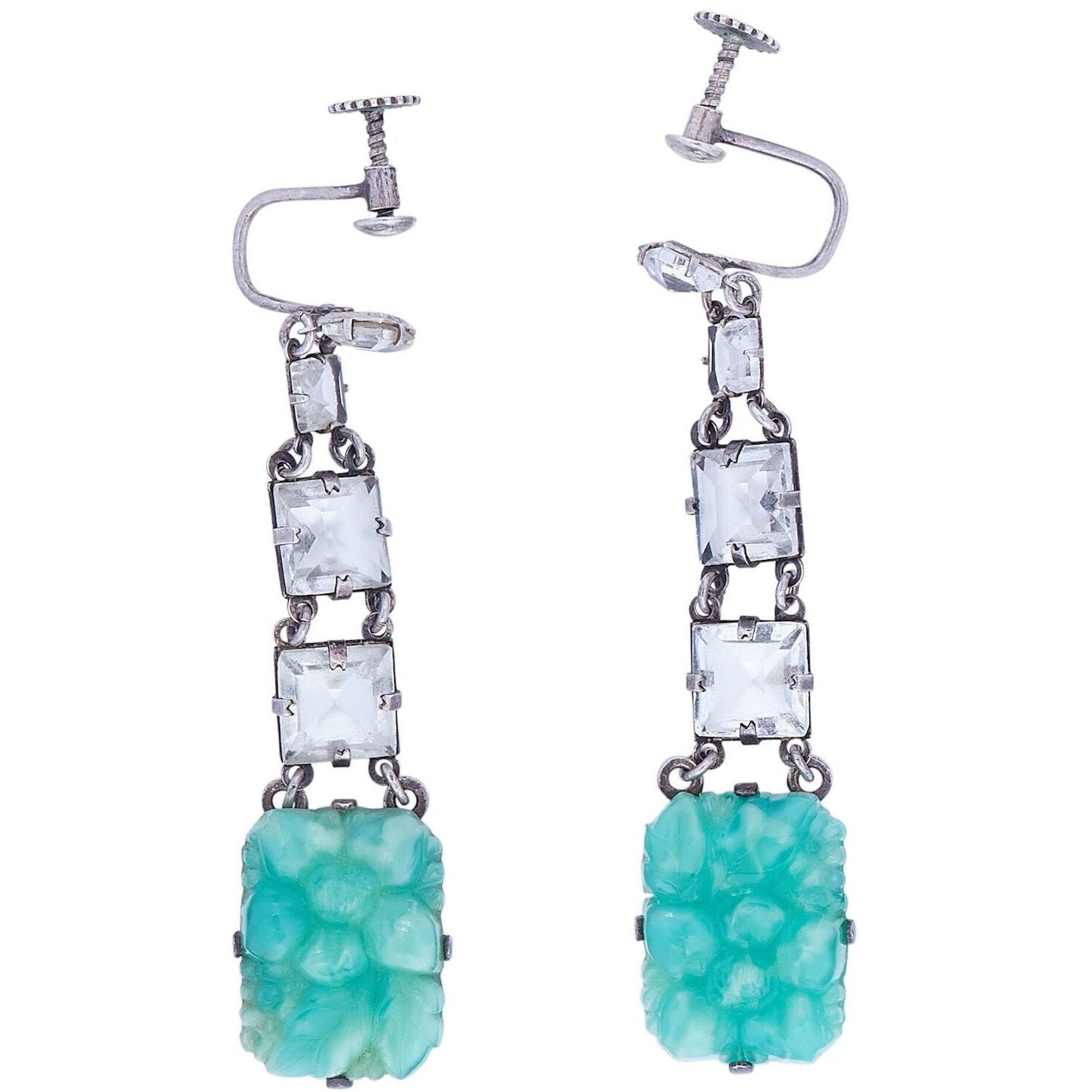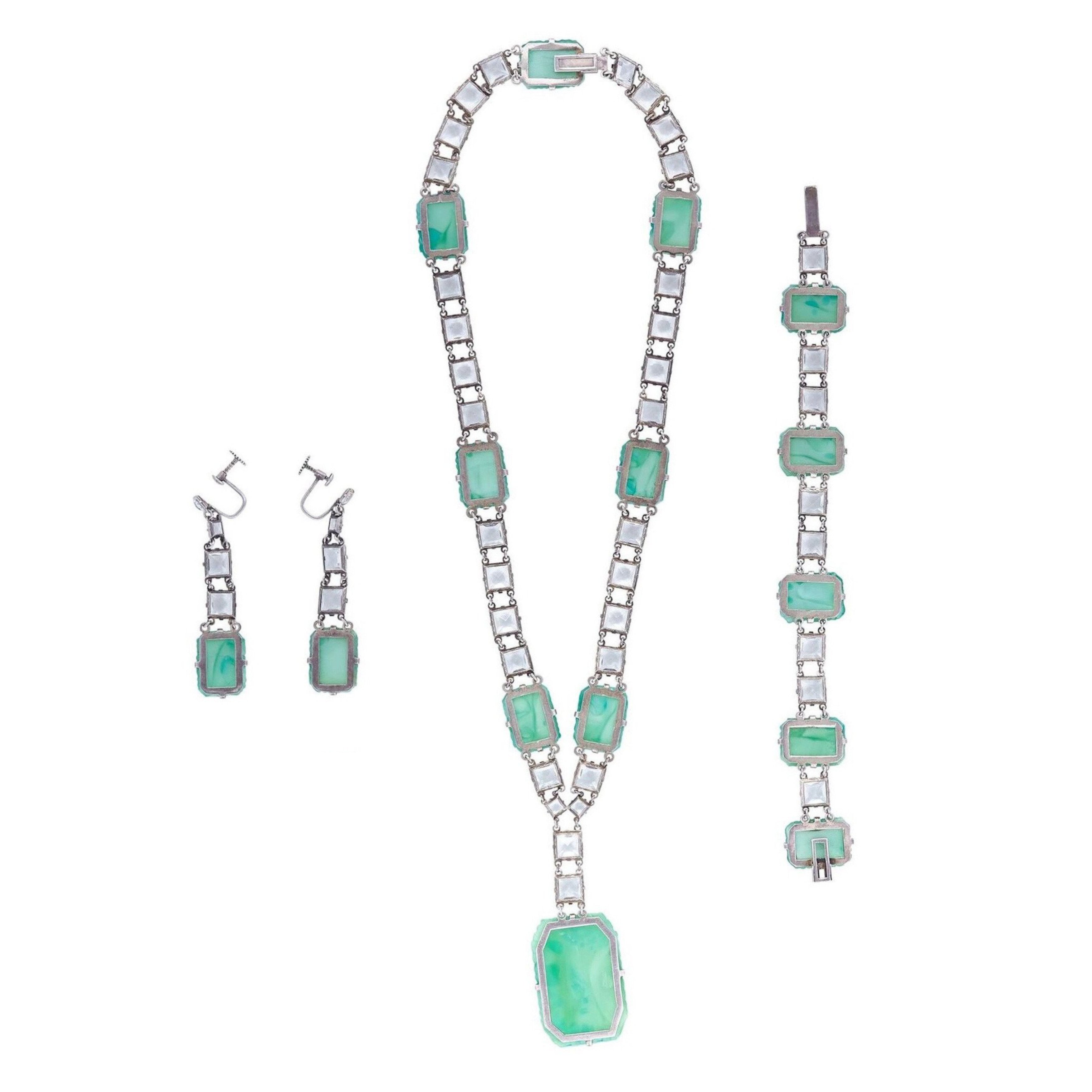 This exquisite 1930s Art Deco Peking Glass 3 piece set with prong set rock crystals is comprised of drop earrings, matching bracelet and necklace with a large drop pendant, and is in absolutely beautiful condition. Peking Glass is very collectable and was created to resemble the jade or jadeite which was so popular in the Art Deco era. This set features rectangular green Peking Glass pieces juxtaposed with square cut clear rock crystals, creating clean lines and geometric shapes that are largely prominent in Art Deco jewellery. The bracelet and earrings are set in real silver which may be 600 to 800 silver as was used in many Chinese and Japanese imports during this period. The earrings are screw backs but can be converted to wires.