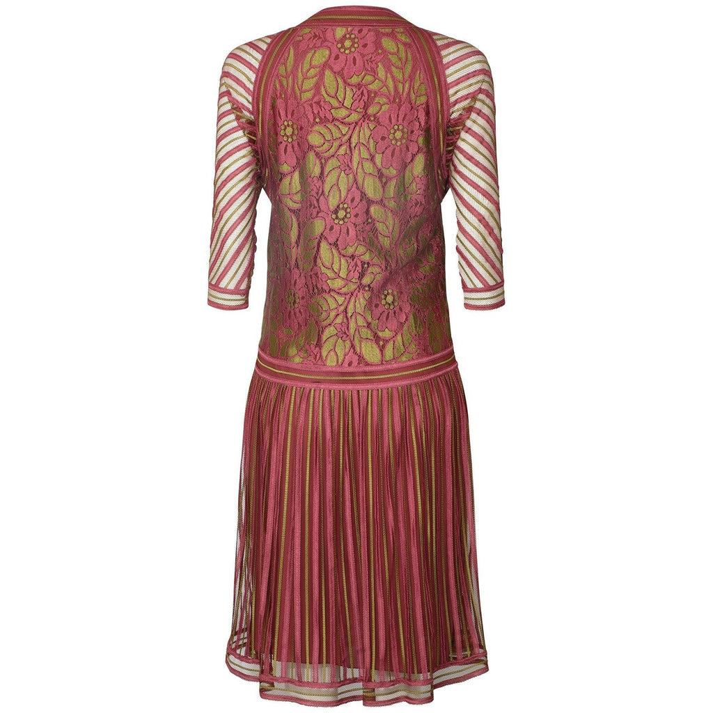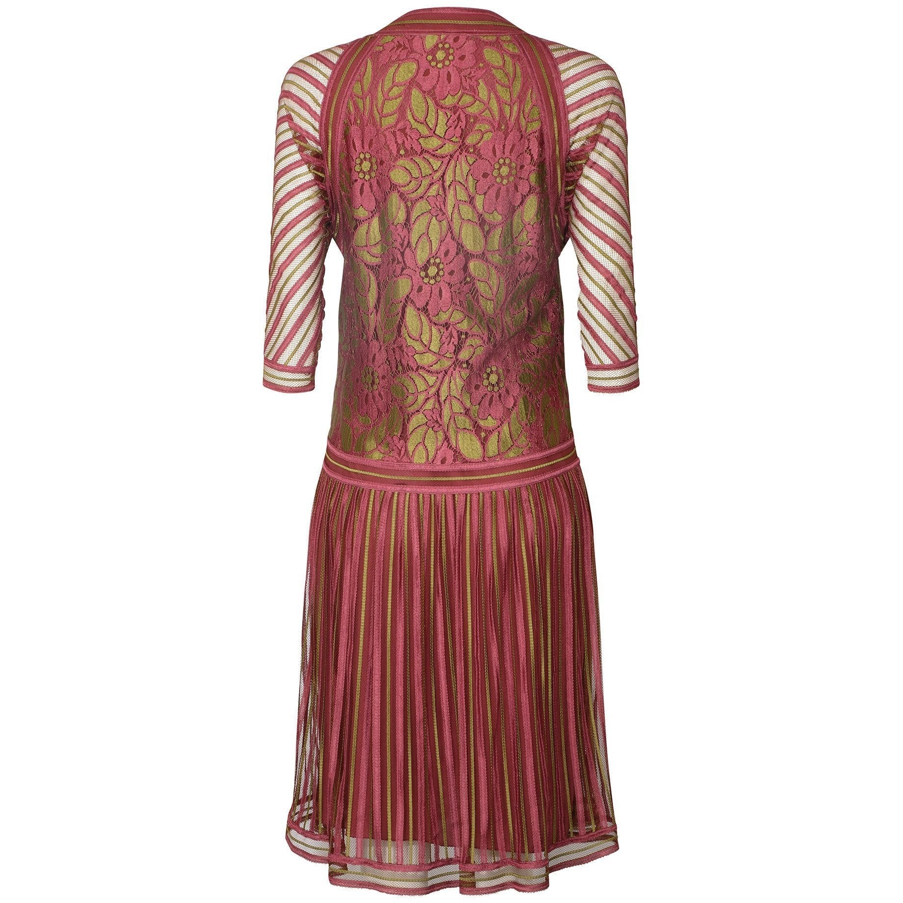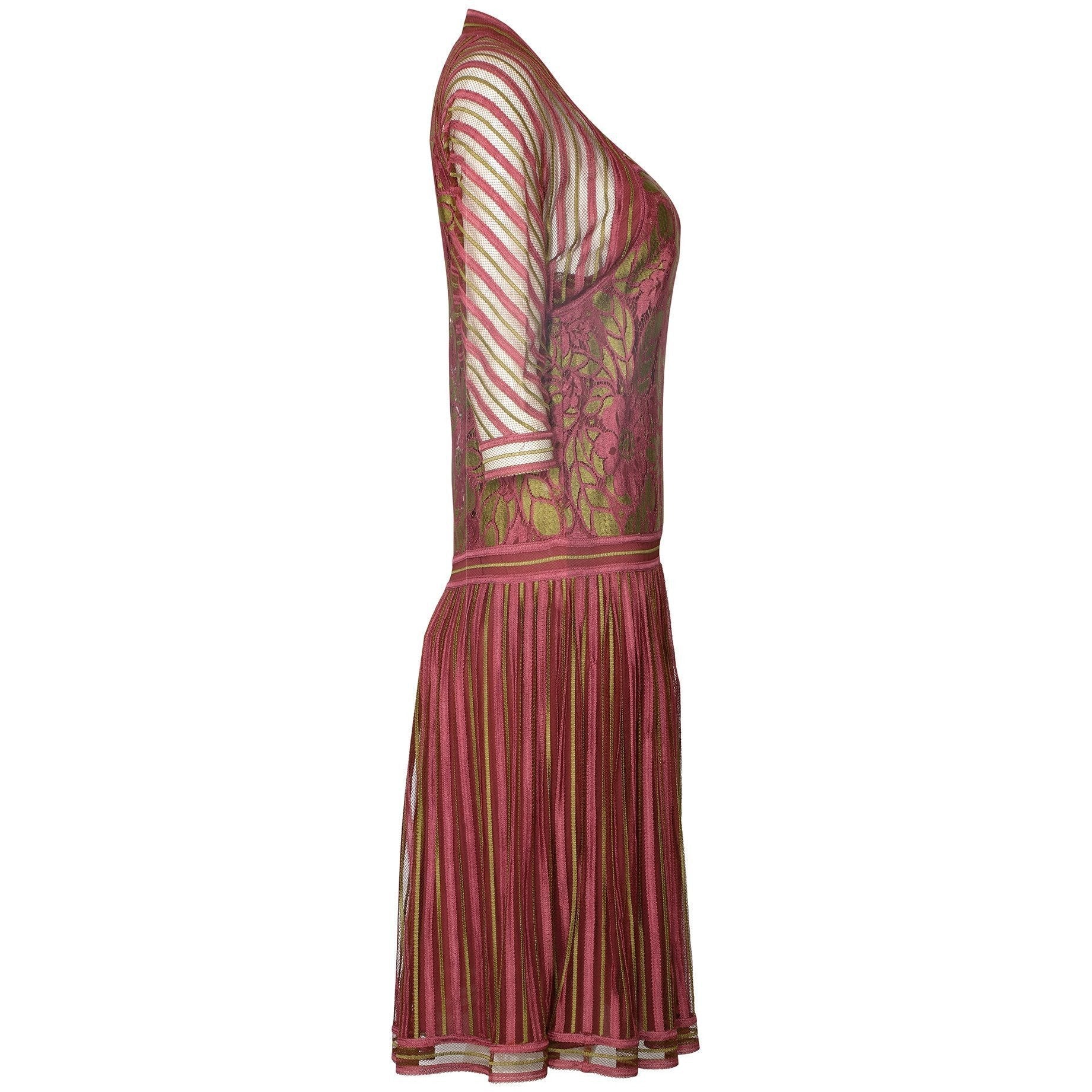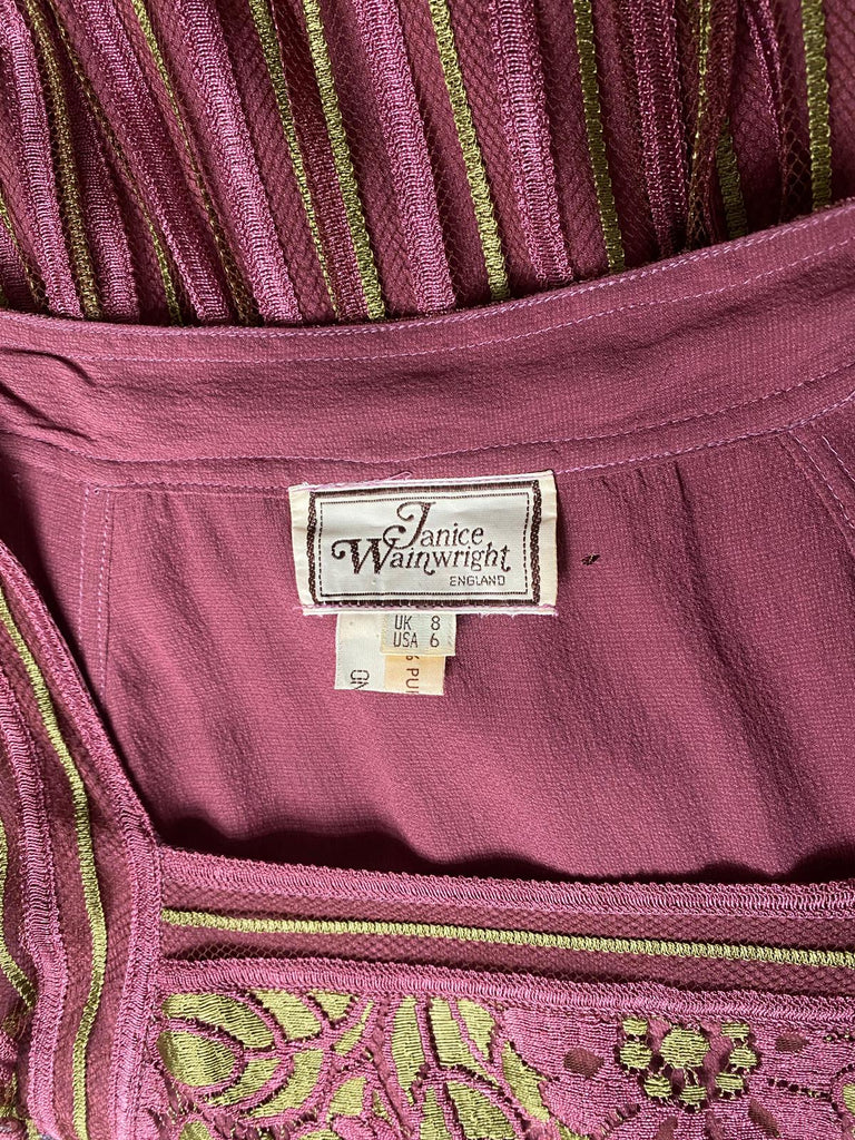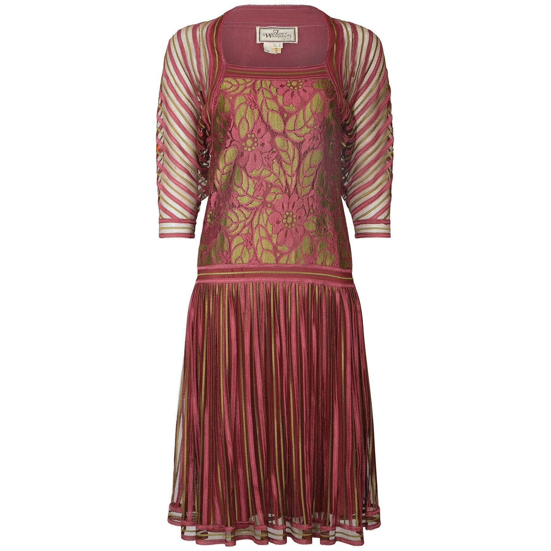 The dress is constructed from a dusky pink and greeny gold coloured fine woven ribbon silk and tulle with a floral patterned lace bodice. The straight cut of the dress with no defined waist and low slung skirt emulates the 1920s flapper era. The sleeves are a dolman style. Under this exterior, the dress is lined in the body in a matching dusky pink silk-crepe with the sleeves and upper shoulders left unlined. There are no fastenings on this dress and it simply slips over the head to wear. In excellent vintage condition with no faults of any note - looks unworn save for a tiny hole in the internal lining near to the designer label. This of course cannot be seen when worn. Labelled a vintage UK size 8, we believe this would also suit sizes smaller and US sizes 2-4.