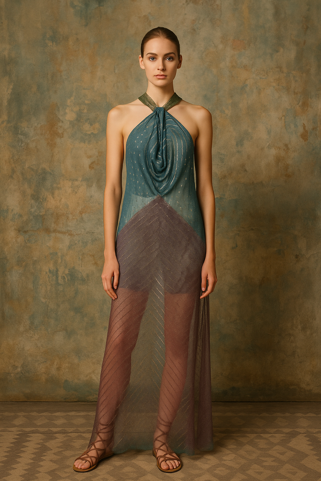This original 20s Assuit tri-colour dress features a unique and elegant halter neck design, complete with a cowl neck and a long silhouette. Its straight fit offers an Effortless elegant fit. A true one of piece With historical nuance.