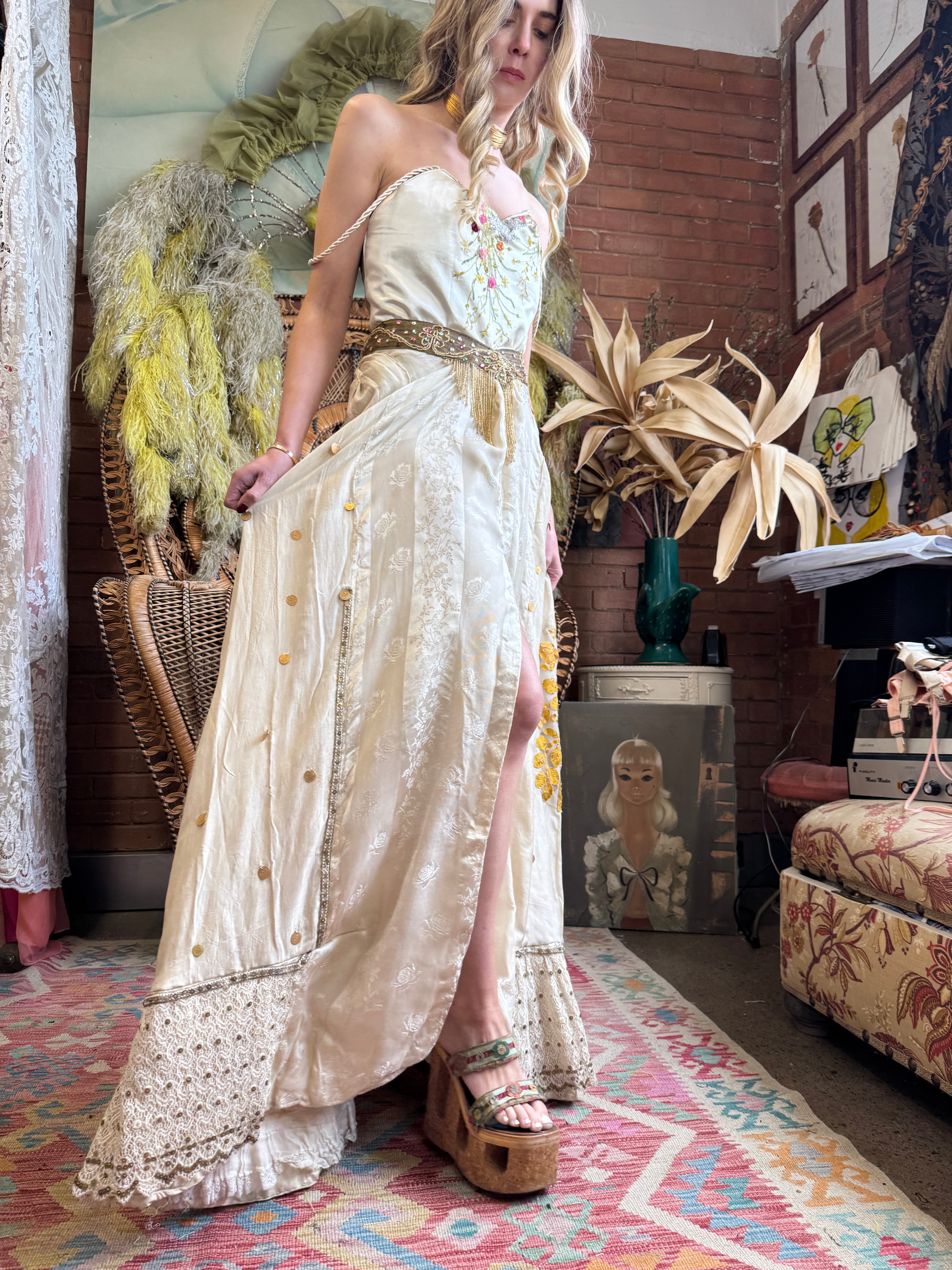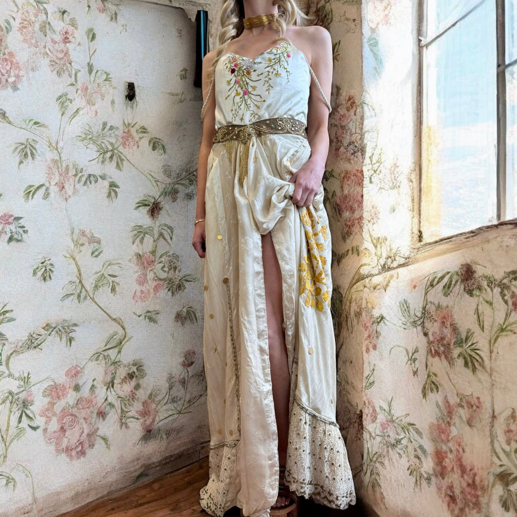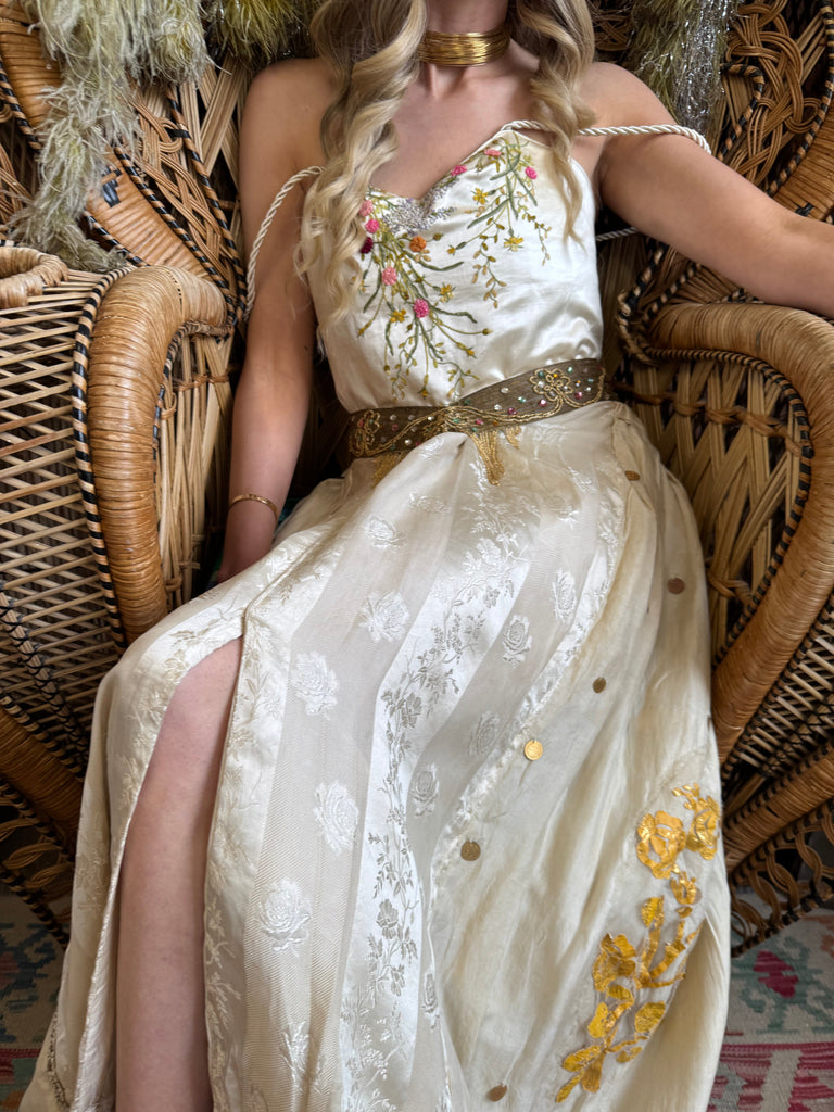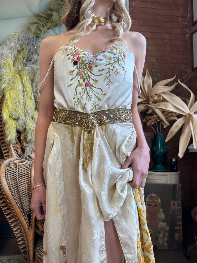 Experience true elegance and history with  our 20s embroidered reworked beaded dress. This reworked original 1920s bustier dress features hand-made florals, a 20s beaded tasseled belt, and a lace and sequin hem. With a leg slit on the front and back hooks, this dress is perfect for a summer party.