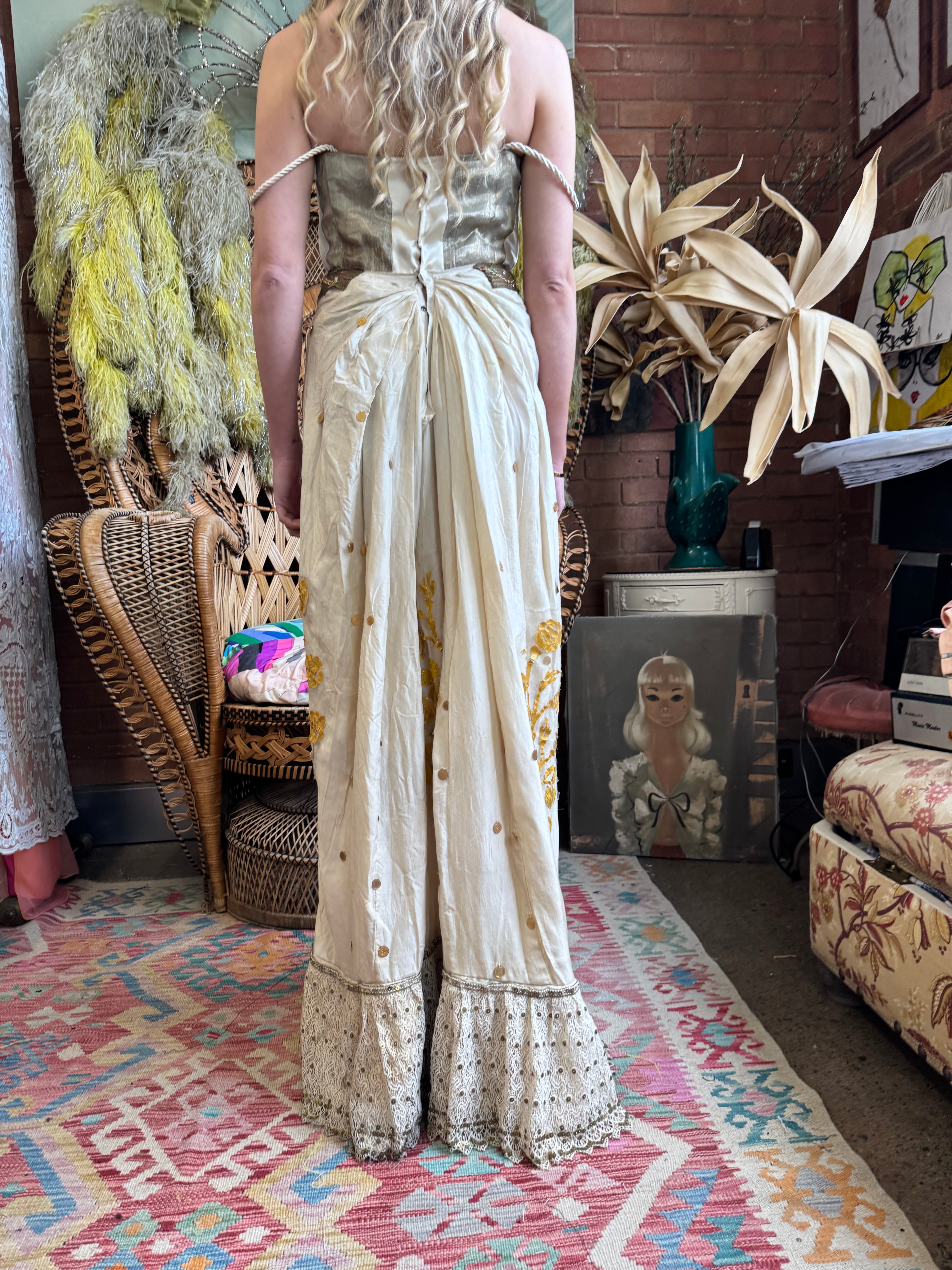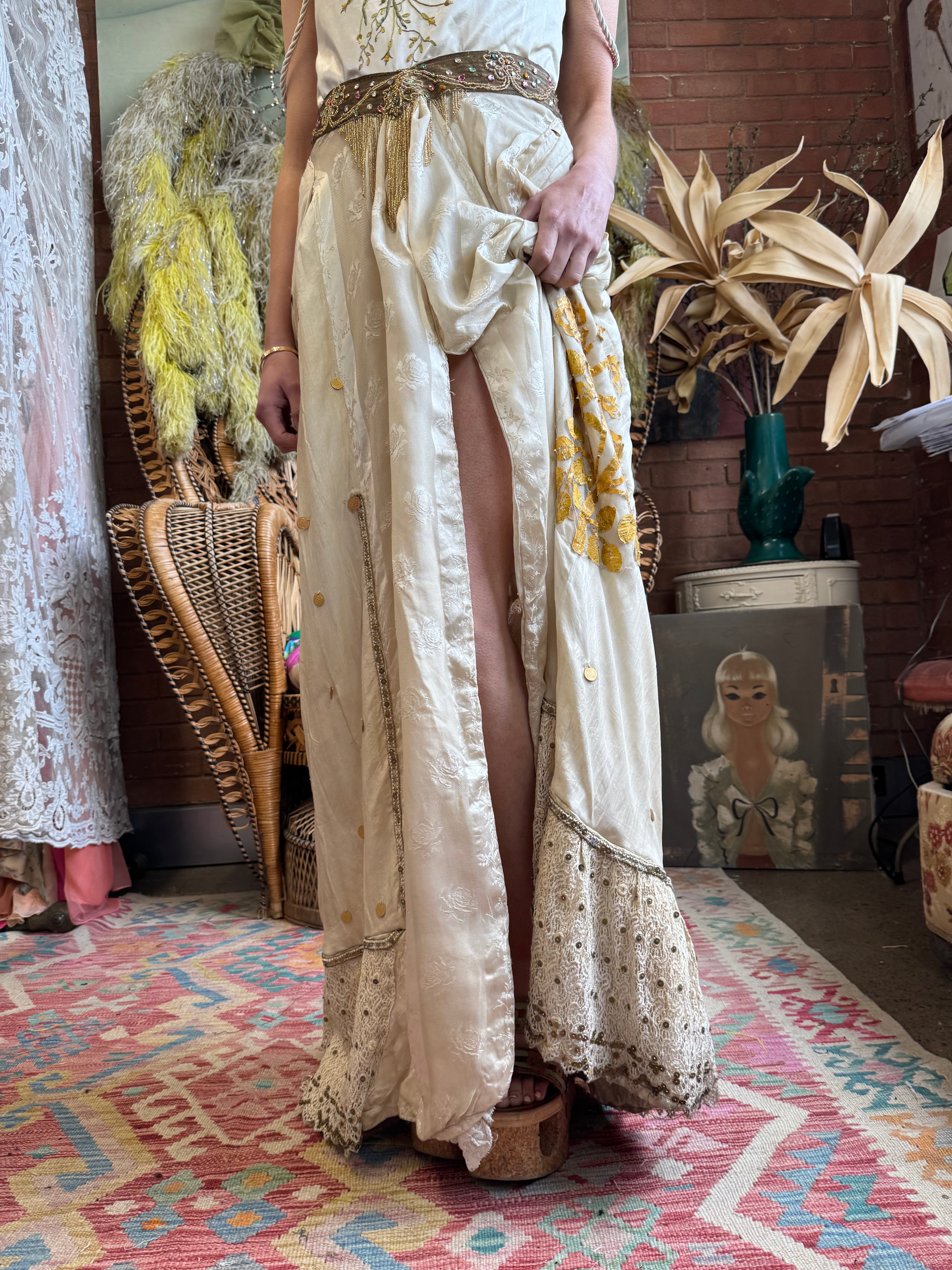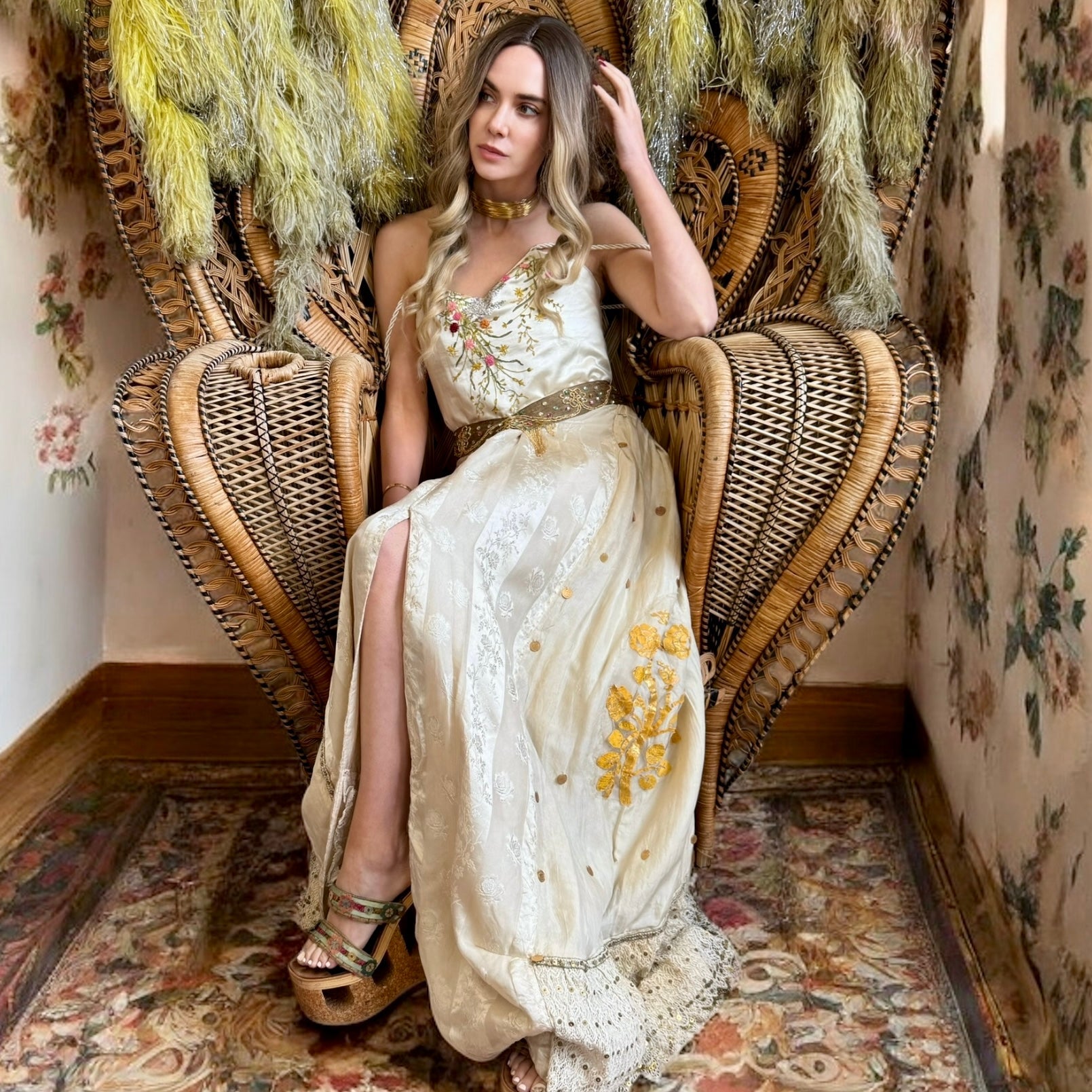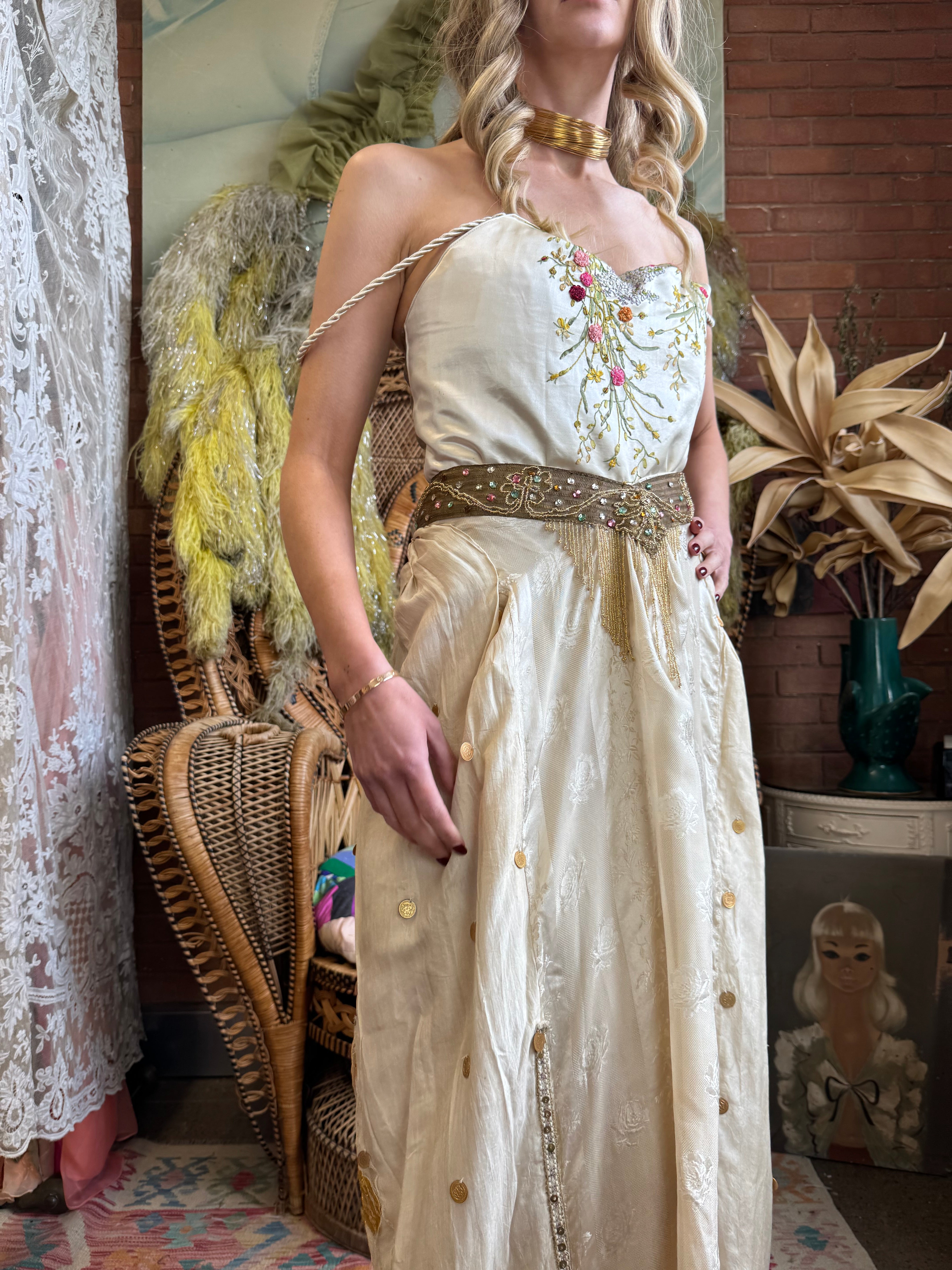Experience true elegance and history with  our 20s embroidered reworked beaded dress. This reworked original 1920s bustier dress features hand-made florals, a 20s beaded tasseled belt, and a lace and sequin hem. With a leg slit on the front and back hooks, this dress is perfect for a summer party.