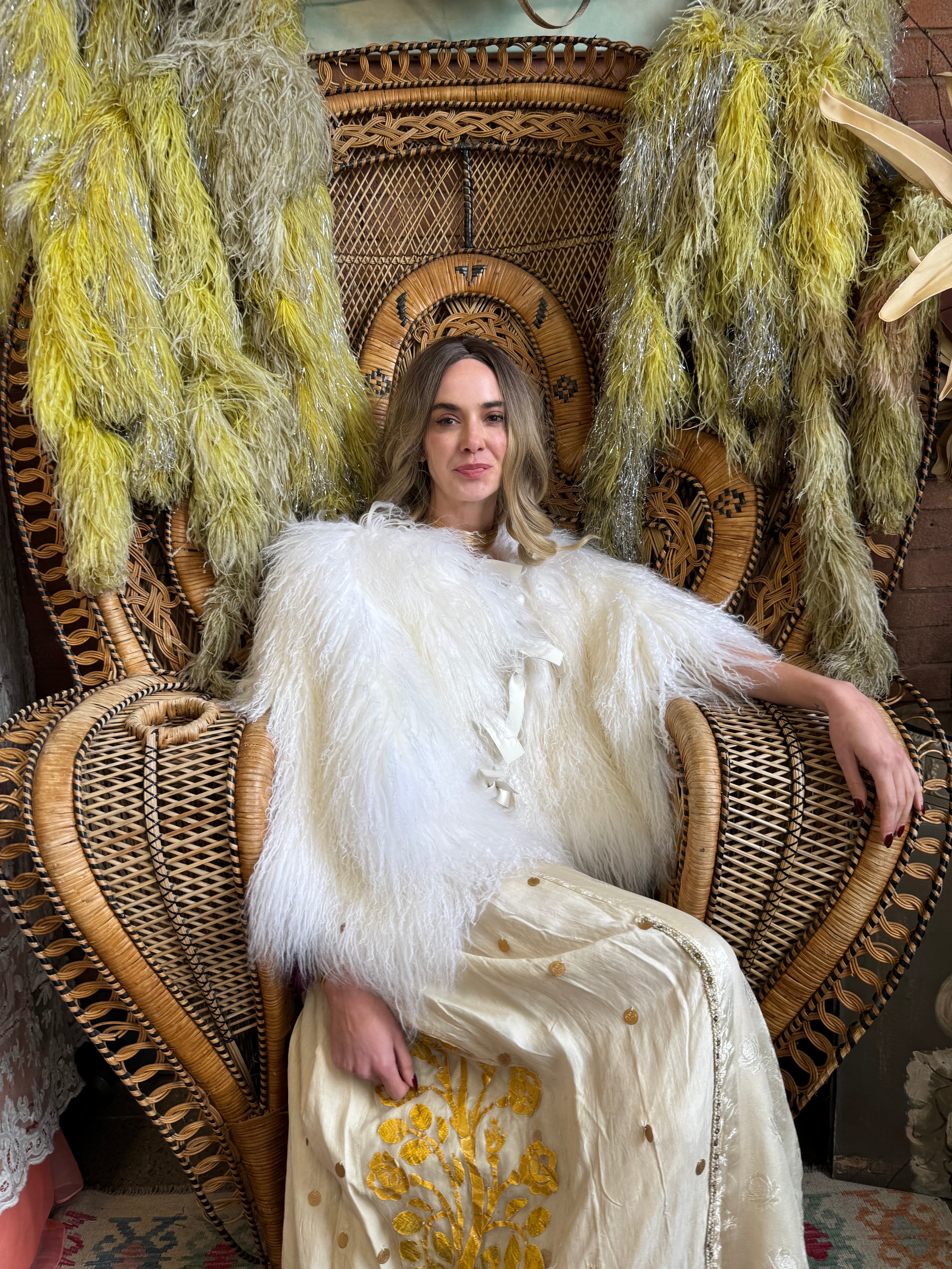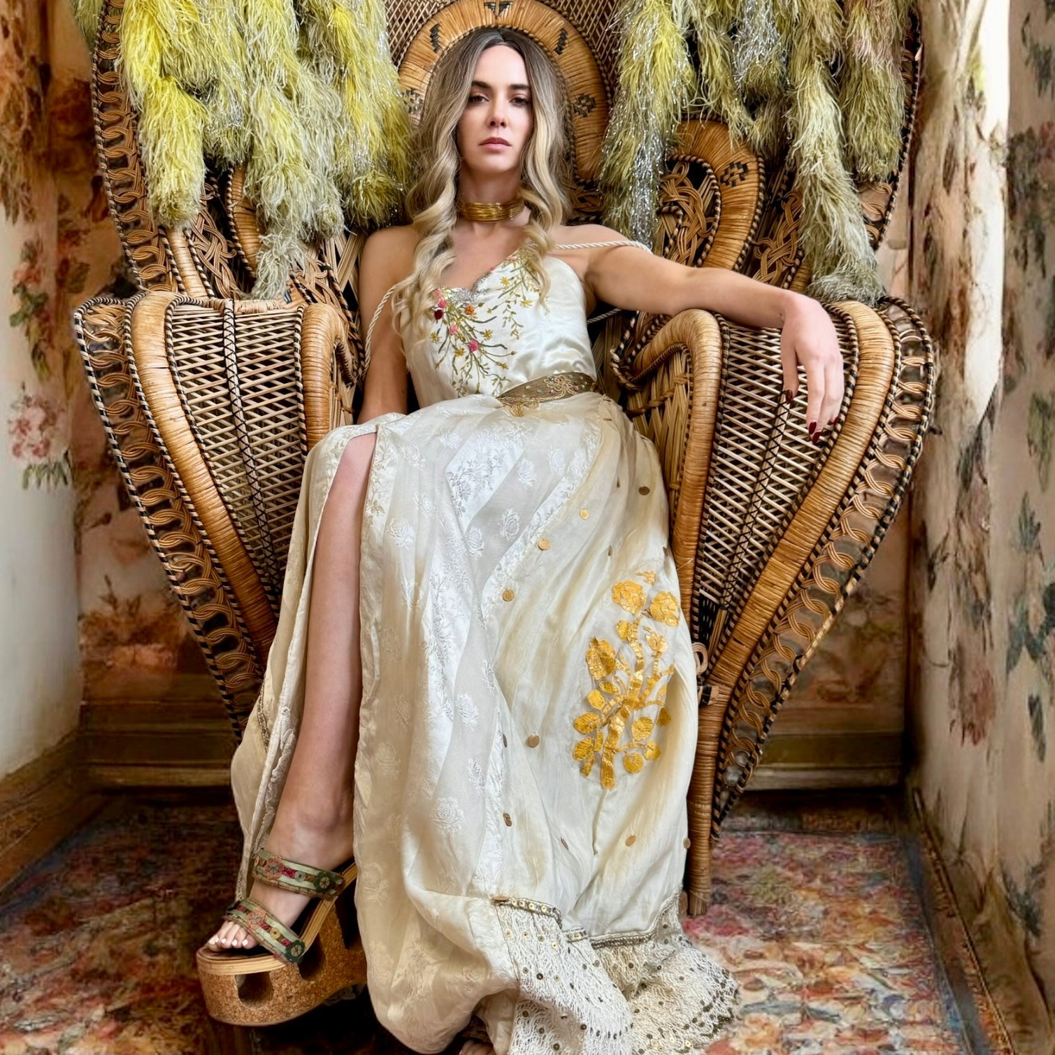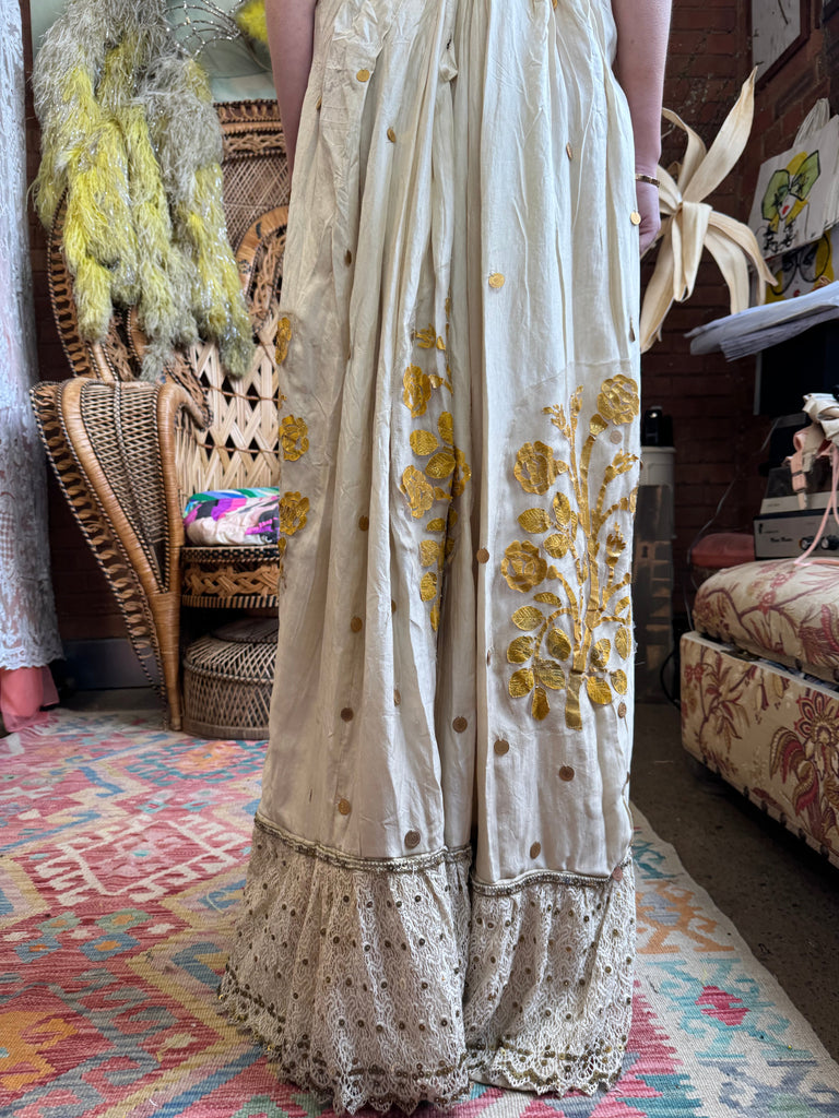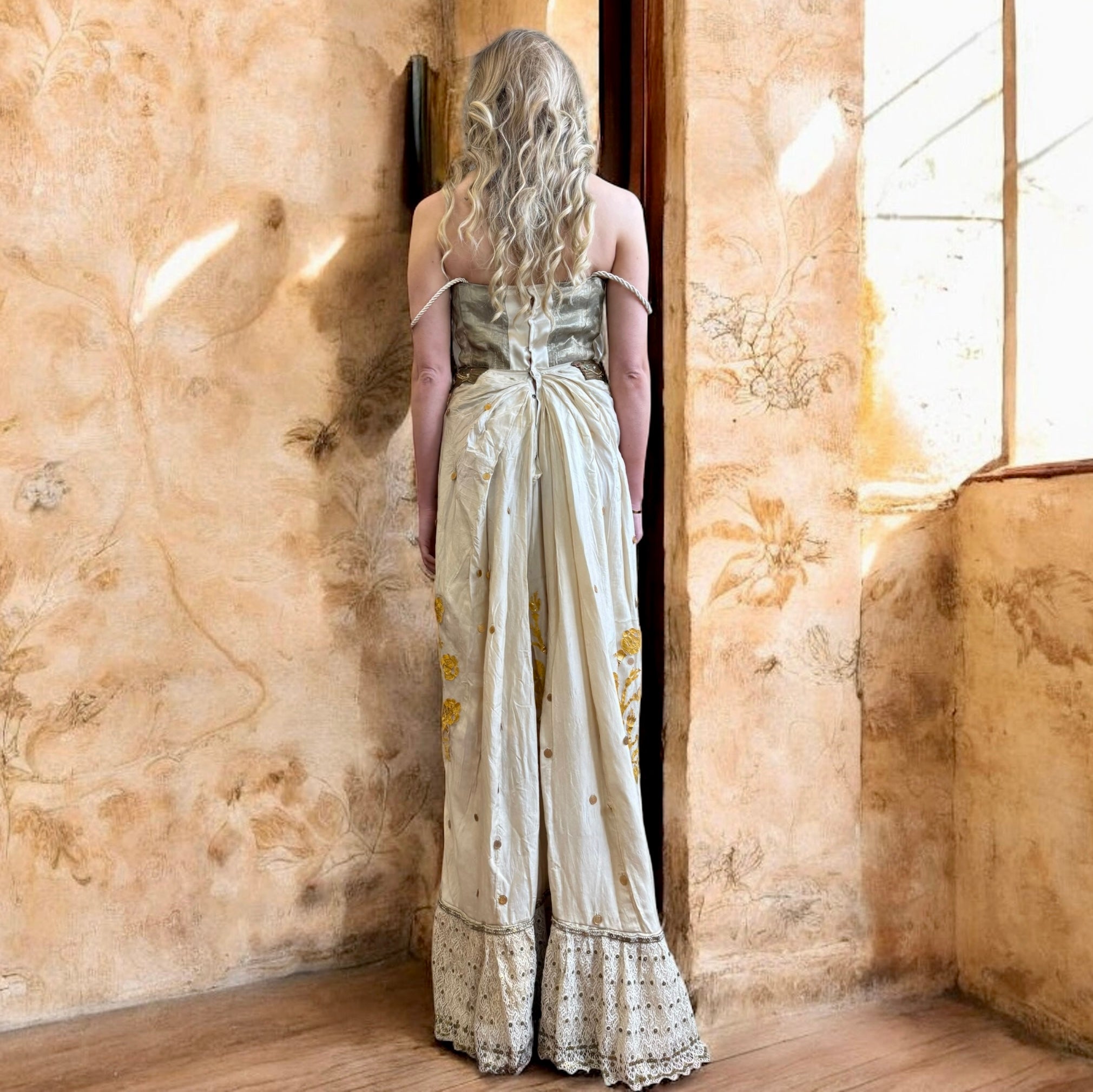 Experience true elegance and history with  our 20s embroidered reworked beaded dress. This reworked original 1920s bustier dress features hand-made florals, a 20s beaded tasseled belt, and a lace and sequin hem. With a leg slit on the front and back hooks, this dress is perfect for a summer party.