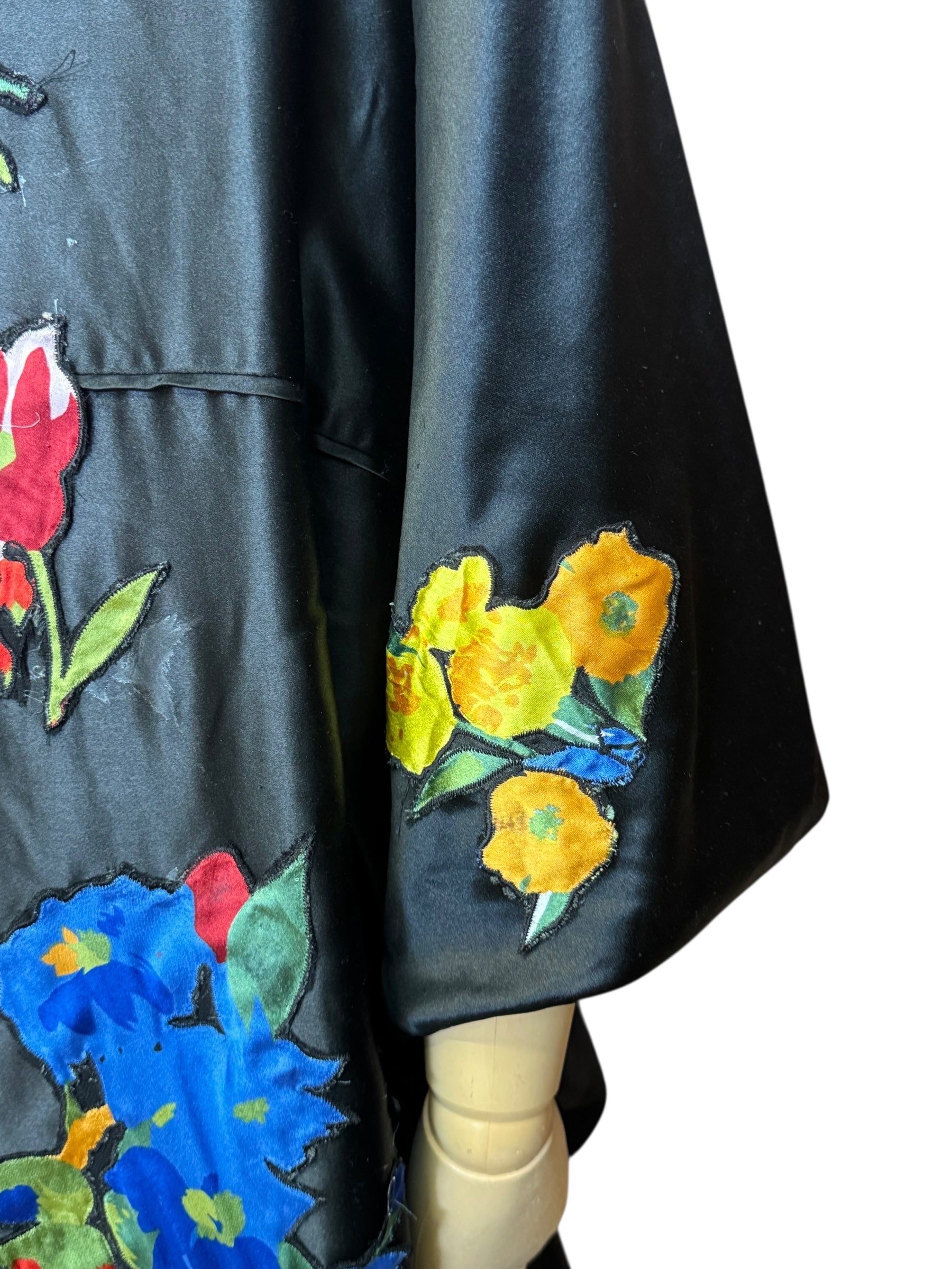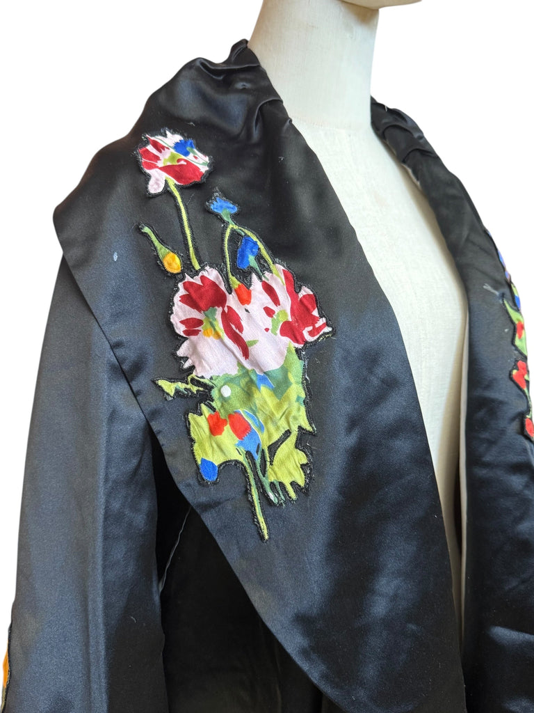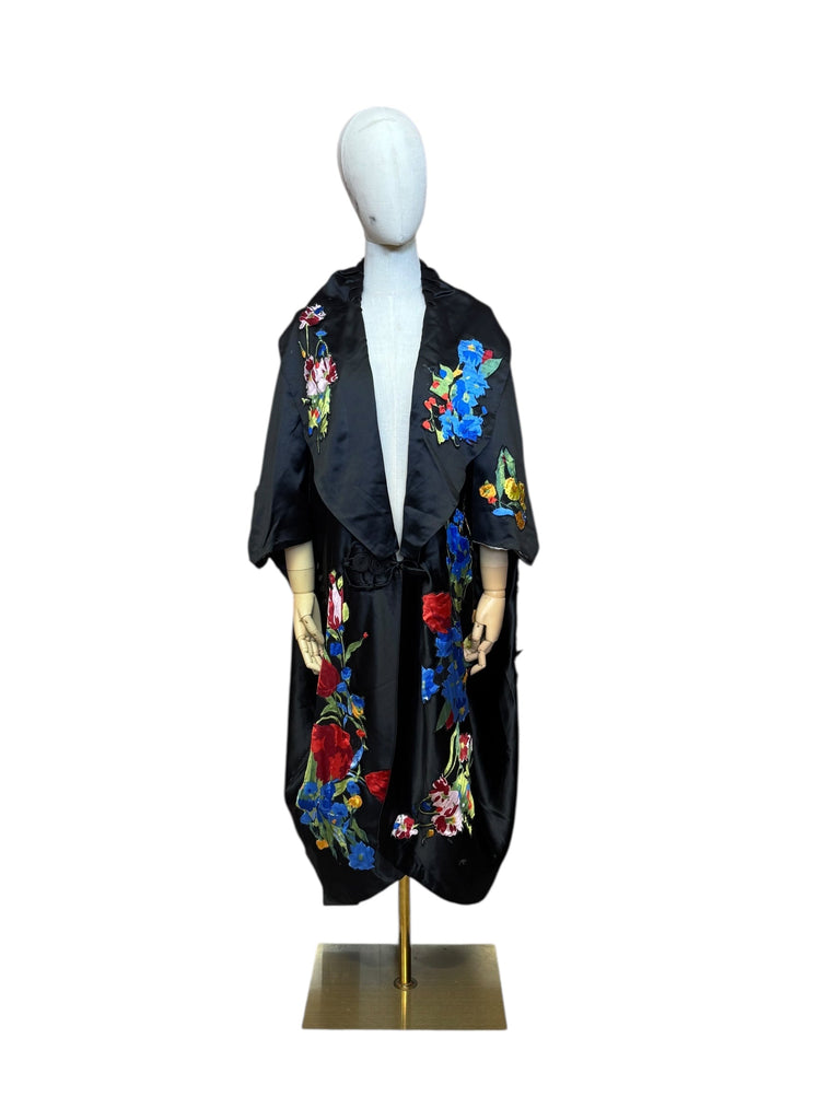 Experience true elegance with this 20s silk black cocoon floral Opera coat. This one of a kind Opera coat features a curved shoulder, large lapel and collar, and silk buttons. The silk lining adds a luxurious touch to this dramatic vintage piece.