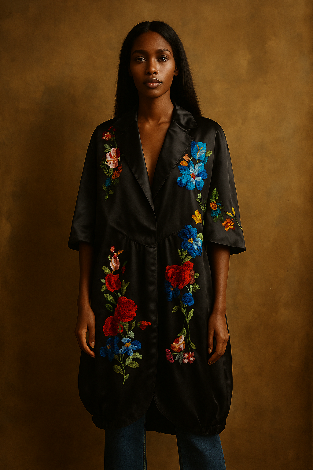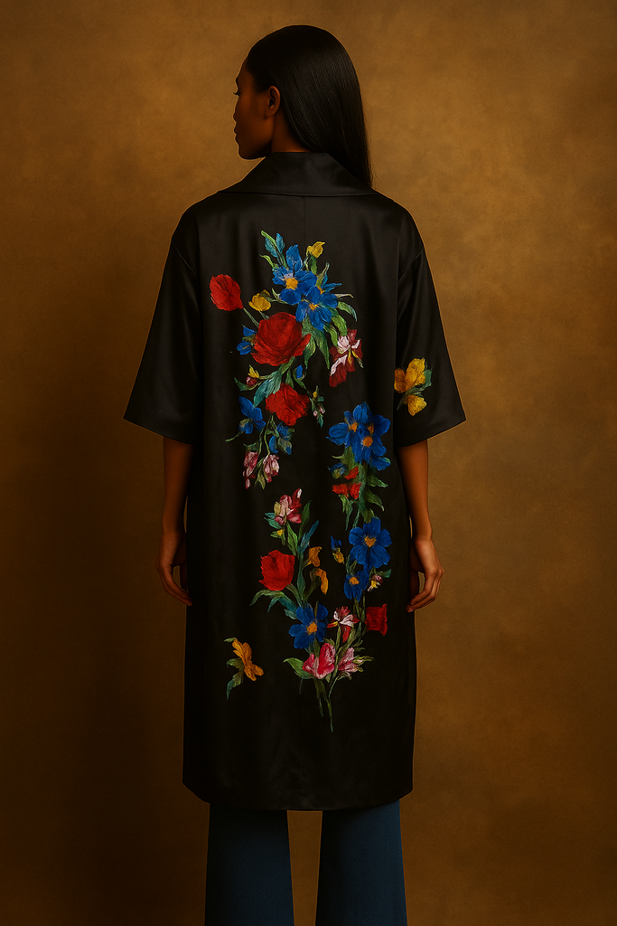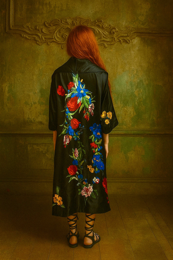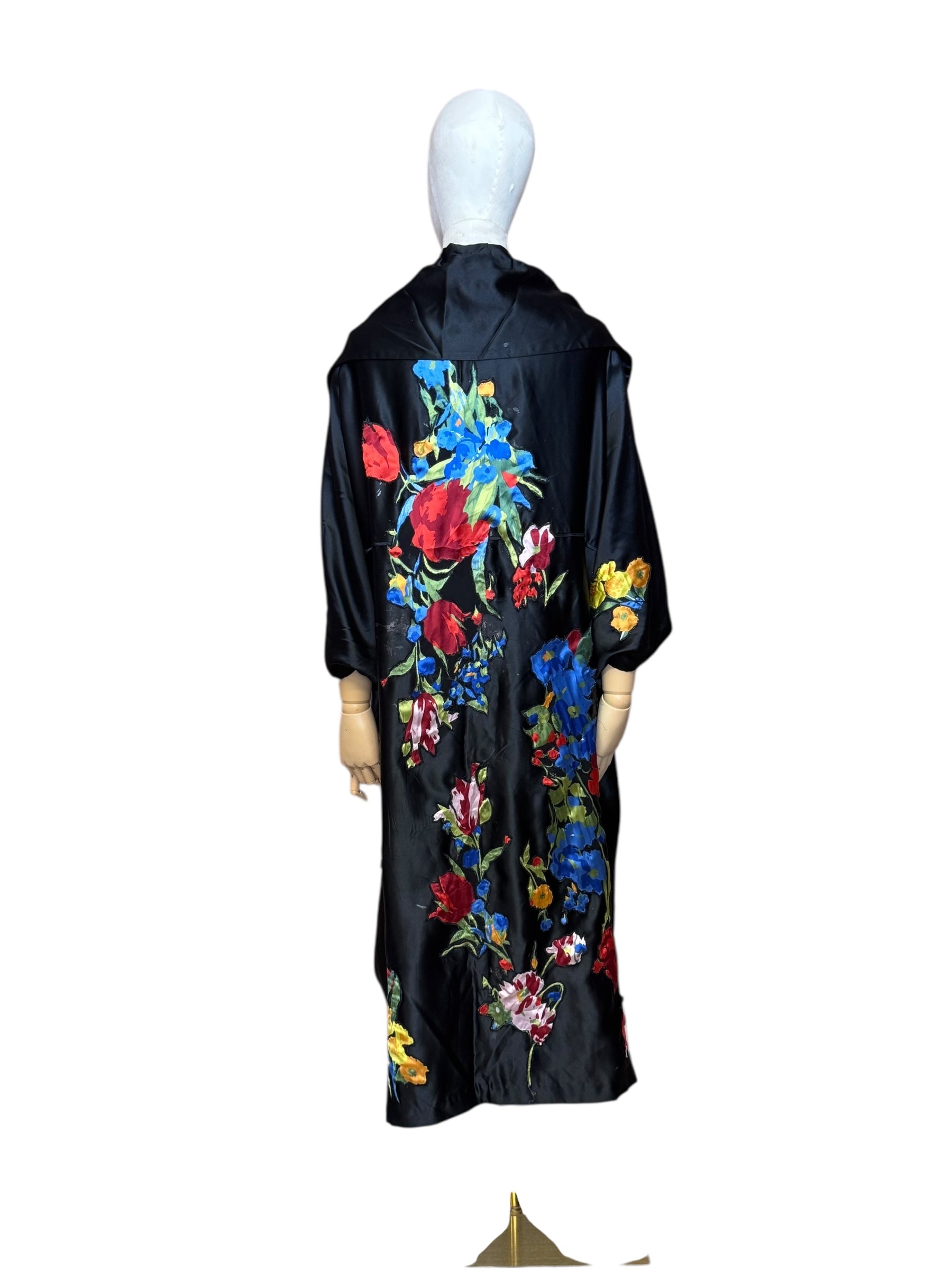 Experience true elegance with this 20s silk black cocoon floral Opera coat. This one of a kind Opera coat features a curved shoulder, large lapel and collar, and silk buttons. The silk lining adds a luxurious touch to this dramatic vintage piece.