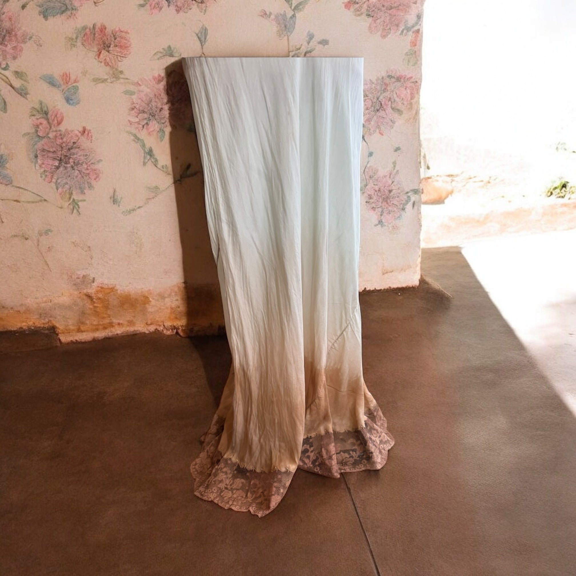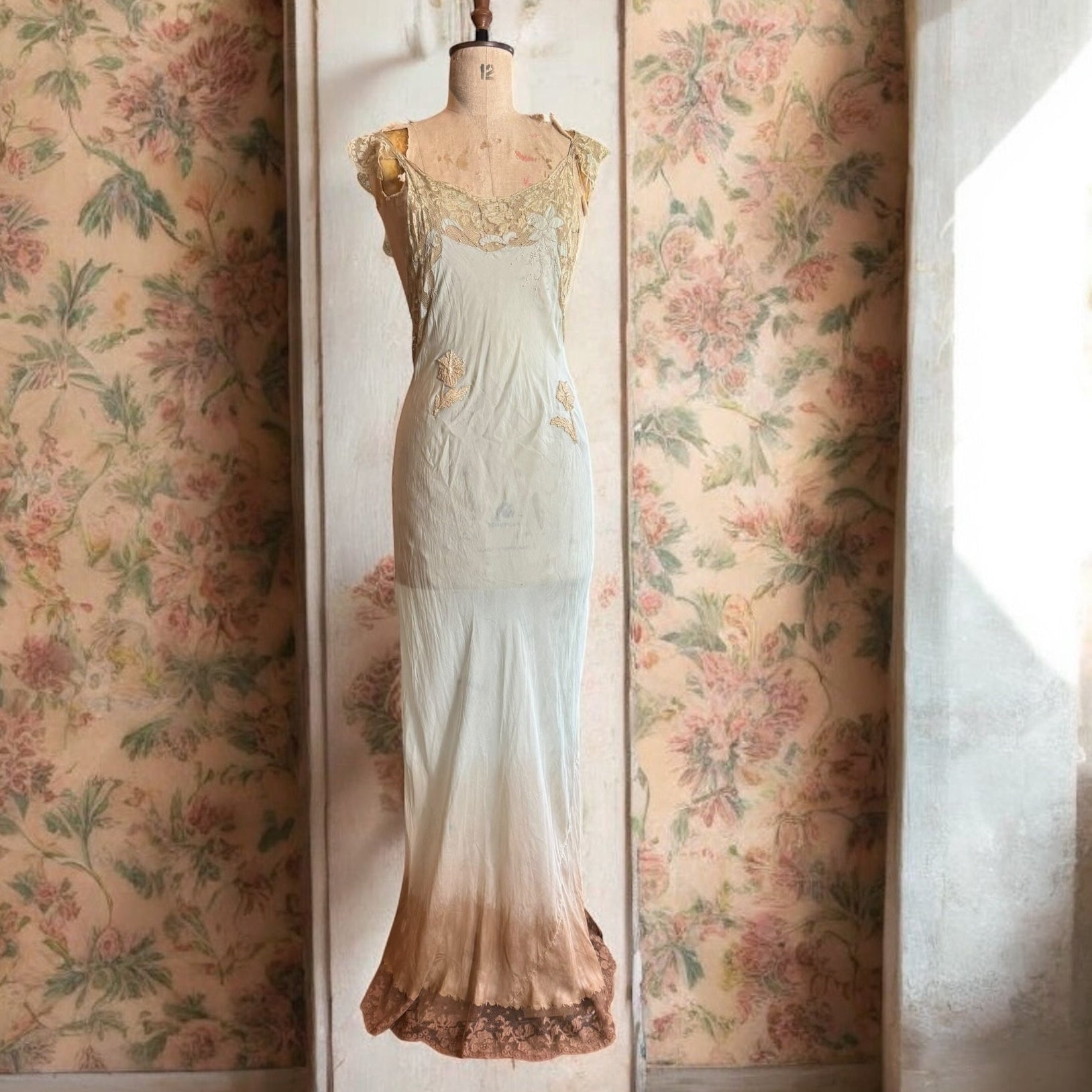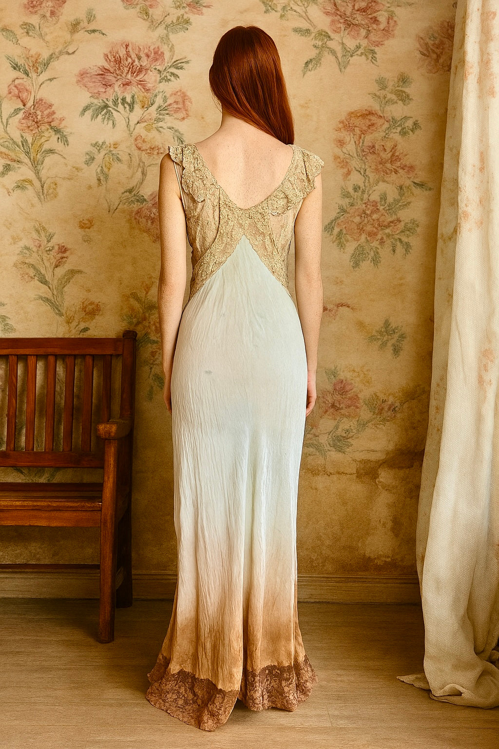 This unique 1920s silk and lace bias-cut dress has been expertly reworked and hand-dyed in a delicate light green, with a distinctive brown dip-dye effect creating an elegant ombré finish. Its vintage craftsmanship and flowing silhouette make it an exceptional choice for transitioning effortlessly from day to evening wear.