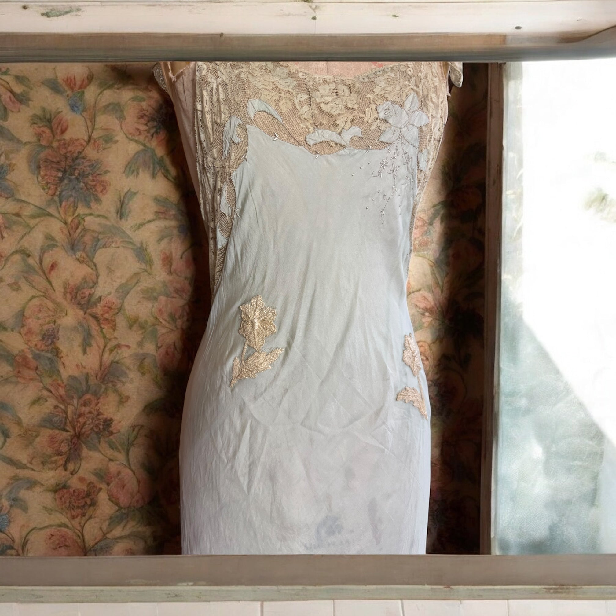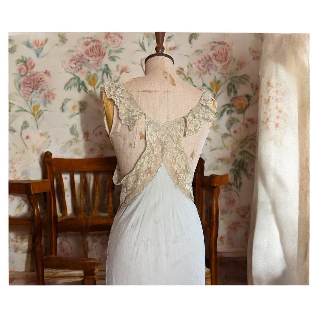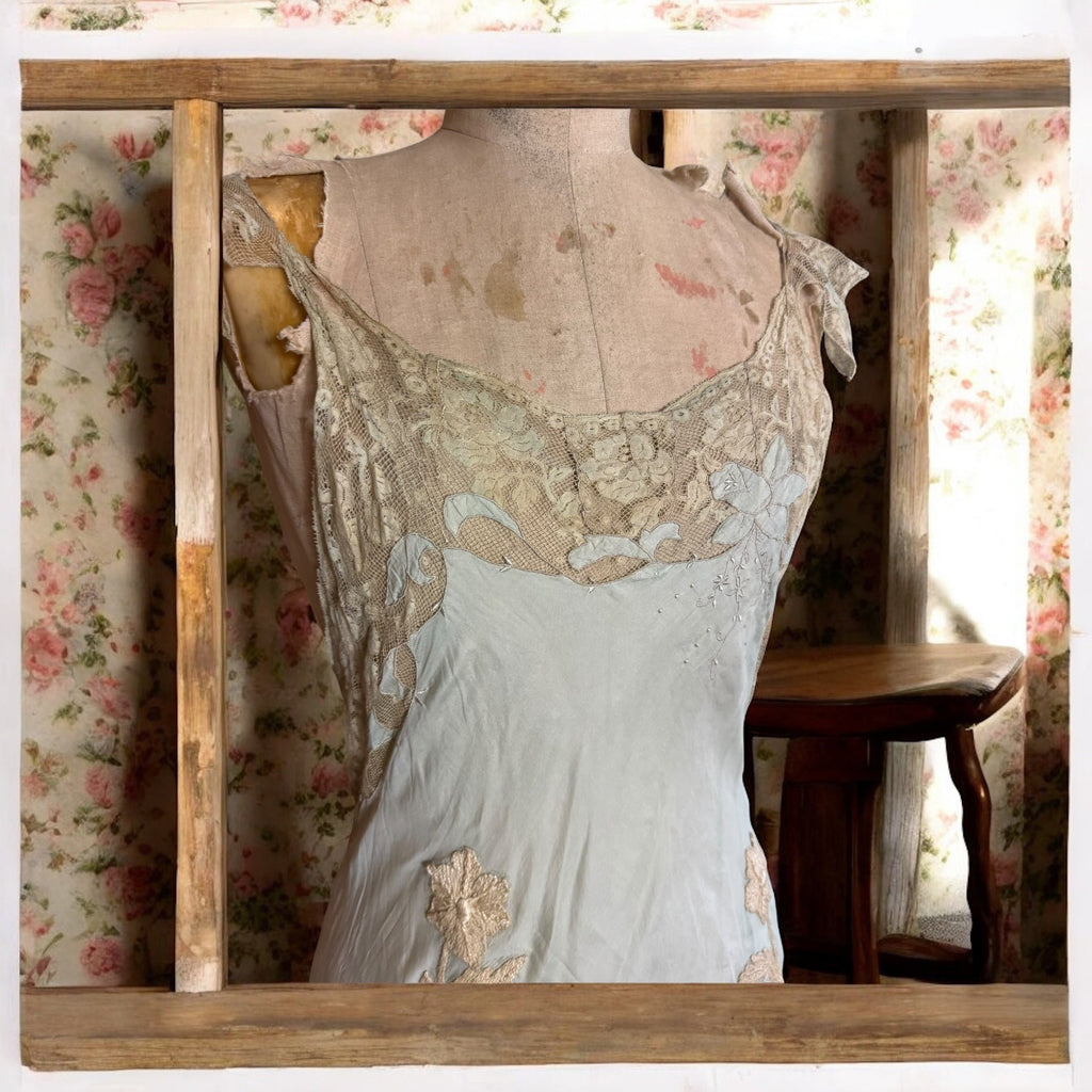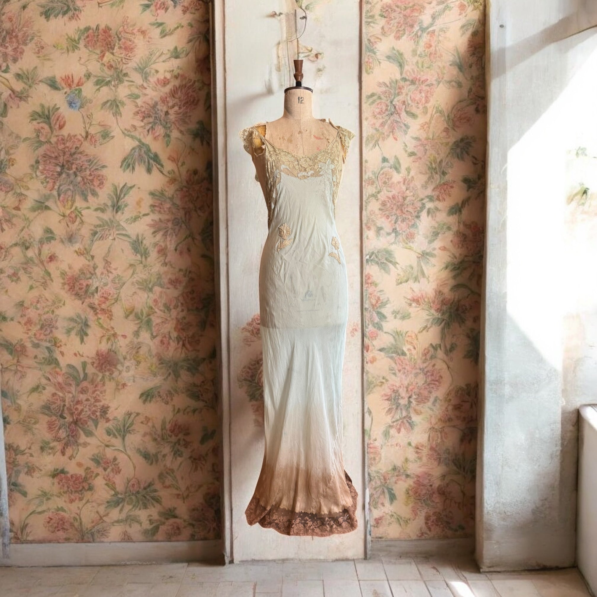 This unique 1920s silk and lace bias-cut dress has been expertly reworked and hand-dyed in a delicate light green, with a distinctive brown dip-dye effect creating an elegant ombré finish. Its vintage craftsmanship and flowing silhouette make it an exceptional choice for transitioning effortlessly from day to evening wear.