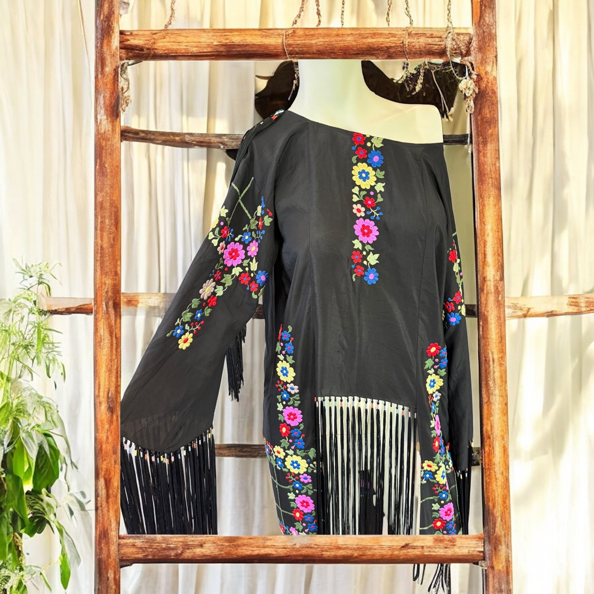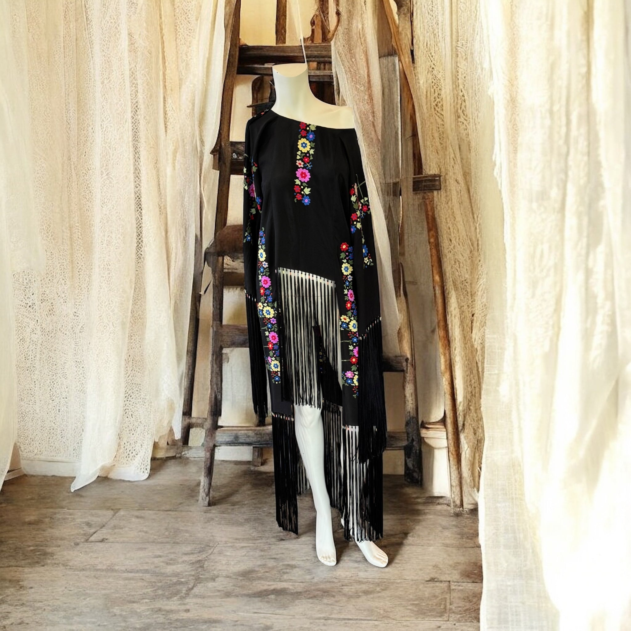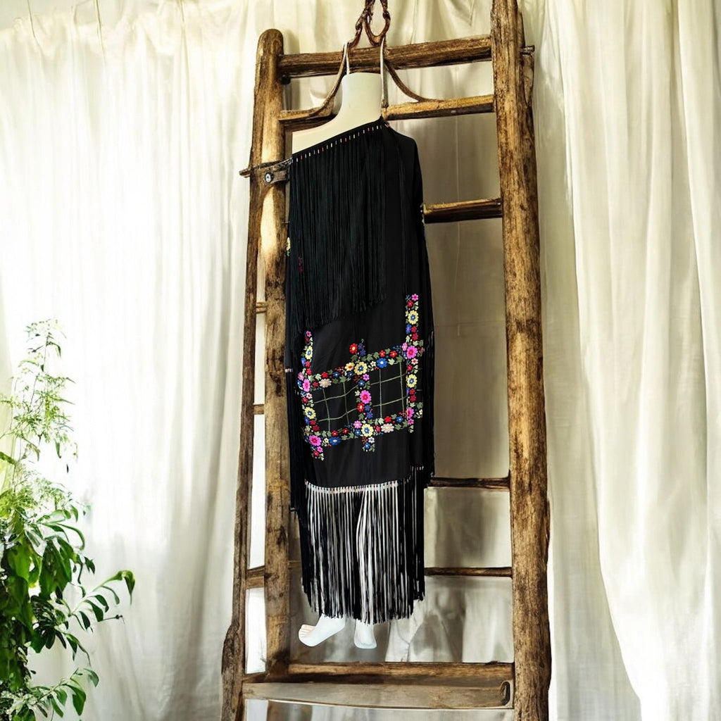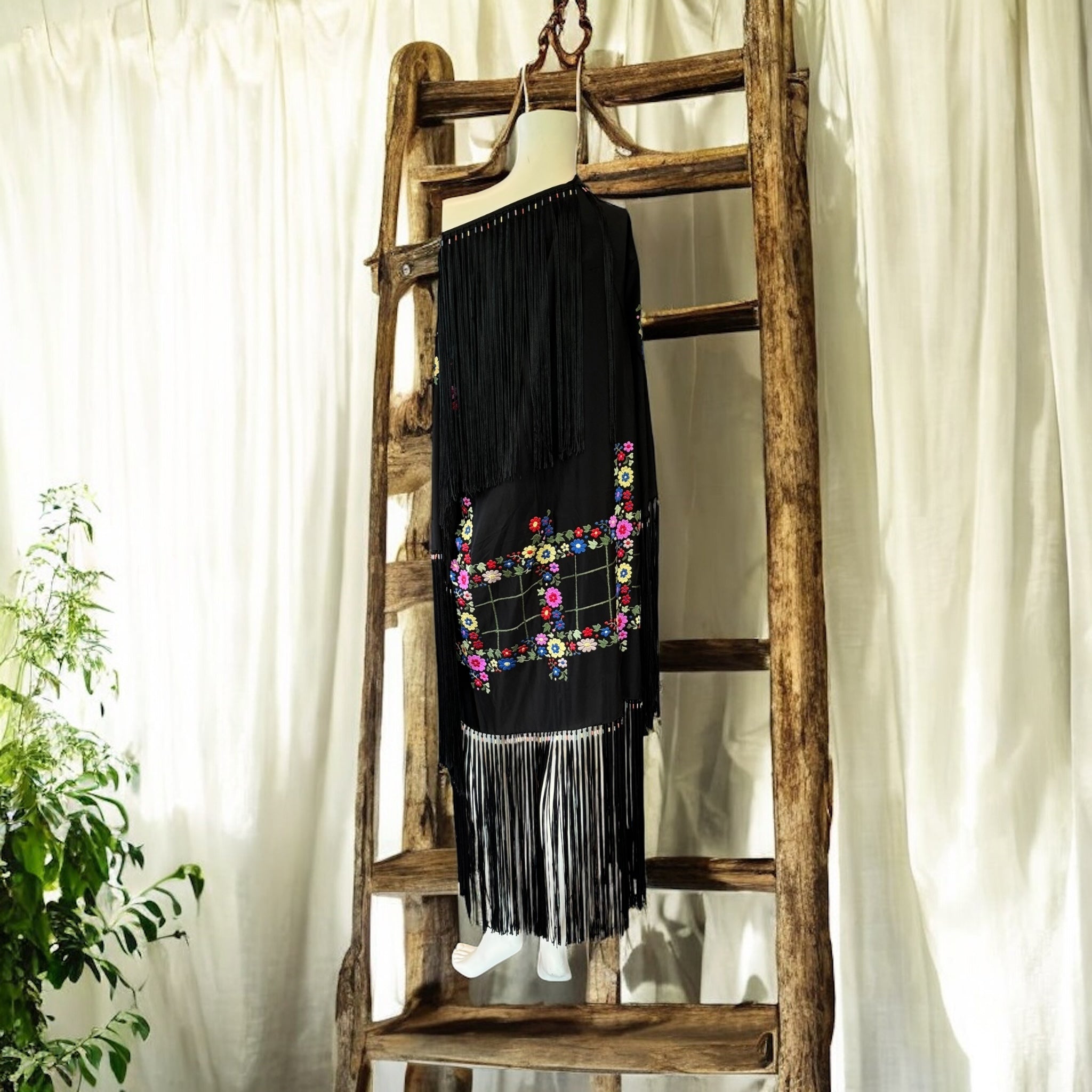 This unique 1920s embroidered tunic showcases expert craftsmanship with its wide neckline, long sleeves, and distinctive fringe detailing along the hem and longer back. Perfectly suited for layering, it elevates both simple shift dresses and casual denim, offering a versatile vintage statement piece that blends historical elegance with modern styling.