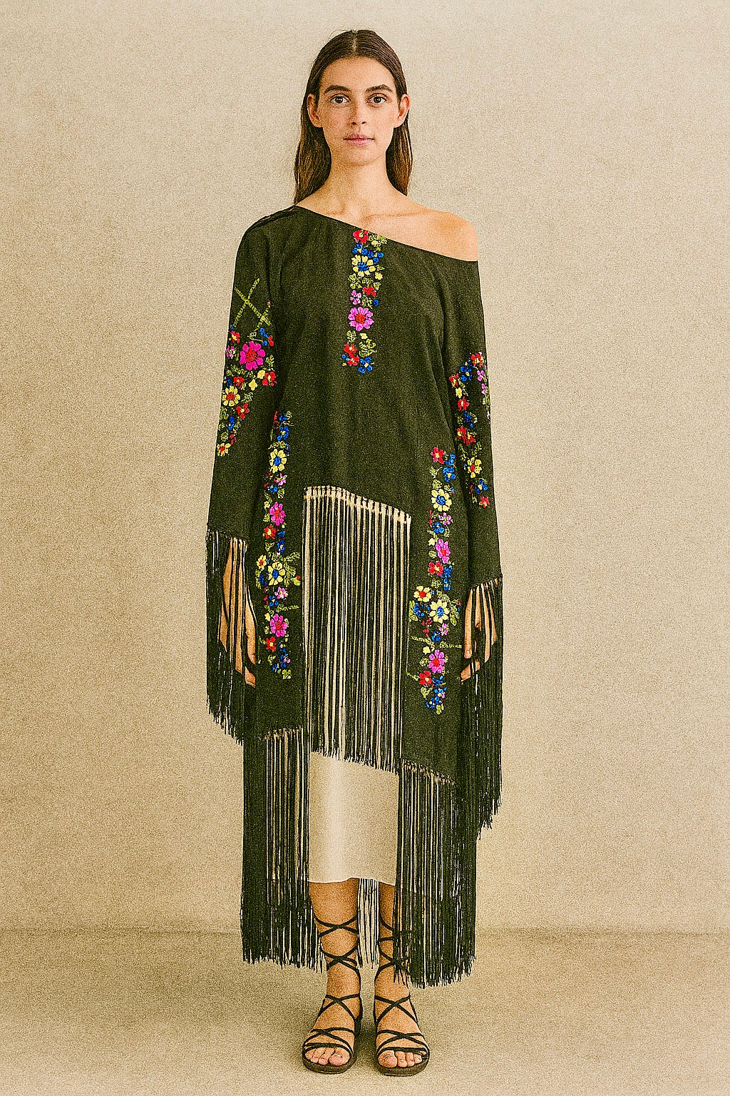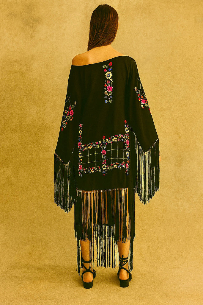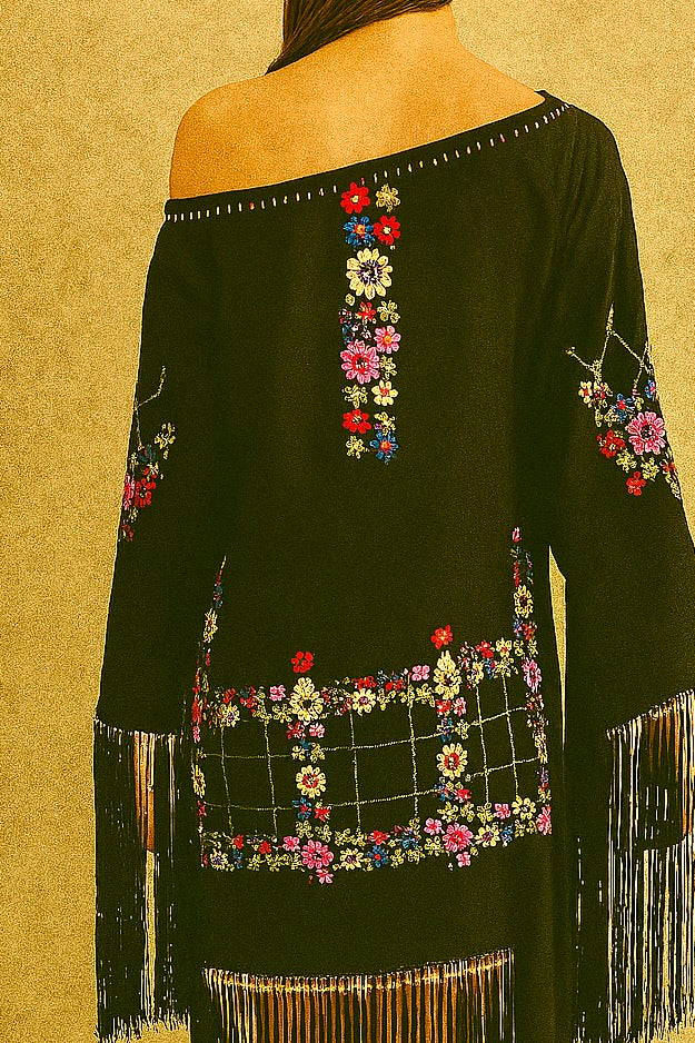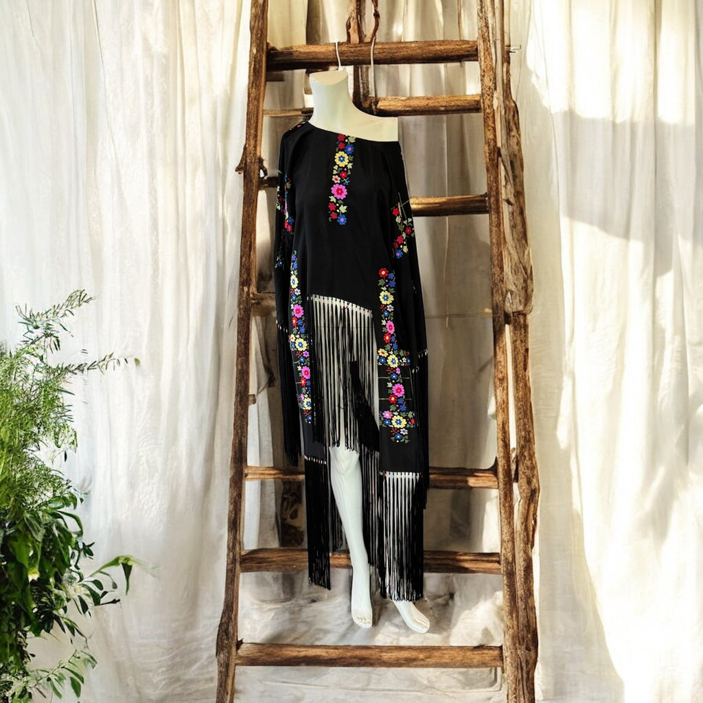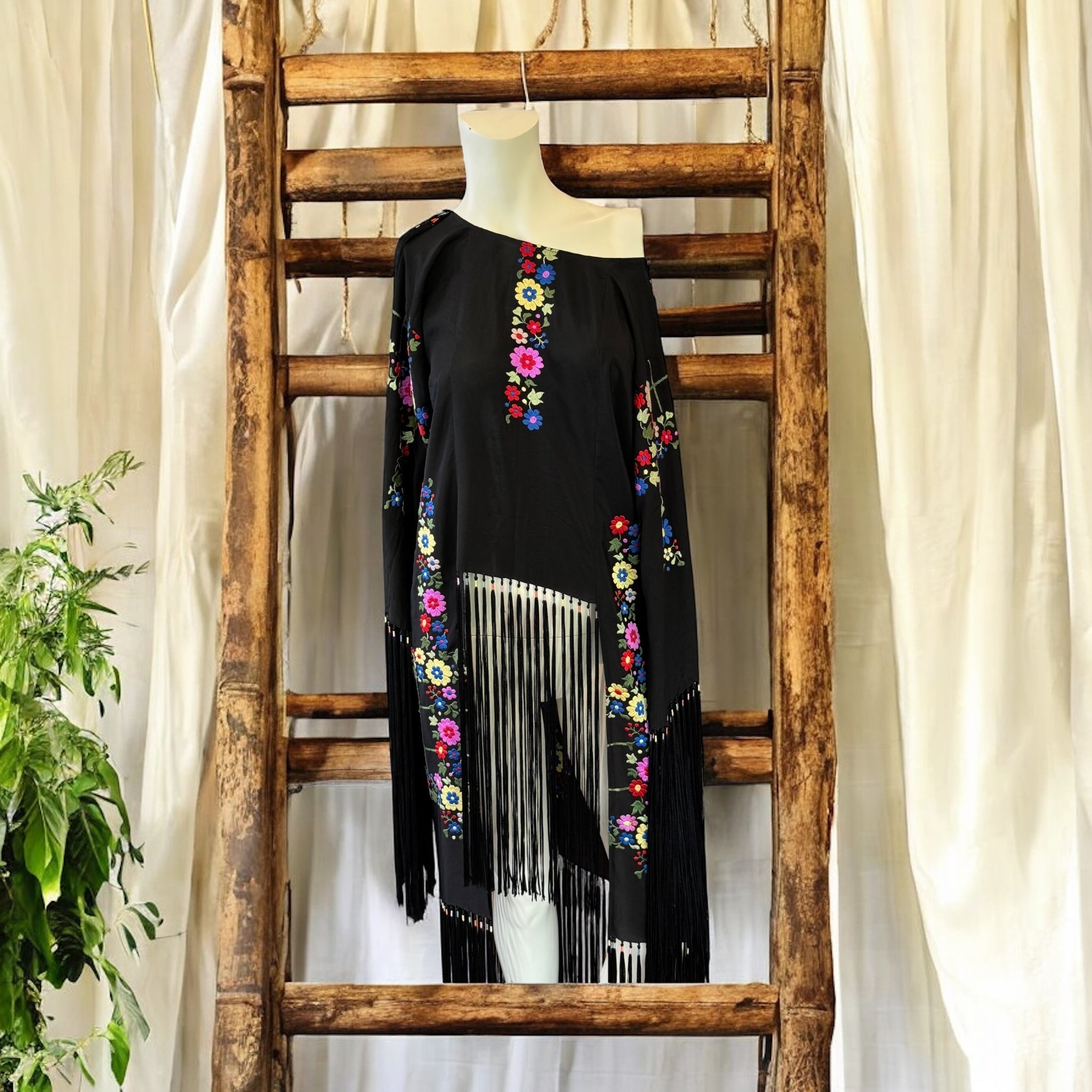 This unique 1920s embroidered tunic showcases expert craftsmanship with its wide neckline, long sleeves, and distinctive fringe detailing along the hem and longer back. Perfectly suited for layering, it elevates both simple shift dresses and casual denim, offering a versatile vintage statement piece that blends historical elegance with modern styling.
