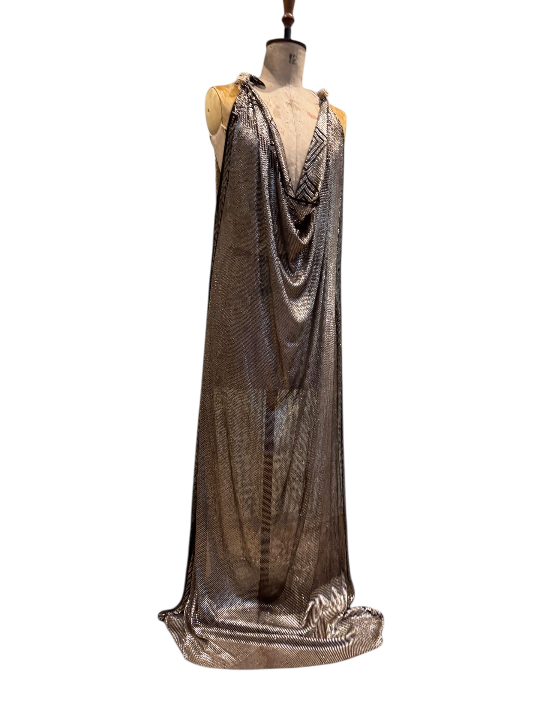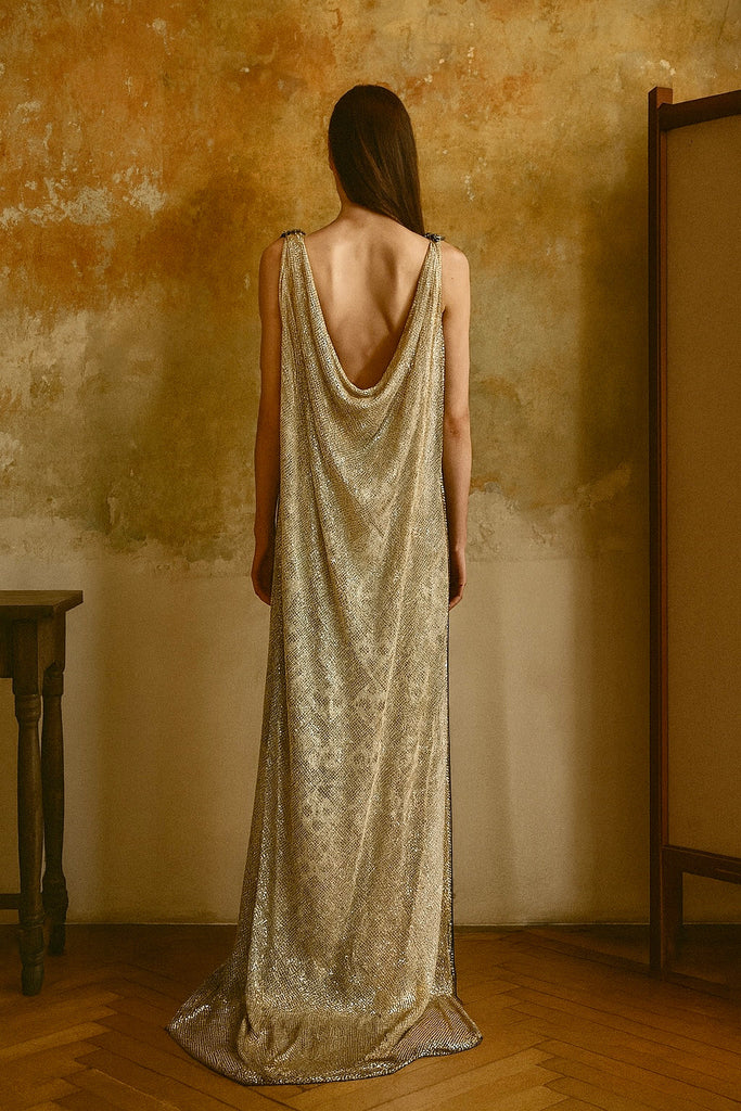 The reworked 20s metal Assuit bicolour dress features a double cow neck design with heavily metal mesh in black and silver on the front or back, and cream and silver on the other. With two neat knots and a versatile straight fit, this dress is an heirloom to cherish a lifetime.