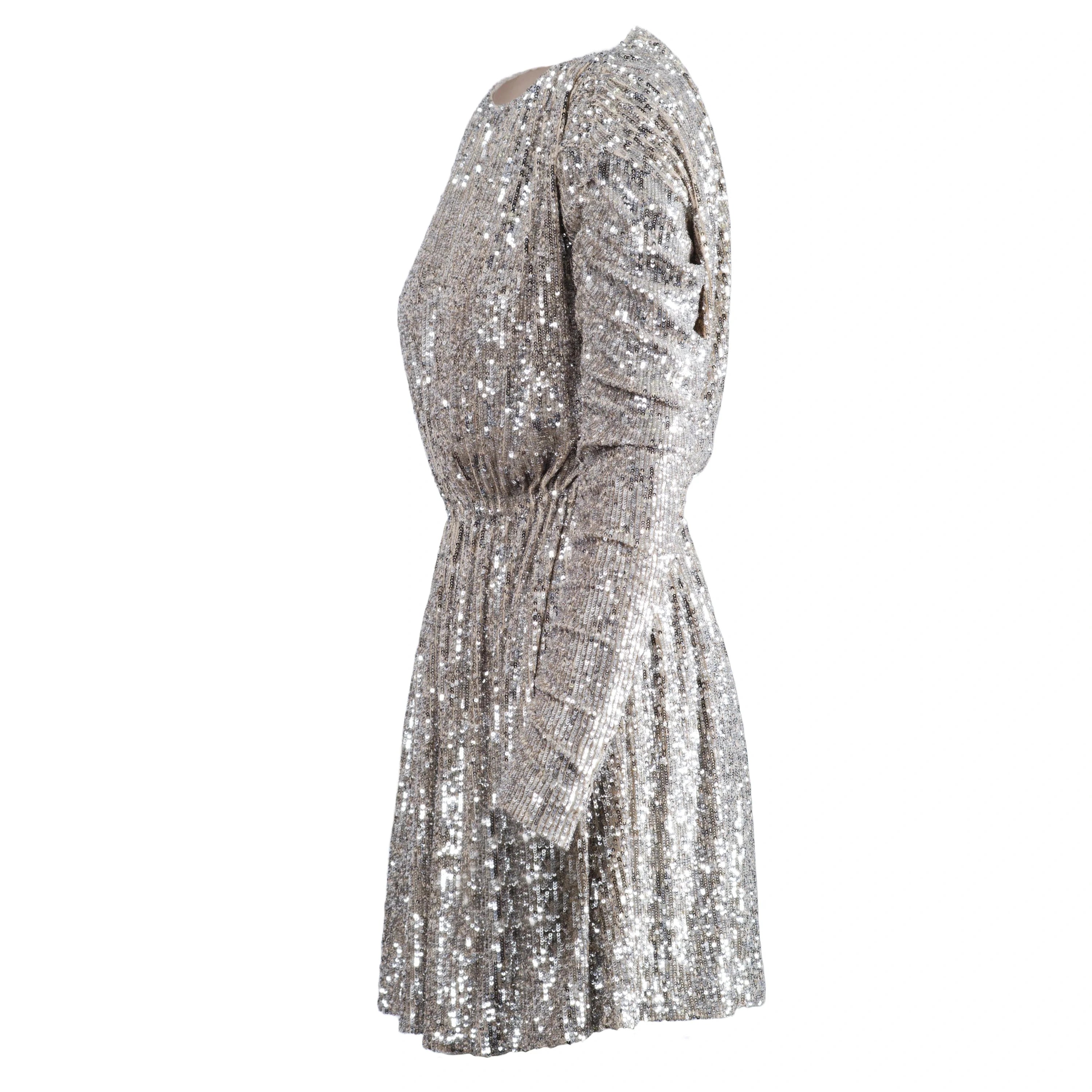 This Saint Laurent mini dress is entirely adorned with silver sequins, adding texture and movement to the fabric. The fitted silhouette and short length enhance the figure, while the brand’s distinctive design ensures a striking and radiant dress.