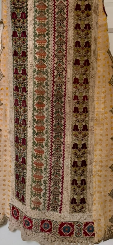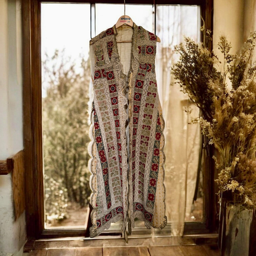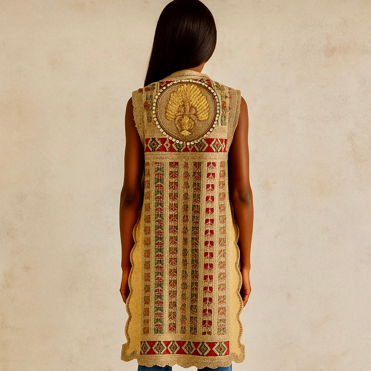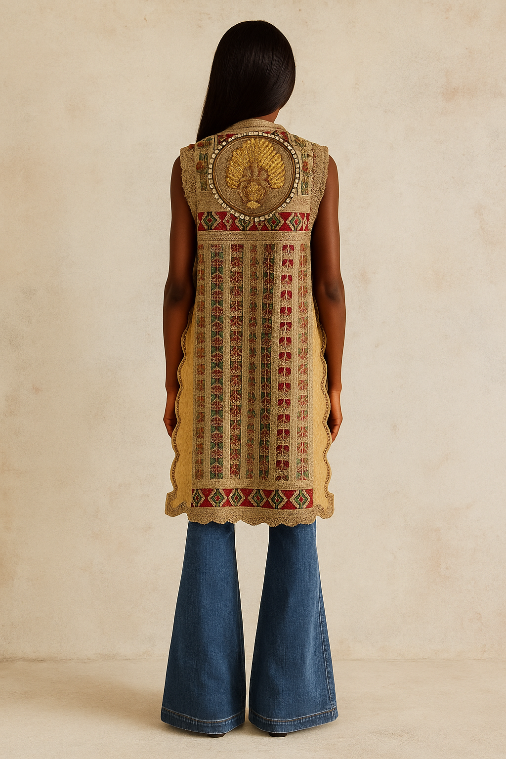Exquisite one-of-a-kind waistcoat meticulously reworked from 1920s Greek needlepoint and crochet. This sleeveless design features distinctive scalloped hems and front button detail. The standout element is an authentic Edwardian beaded Phoenix appliqué on the back—a powerful symbol of rebirth and transformation. Each stitch represents exceptional craftsmanship from two distinct eras, now harmoniously united in this unique collector's piece.