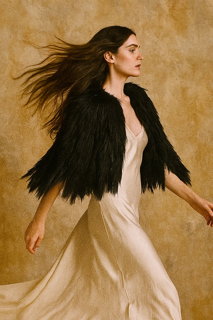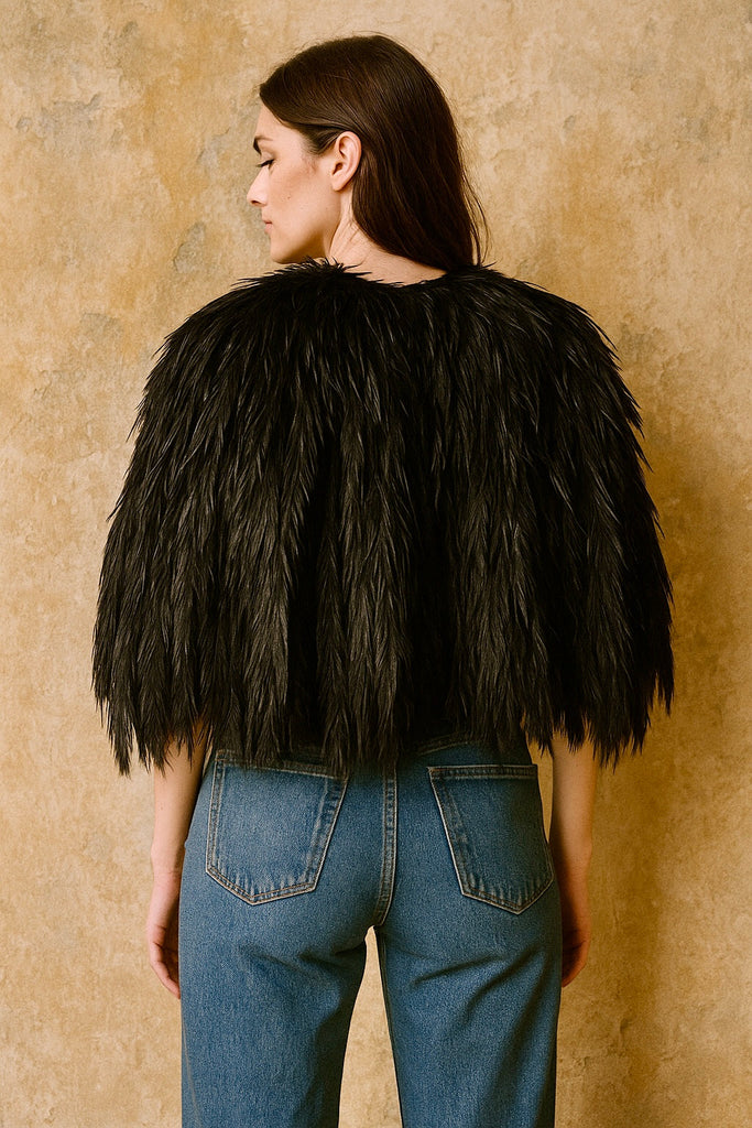 This rare and collectible ostrich feather cape from the 20s is a true gem. Exquisitely designed with the finest black feathers and a front silk tie, it adds a touch of glamour and elegance to any outfit.