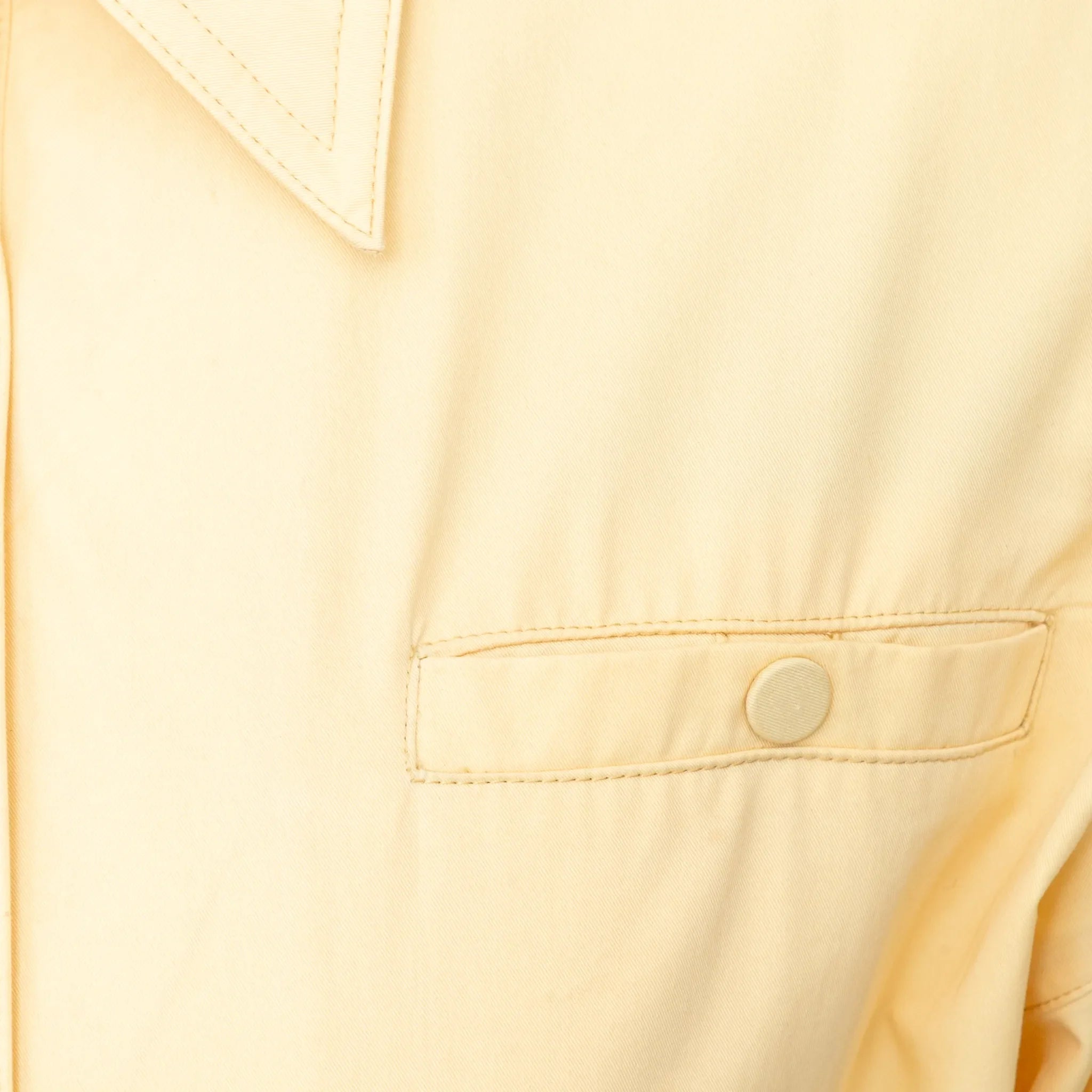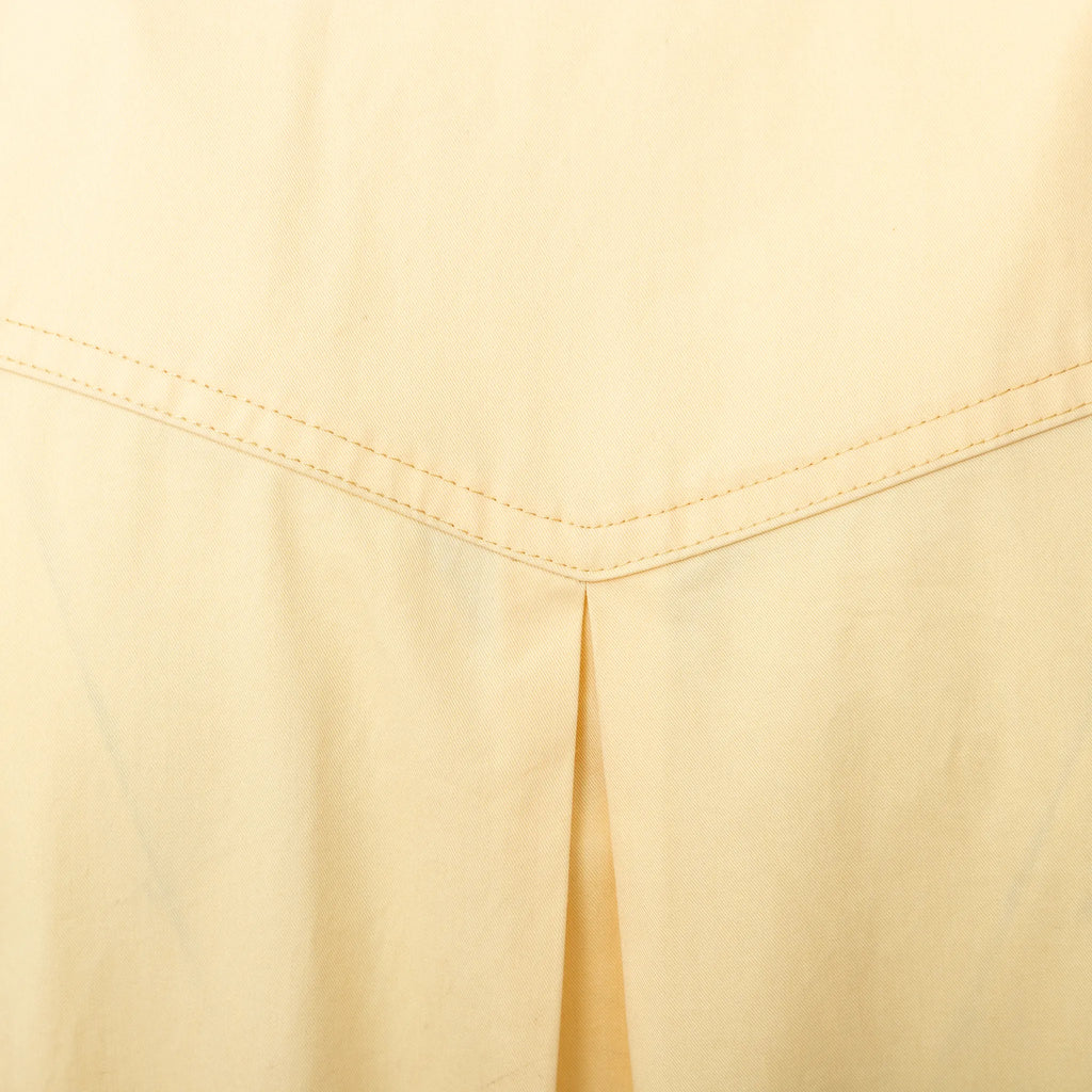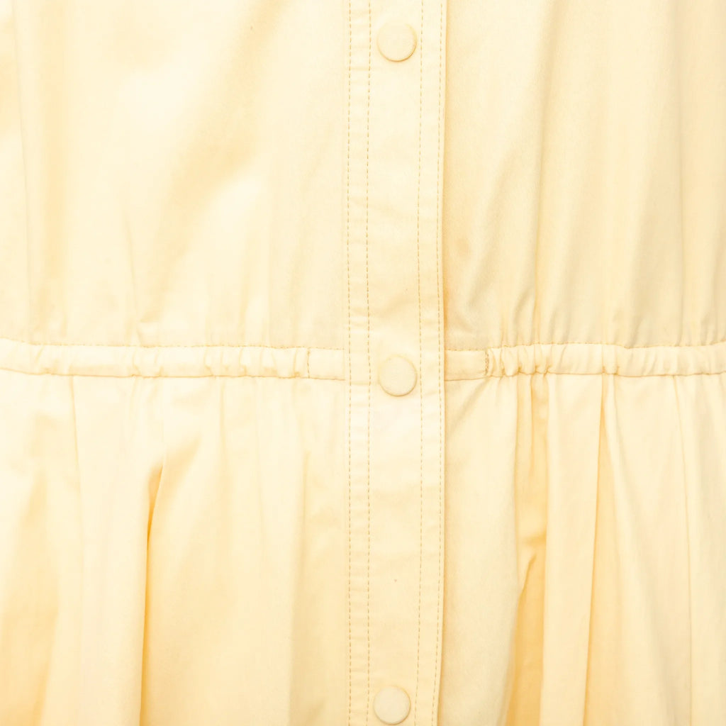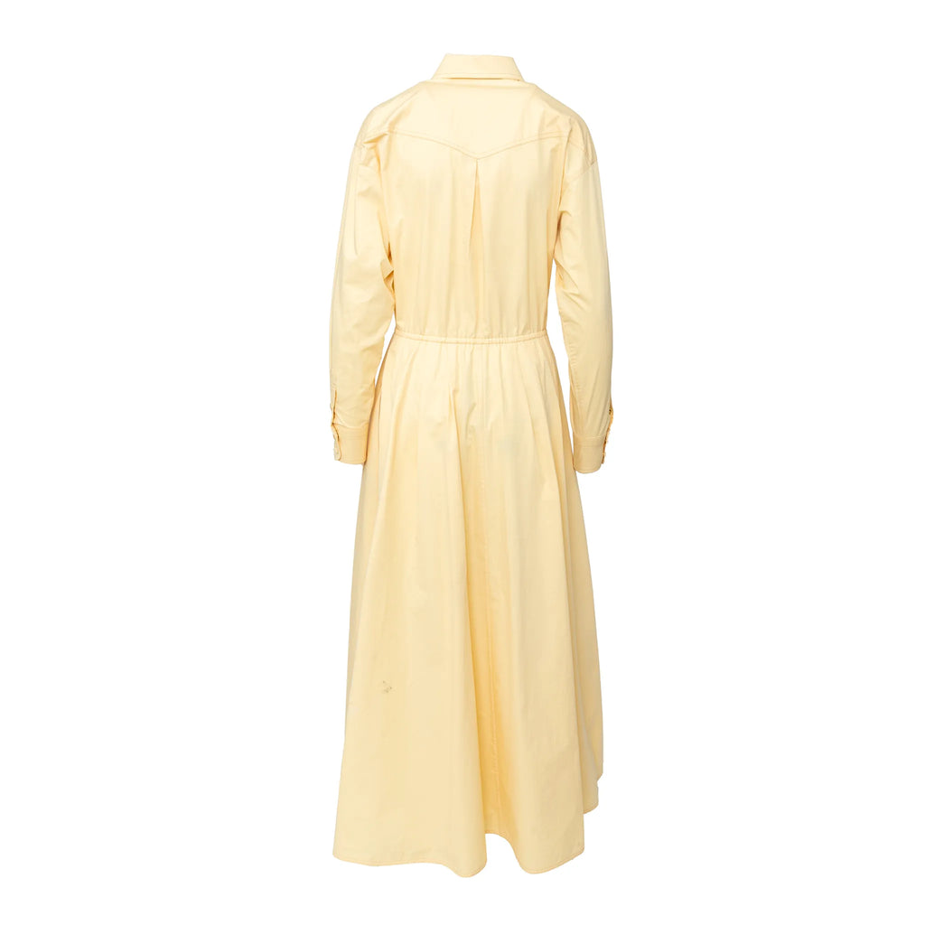 Tory Burch dress in yellow poplin cotton, with a cinched elastic waist, voluminous skirt, pointed collar. Feminine, tailored, and Western-inspired.