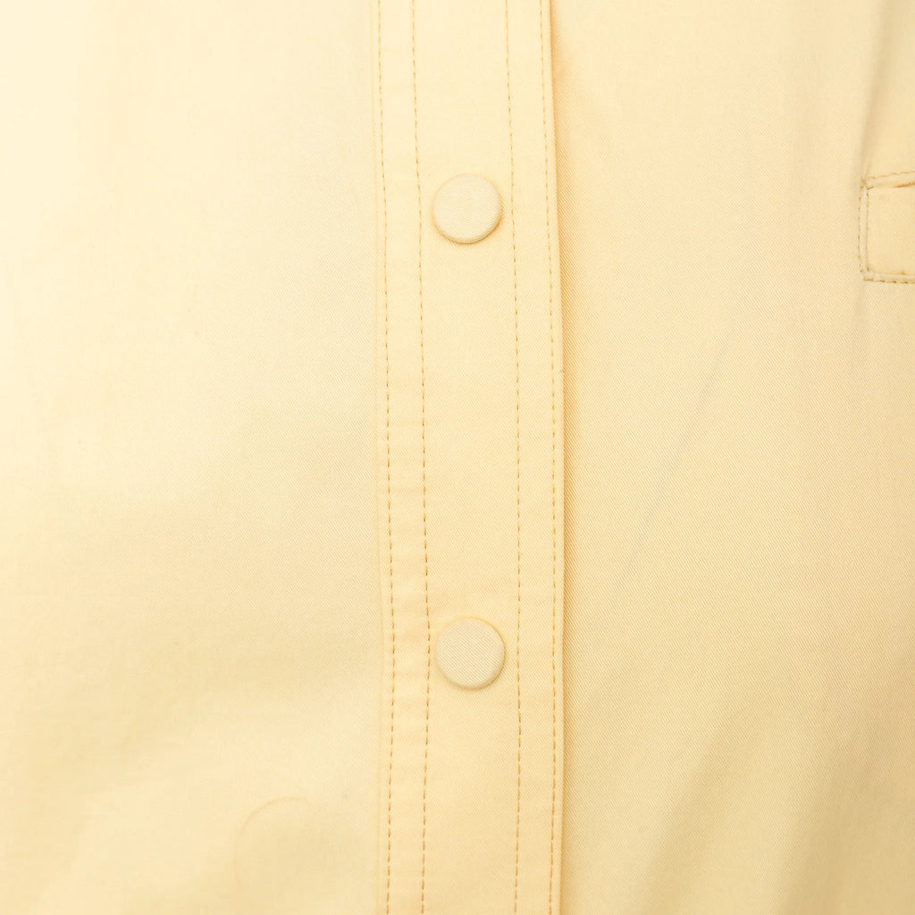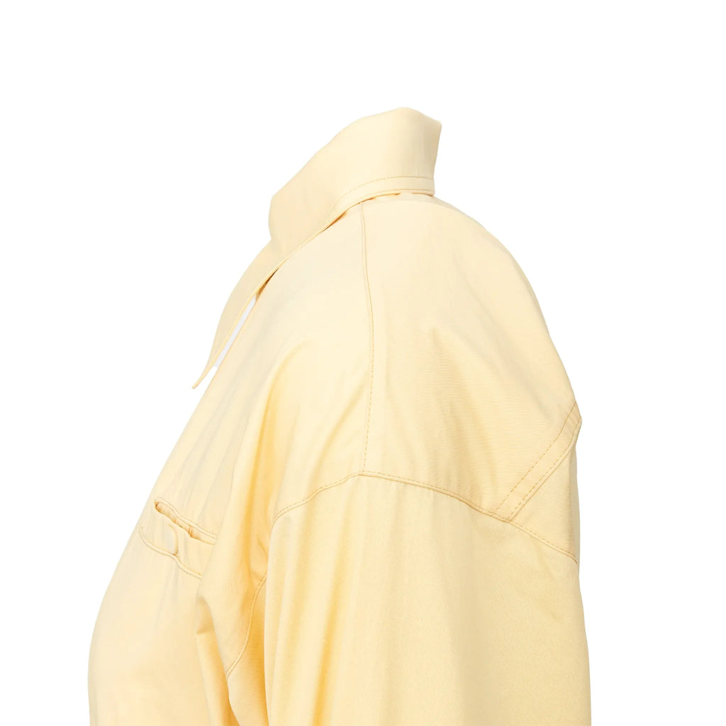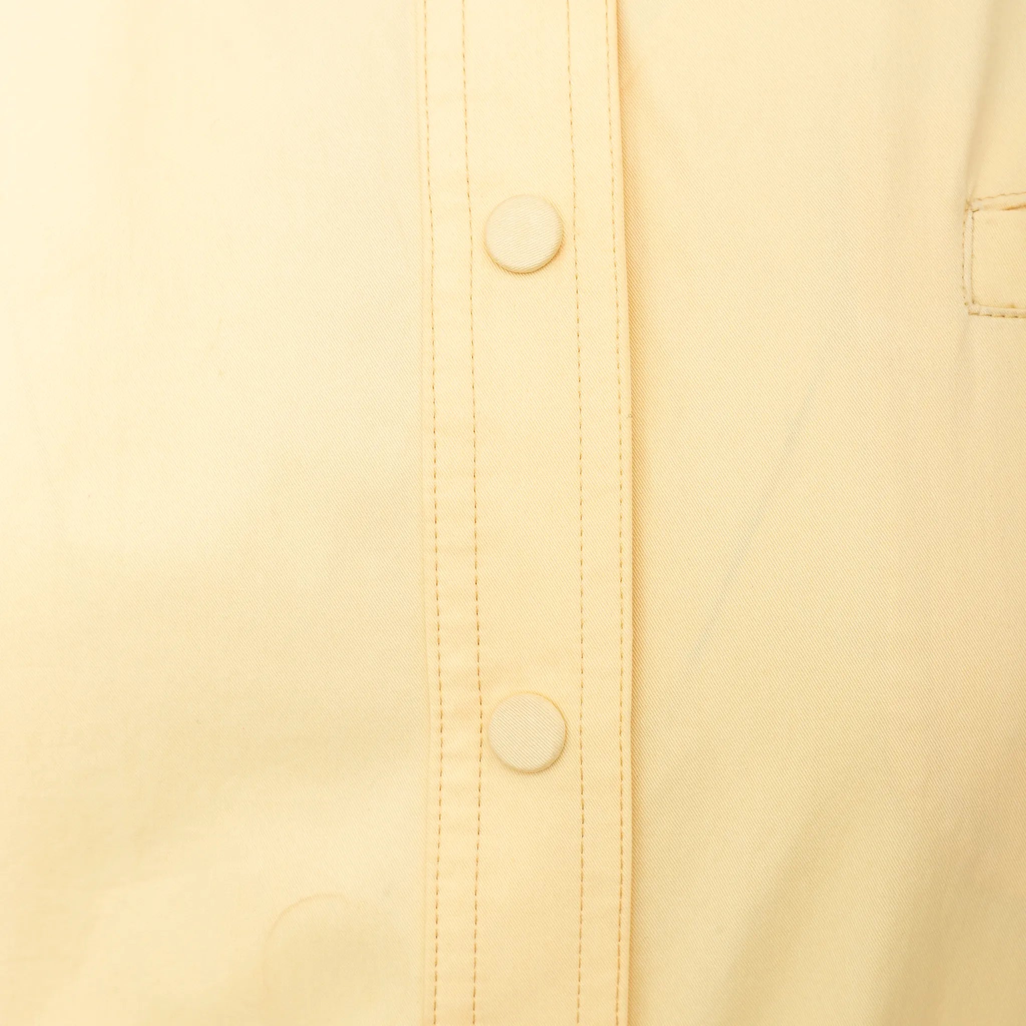 Tory Burch dress in yellow poplin cotton, with a cinched elastic waist, voluminous skirt, pointed collar. Feminine, tailored, and Western-inspired.