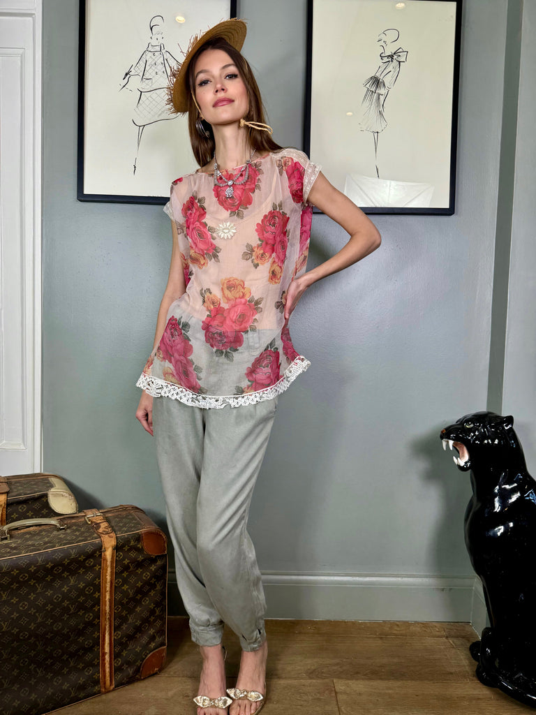 1920s Pale Brown Leaf Print Silk Blouse with Tie-Neck