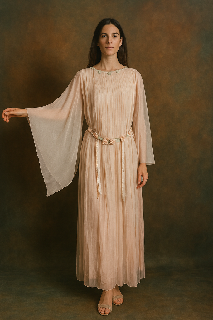Adan, 30s blush pink silk chiffon angel sleeve pleated dress with florals and a ribbon tie