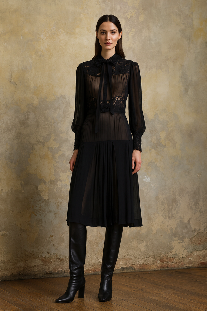 Lorde, 30s black silk and lace pleated dress