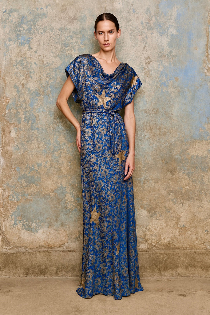 Slay, 30s blue and silver lamé bias cut dress with silver stars