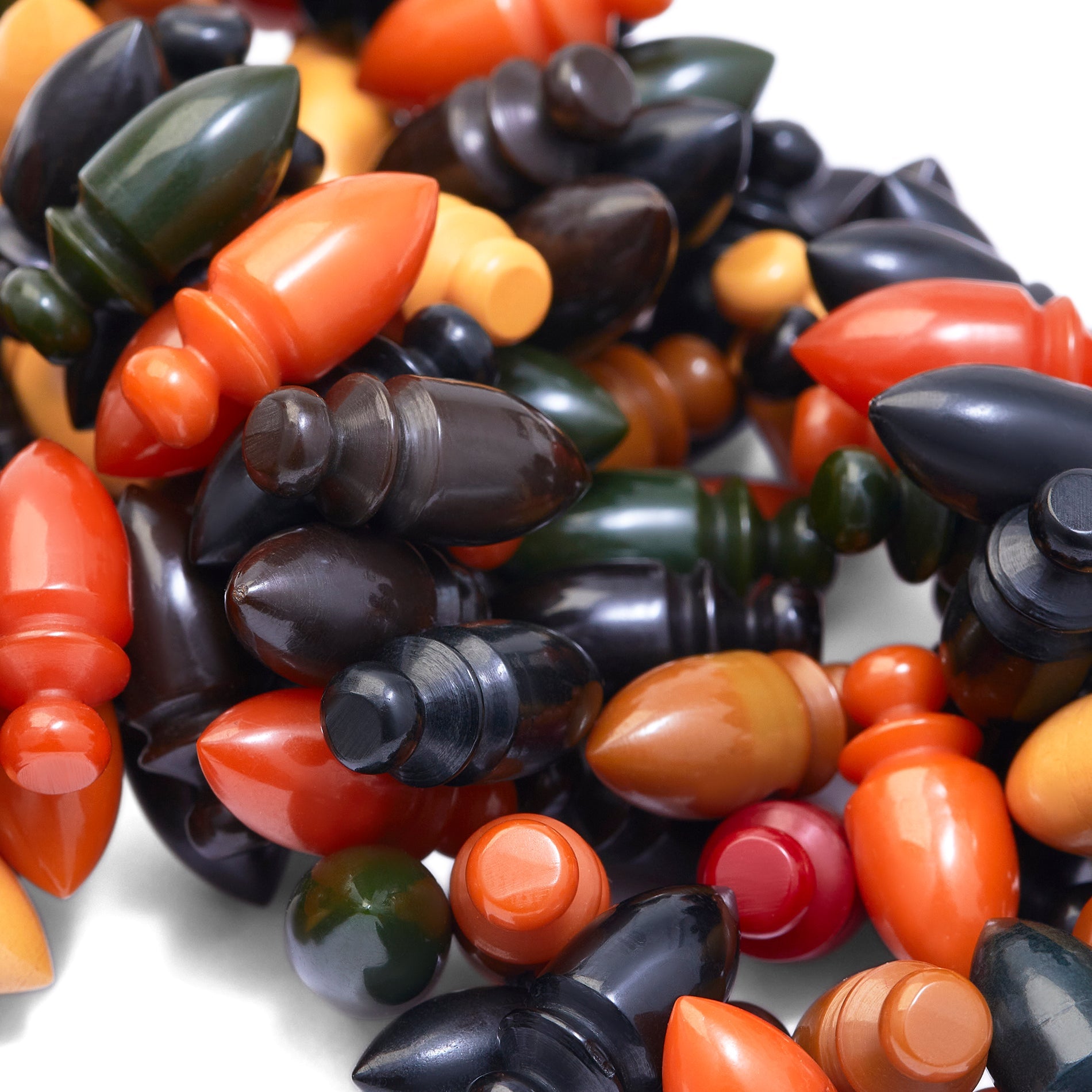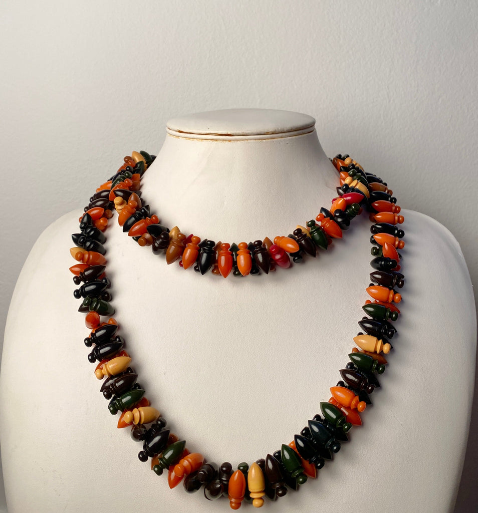 Impressive 1930s Bakelite necklace made up of multicoloured beads in various shades of dark green, mustard, orange, tan, red, brown and black - colours which were given food-related names such as Creamed Corn, Butterscotch, Egg Yolk, and Salmon. Each bead is reminiscent of a chess piece, with rounded lines that very much echo the art deco styles of the era.