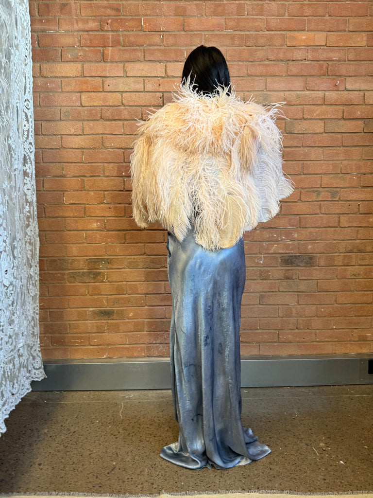 "This original 30s Light Peach Ostrich Feather Cape is a rare and collectible piece, featuring a delicate light peach color and luxurious ostrich feathers. Its silk ties add a touch of elegance and versatility to this stunning accessory. Perfect for adding a timeless cover up to any outfit.