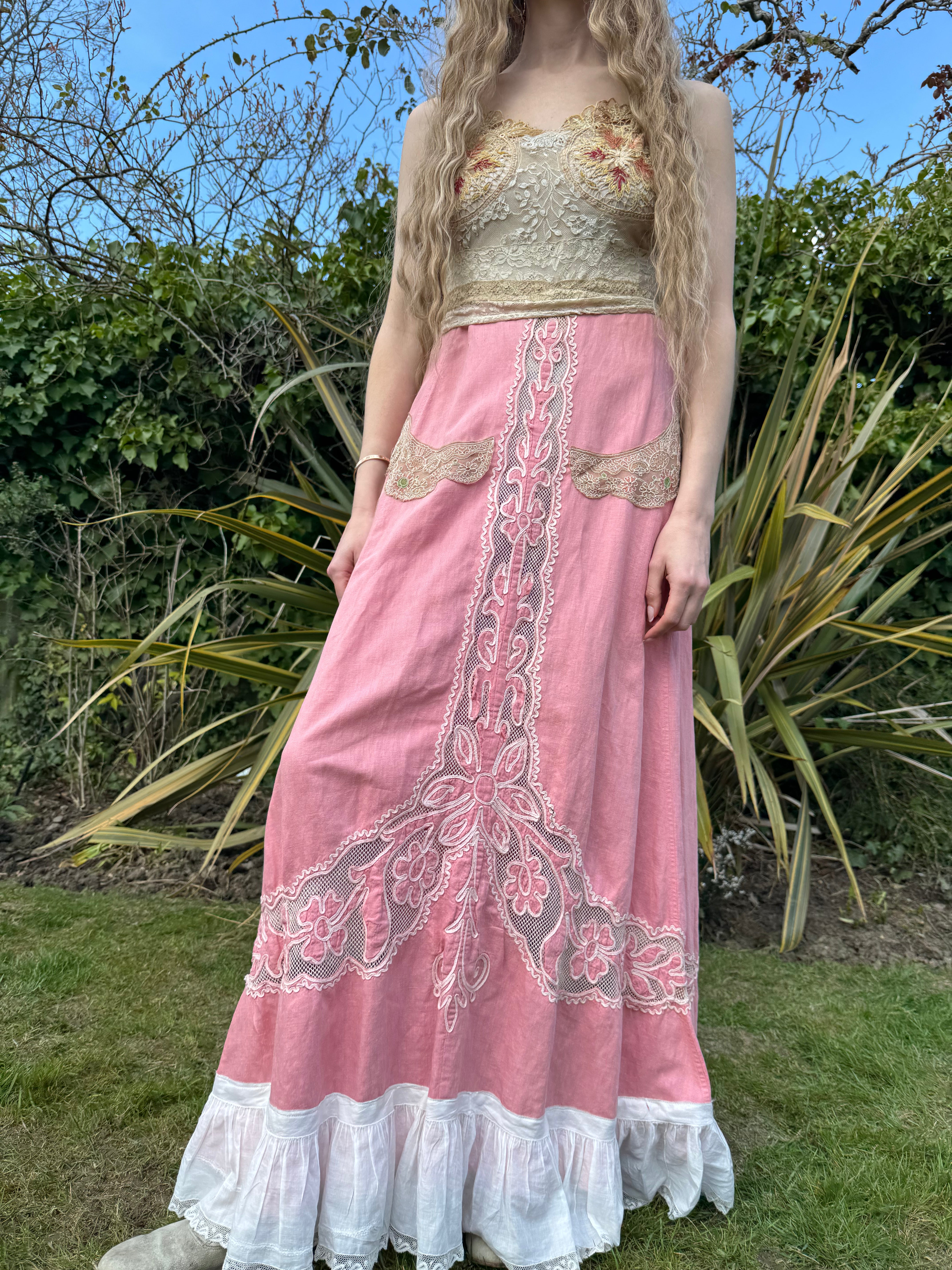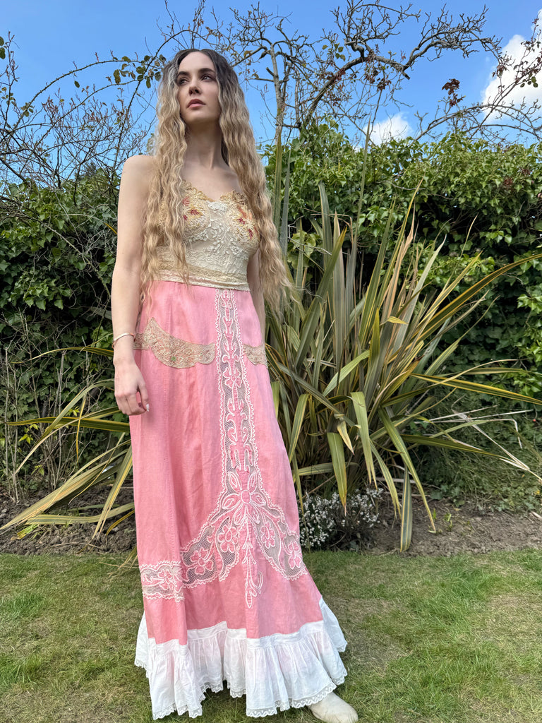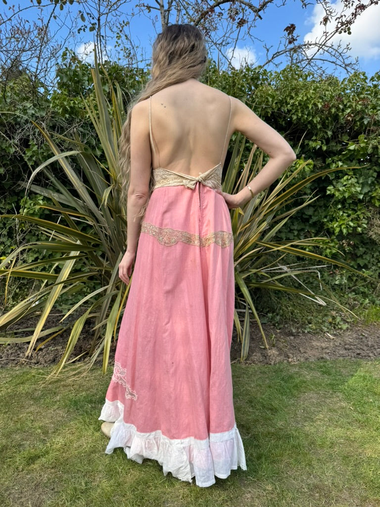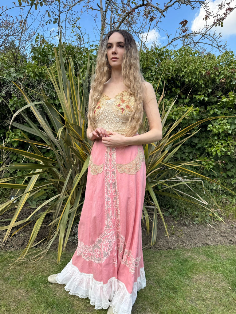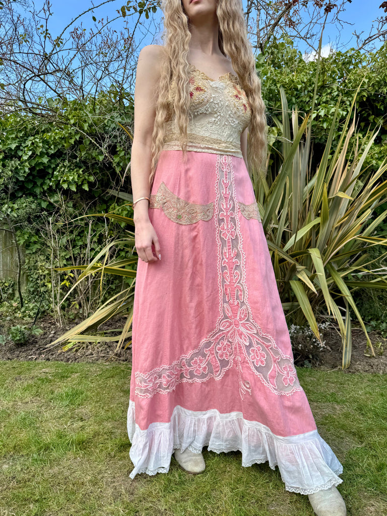 This reworked dress is truly unique, crafted from a delicate hand painted 20s lace top and a 30s pink cotton and lace detailed skirt. With back fastenings and a tie, this dress offers a timeless style and comfortable fit. Add a touch of vintage charm to your summer wardrobe.