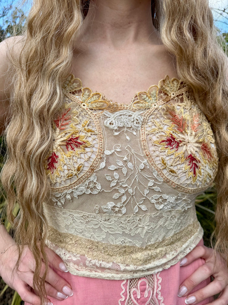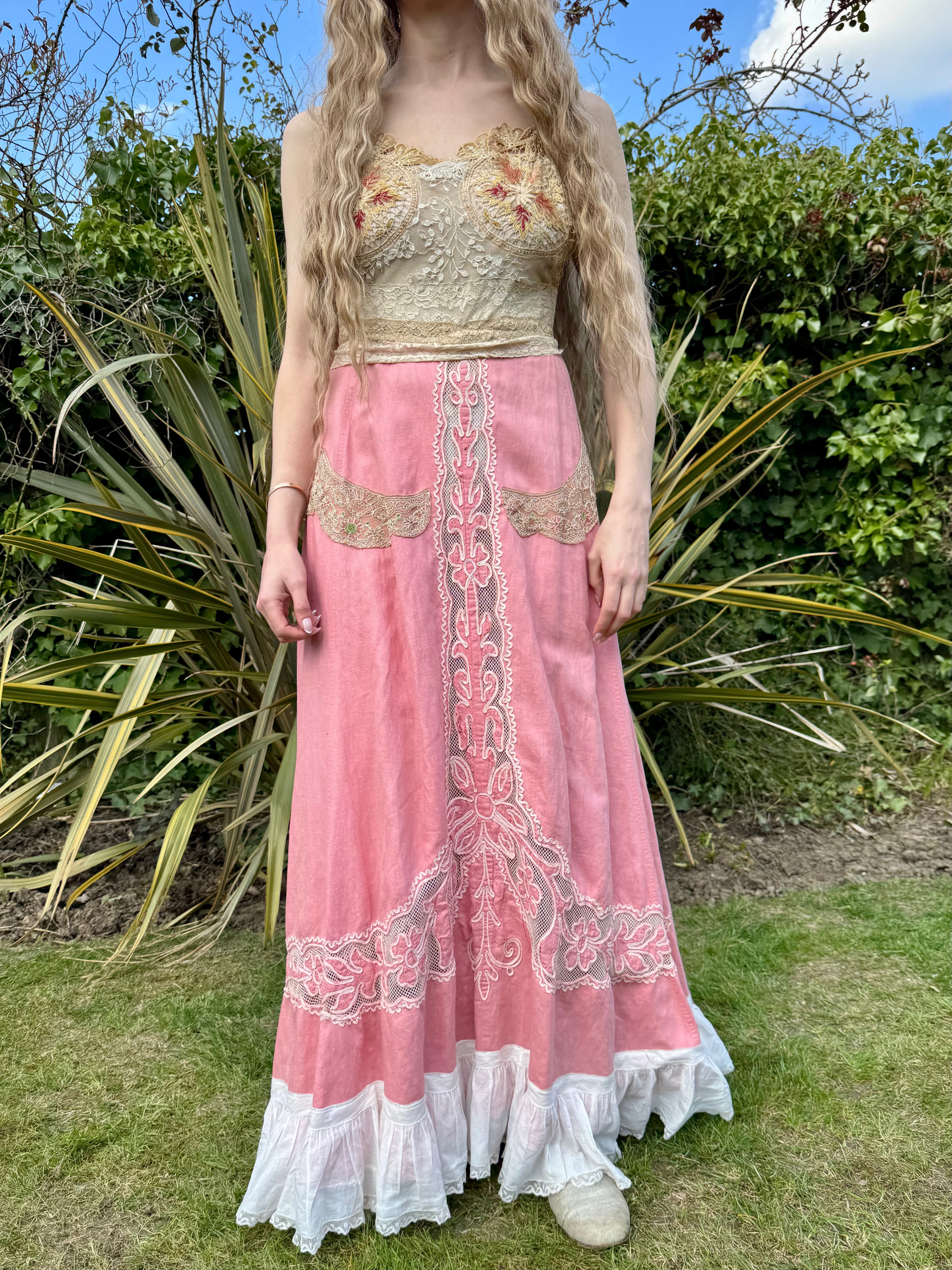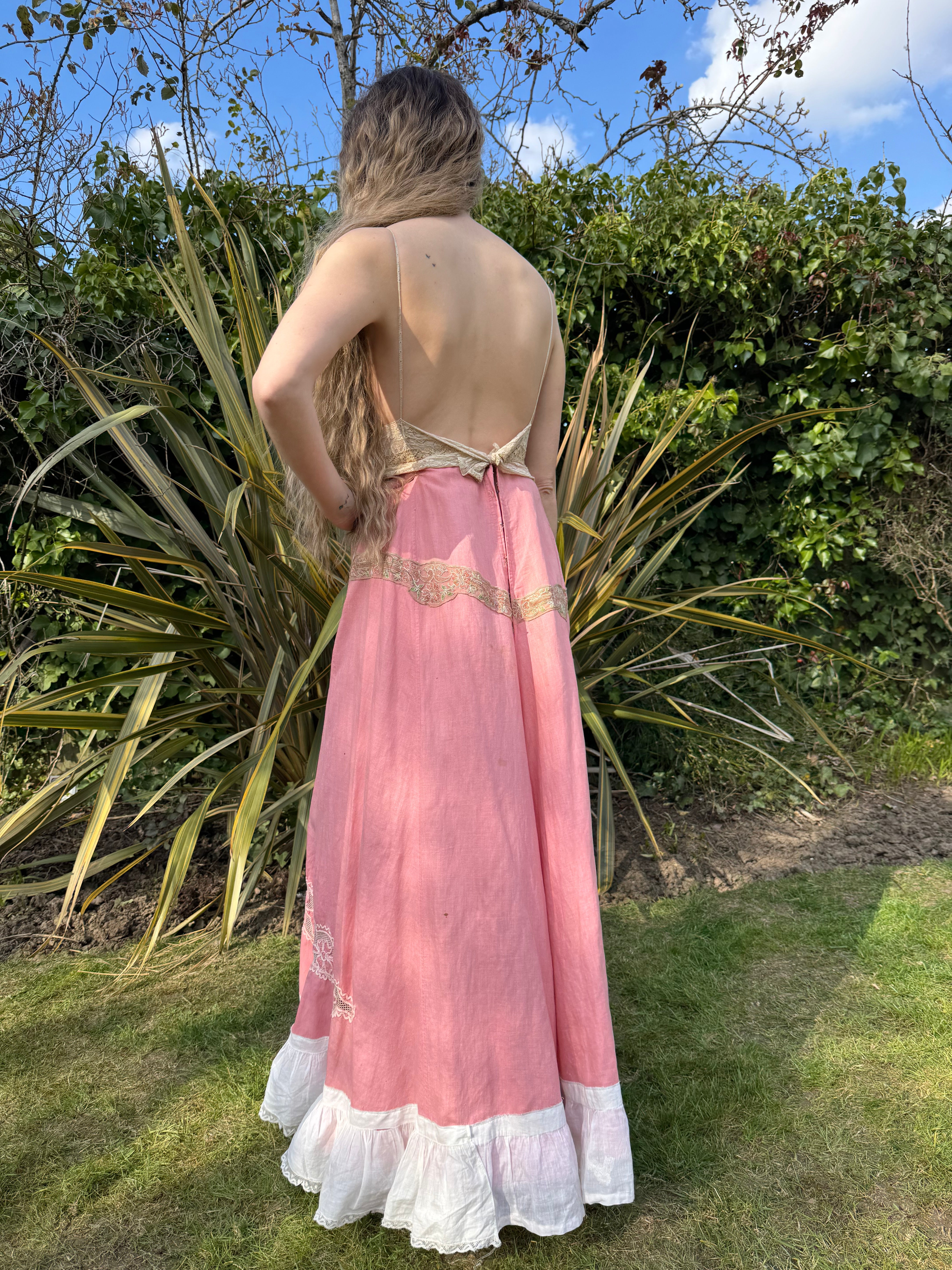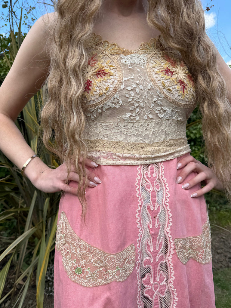 This reworked dress is truly unique, crafted from a delicate hand painted 20s lace top and a 30s pink cotton and lace detailed skirt. With back fastenings and a tie, this dress offers a timeless style and comfortable fit. Add a touch of vintage charm to your summer wardrobe.