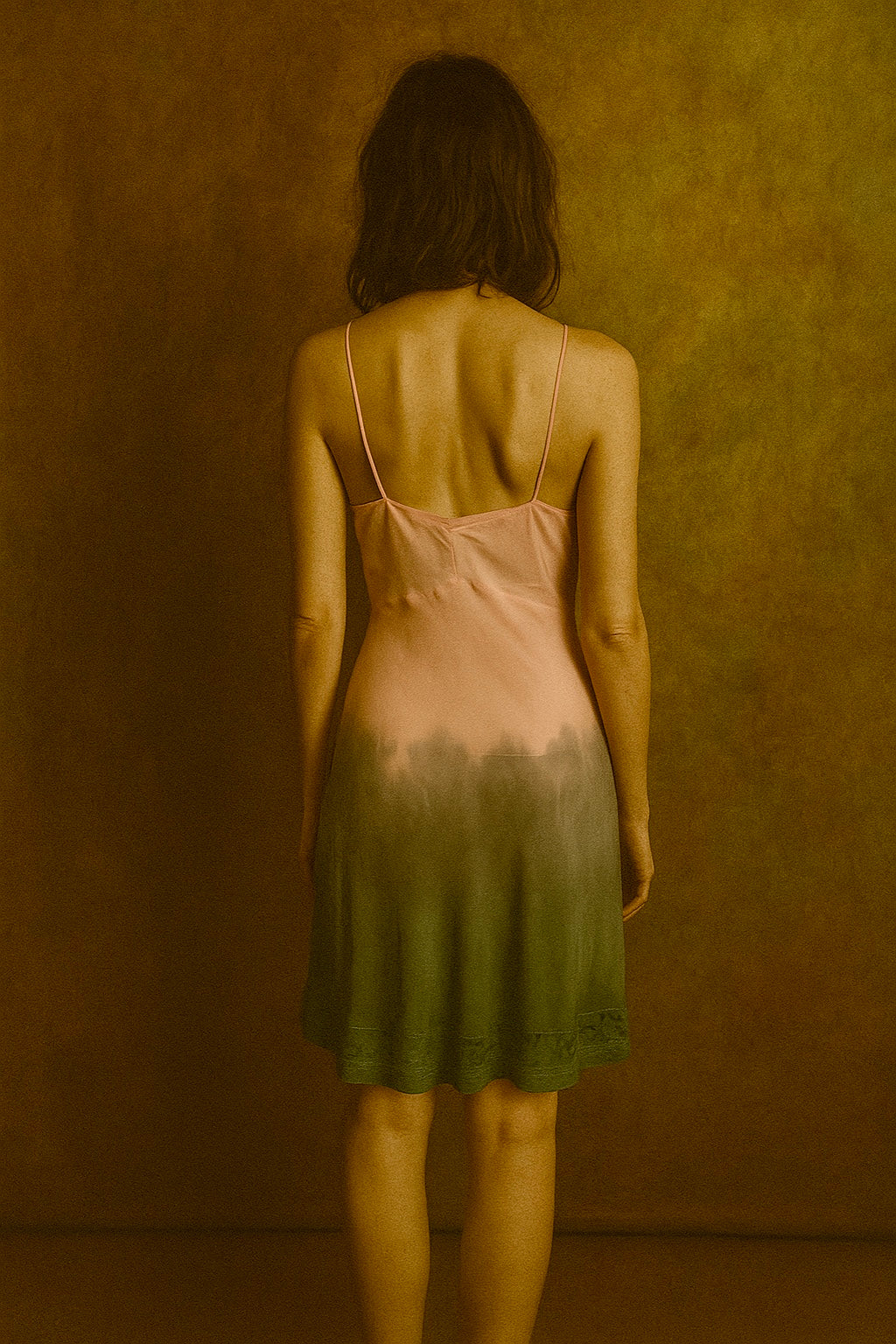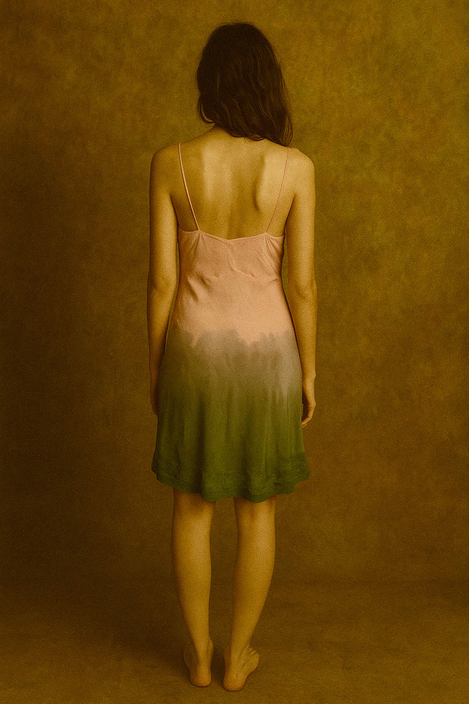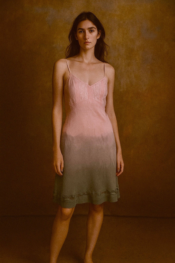 This unique hand-dyed silk slip dress features a delicate pink dip-dye effect and intricate embroidery on the bust, showcasing expert craftsmanship. Crafted from 1930s silk, it slips on effortlessly, offering a lightweight and breathable option ideal for layering during summer. Its timeless design combines vintage elegance with modern versatility.