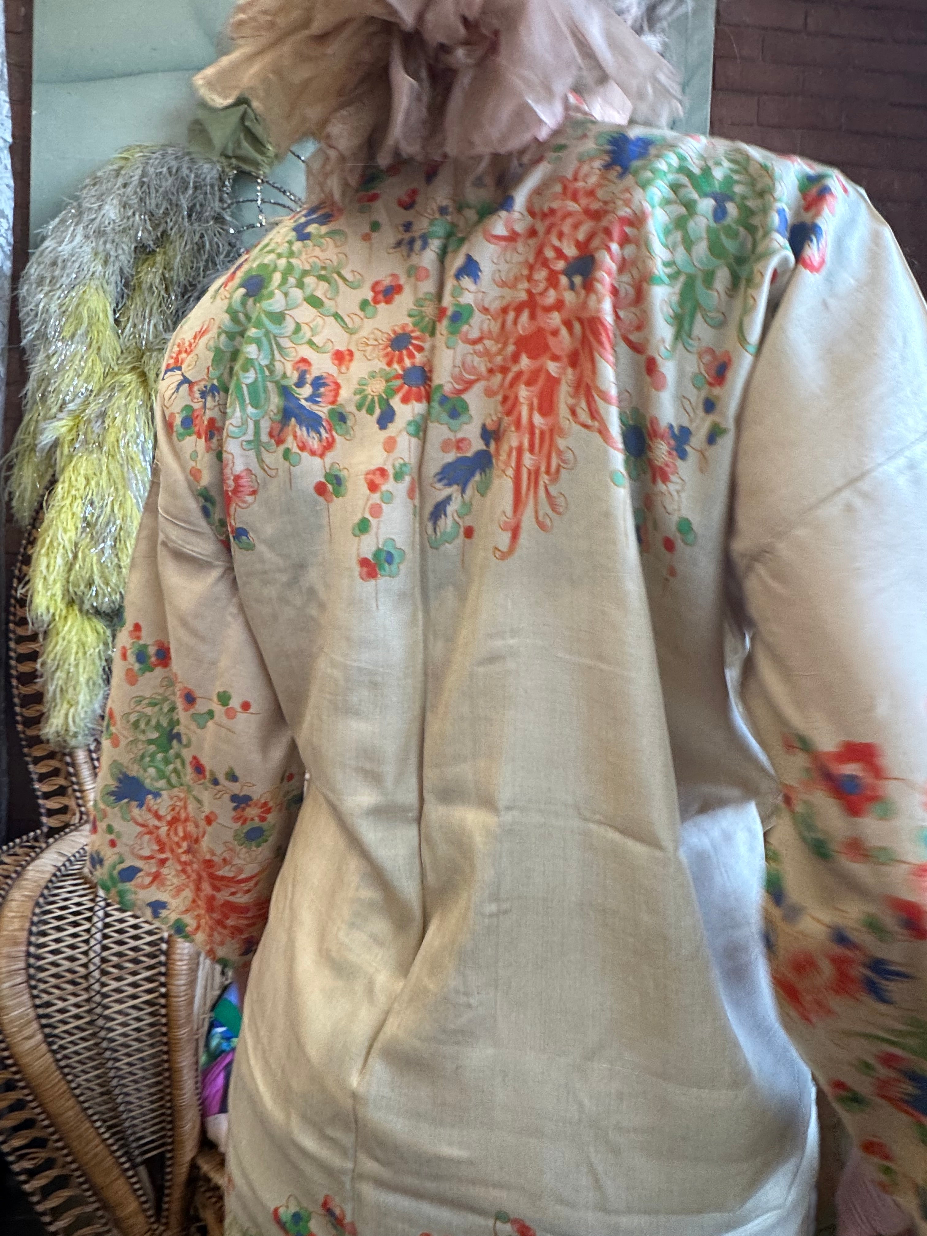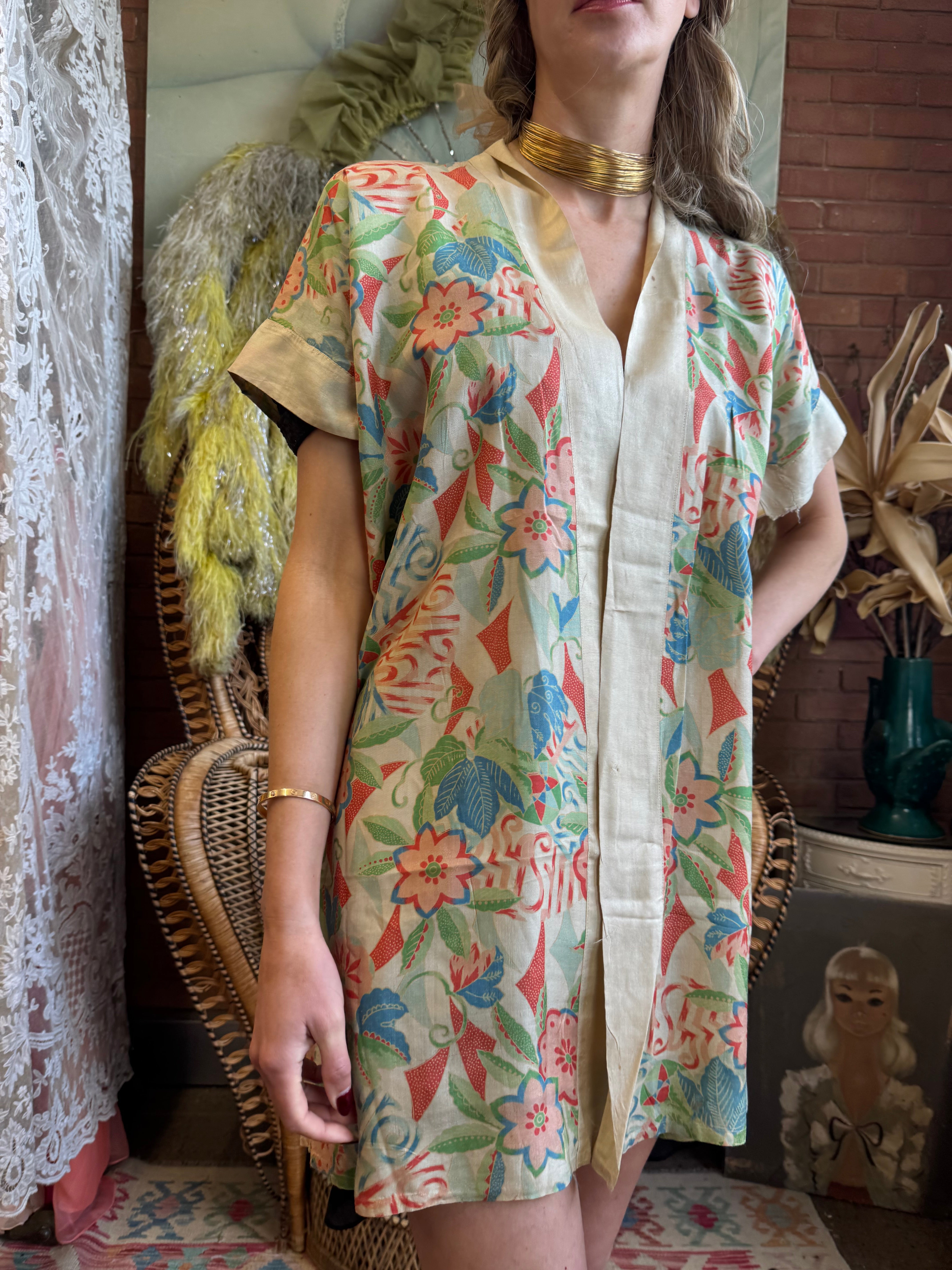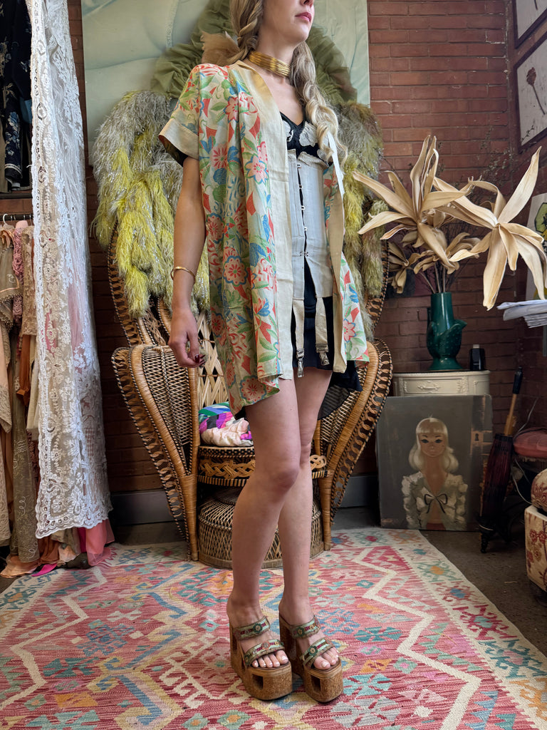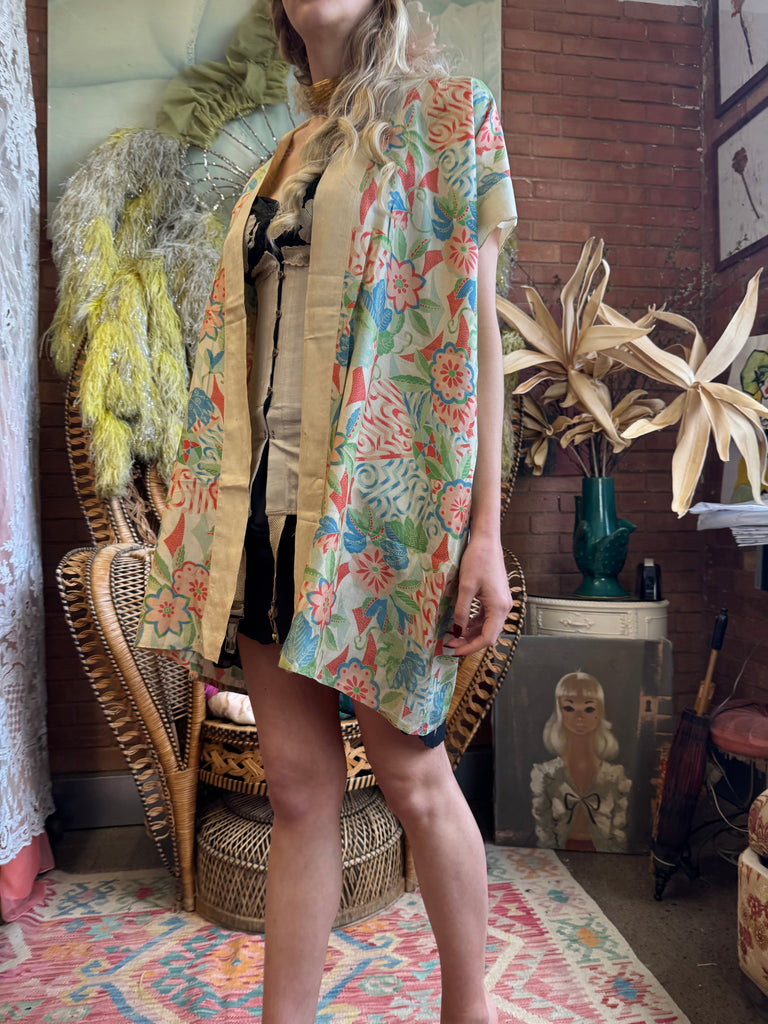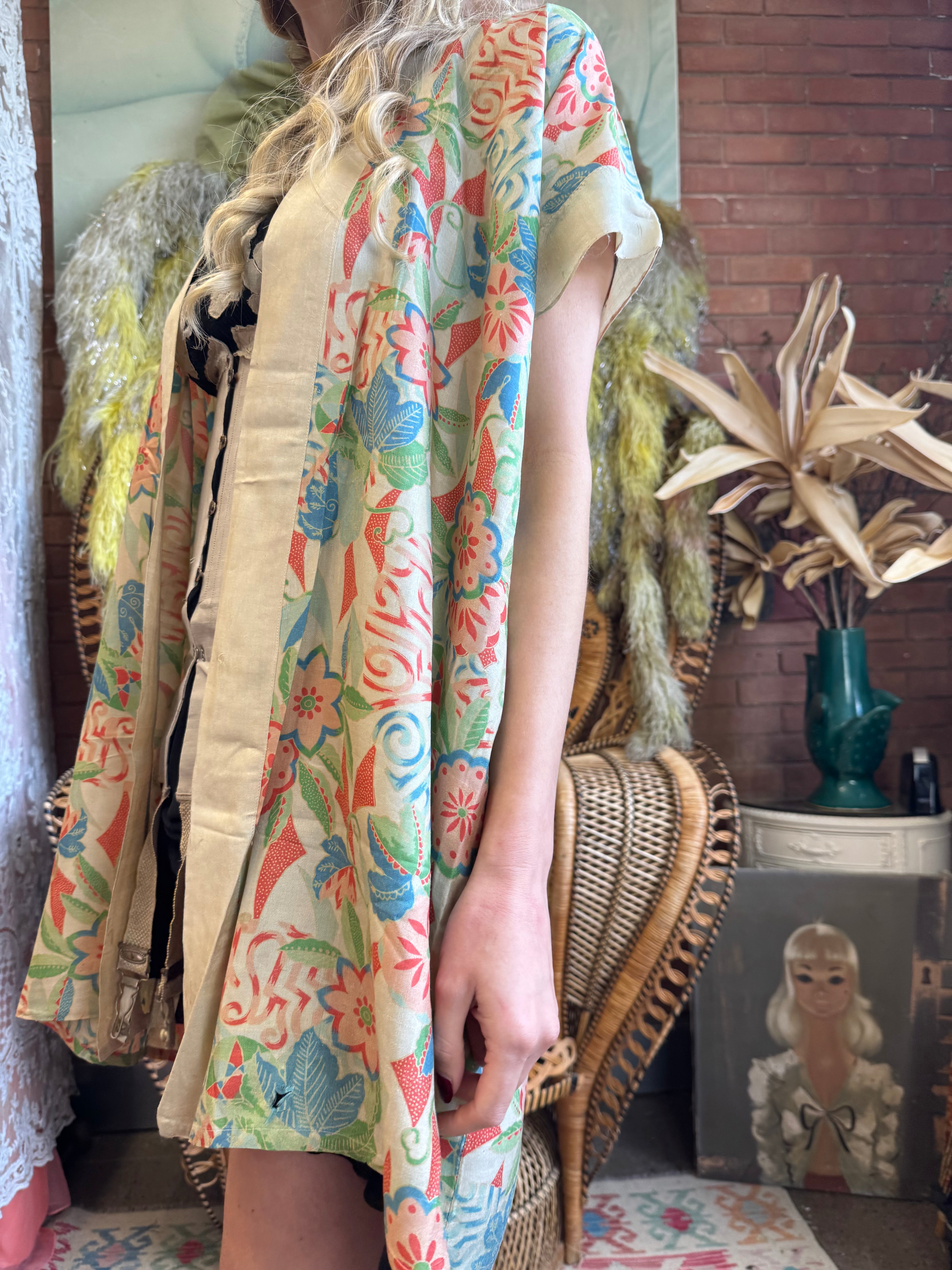 Experience vintage elegance with the unusual short sleeves 30s pongee silk jacket. Made from original 1930s silk pongee, this coverup features short sleeves and a charming print. Its lightweight quality adds a touch of luxury, and can be belted over any outfit for a polished look.