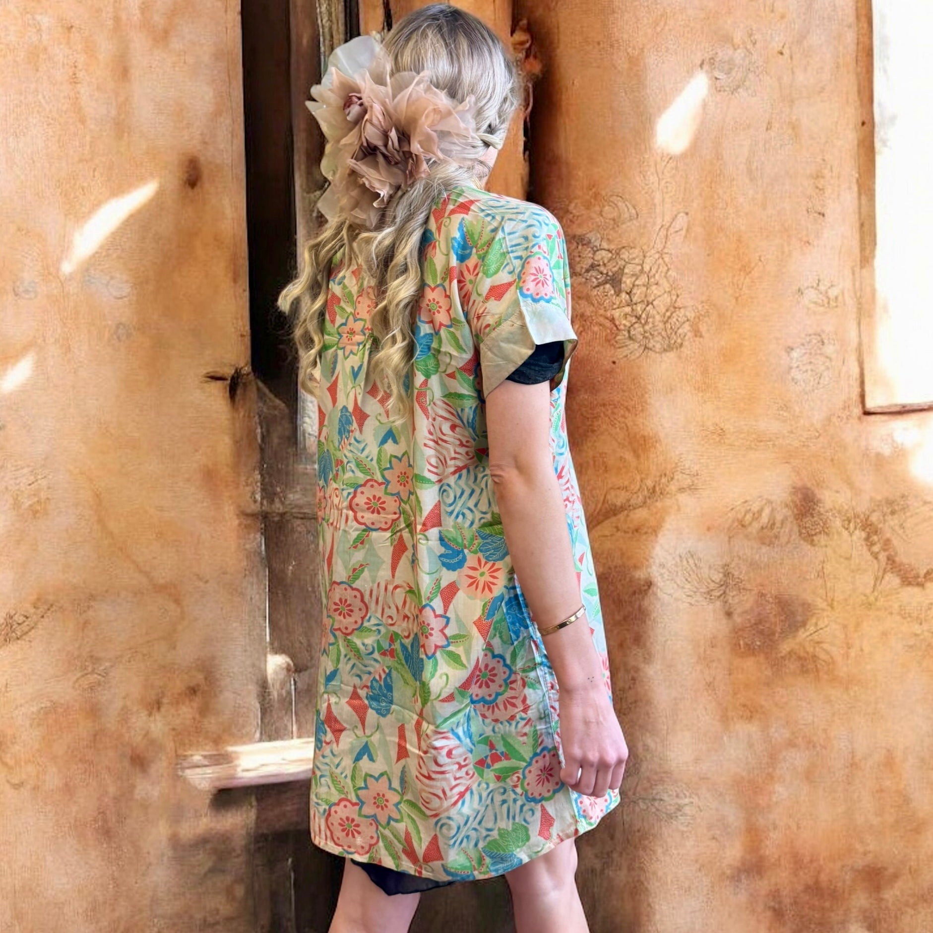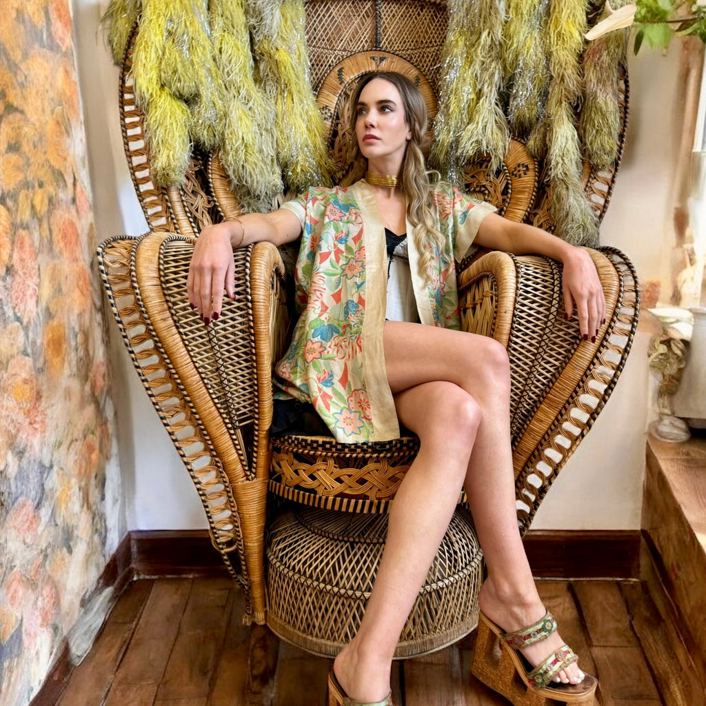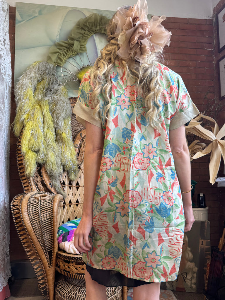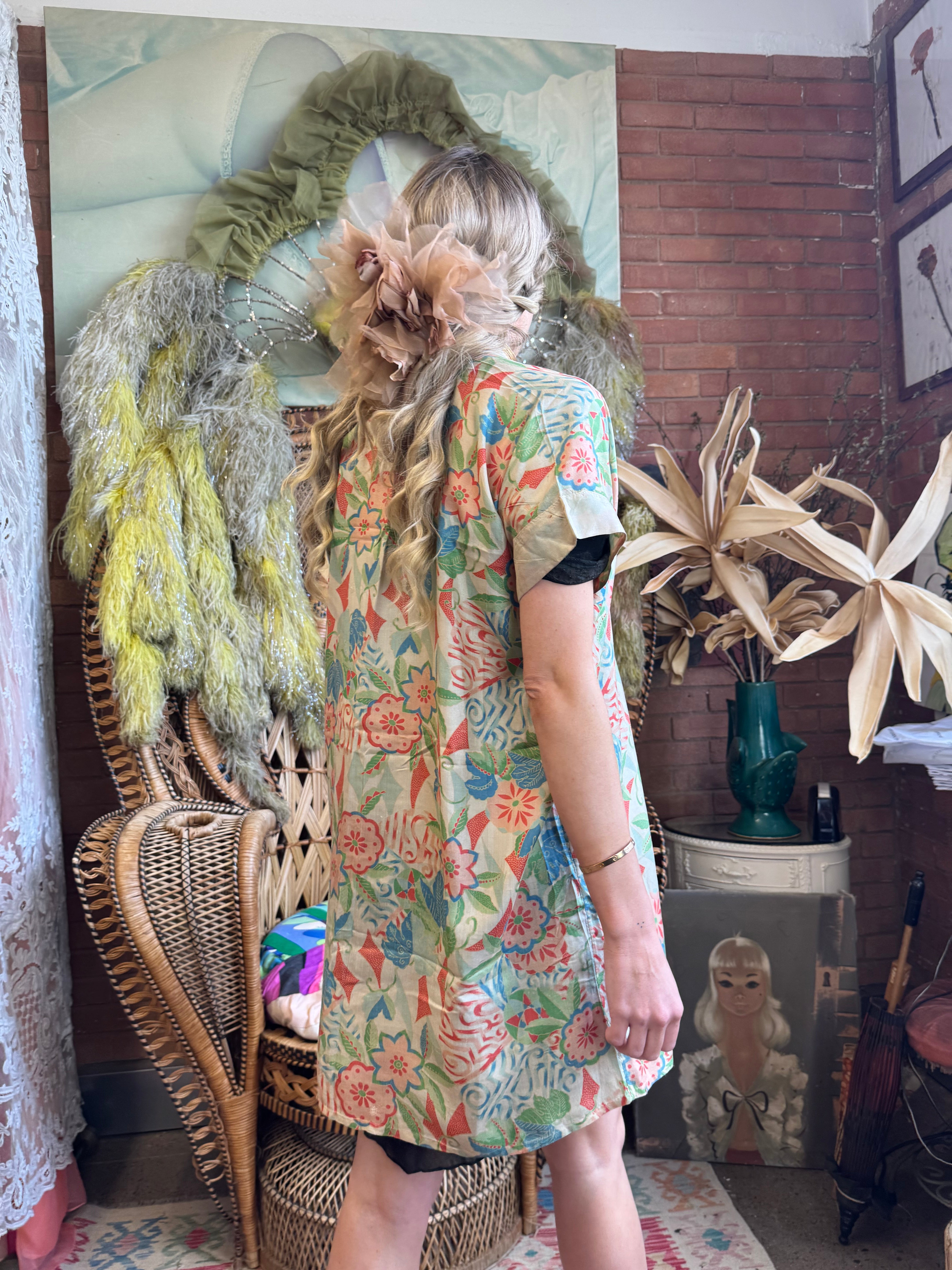 Experience vintage elegance with the unusual short sleeves 30s pongee silk jacket. Made from original 1930s silk pongee, this coverup features short sleeves and a charming print. Its lightweight quality adds a touch of luxury, and can be belted over any outfit for a polished look.