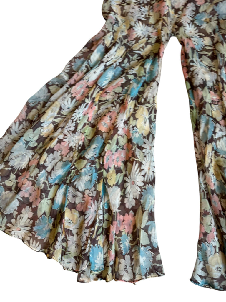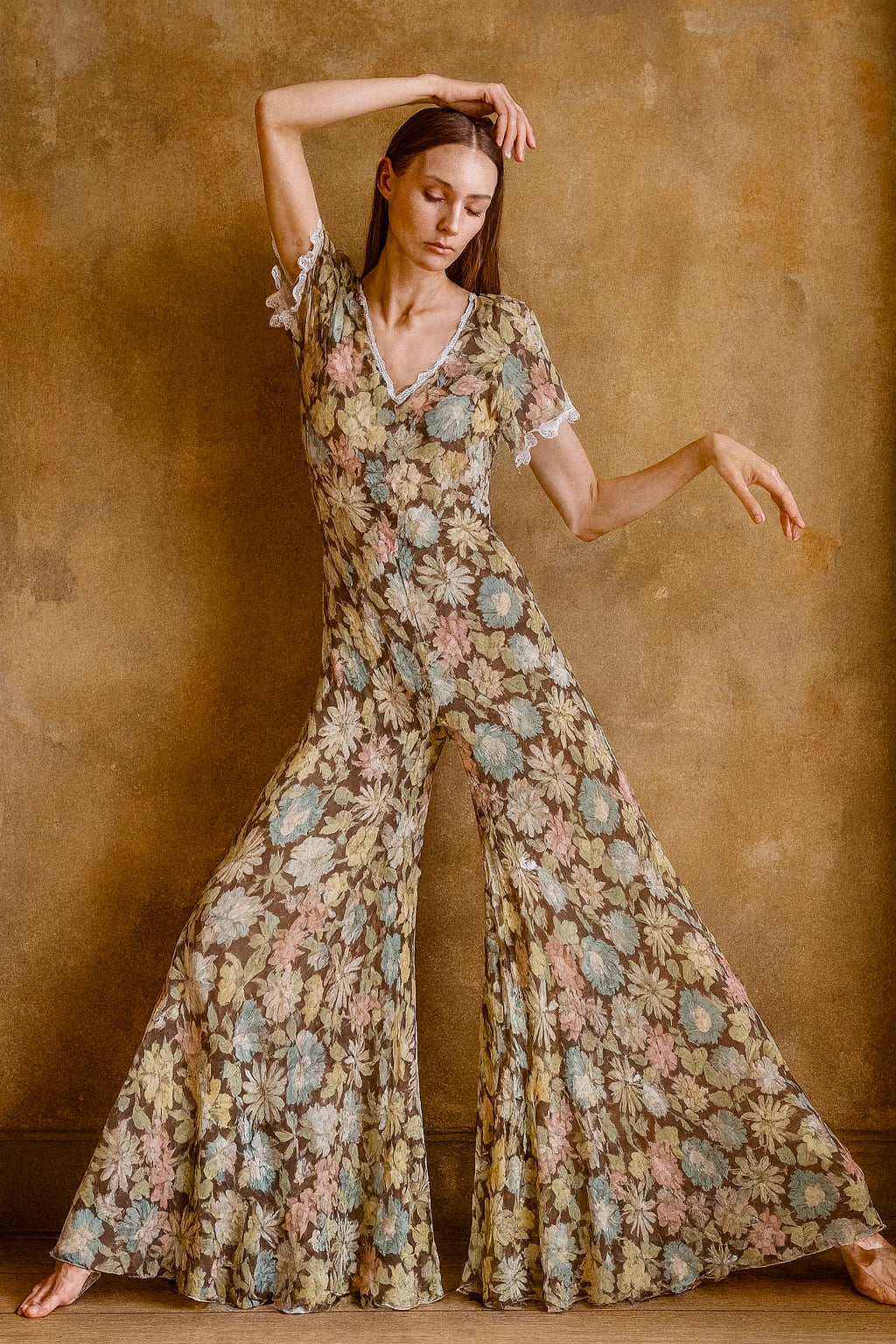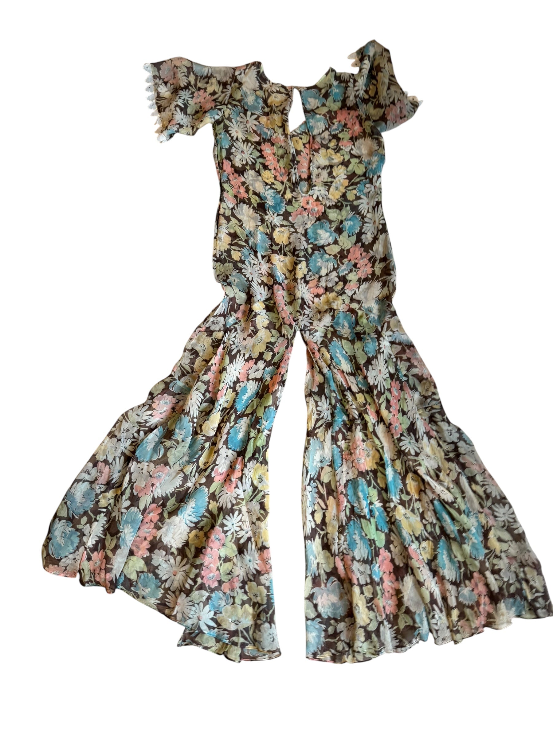 This original 1930s floral chiffon jumpsuit showcases a delicate short-sleeved design finished with a pretty scalloped edge, with a flattering front V-neckline. Its distinctive, flowing long silhouette features dramatic flares that capture the era’s elegance. The adjustable back opening, secured with ties, allows for a customizable fit, combining vintage charm with functional comfort. Ideal for those appreciating authentic period fashion and refined craftsmanship.