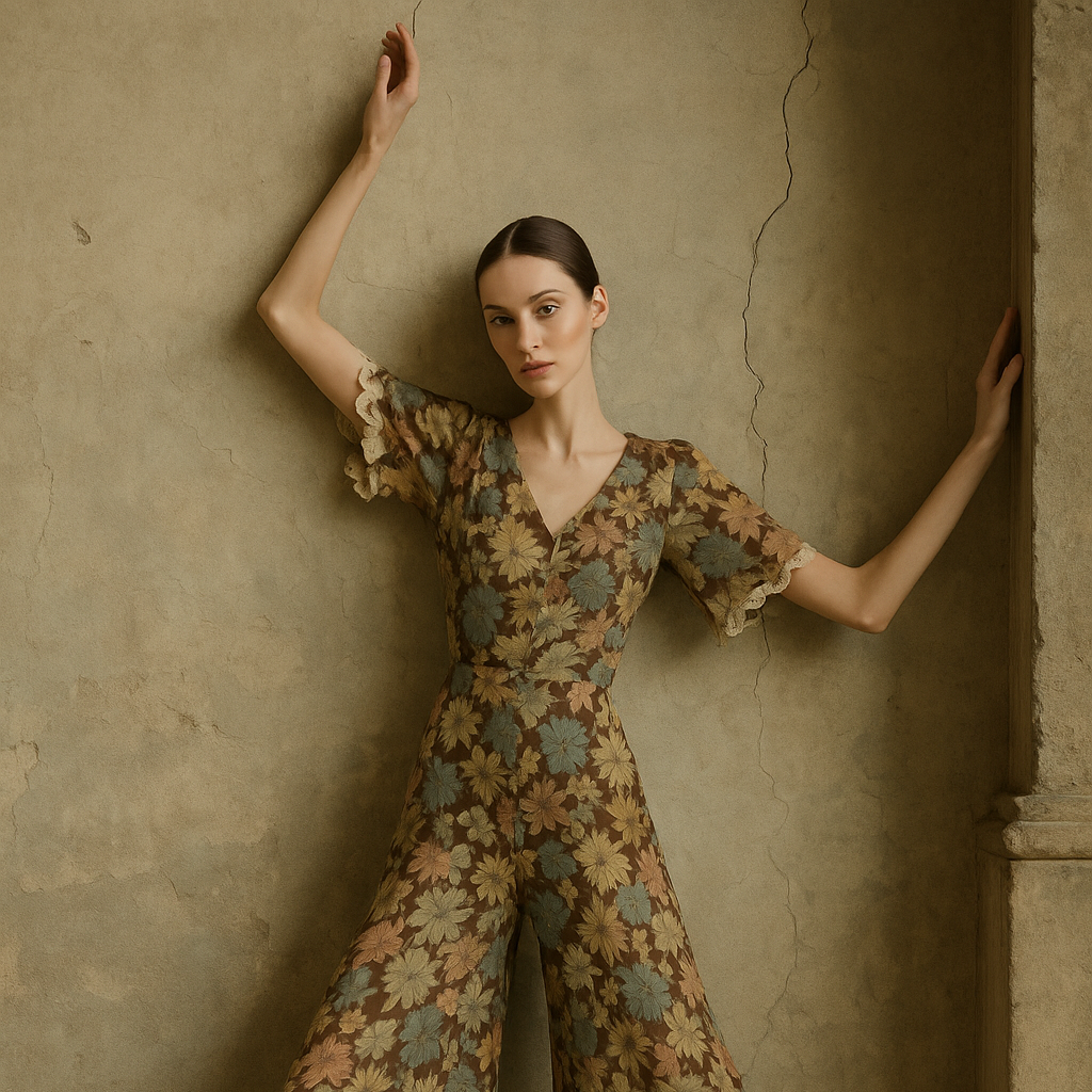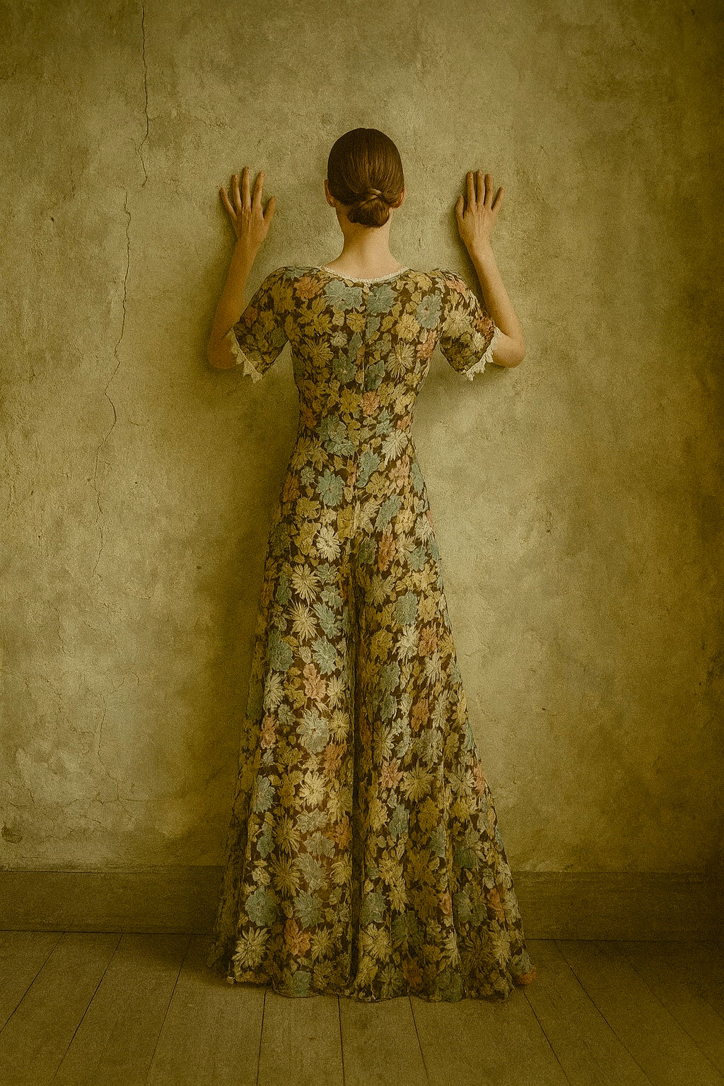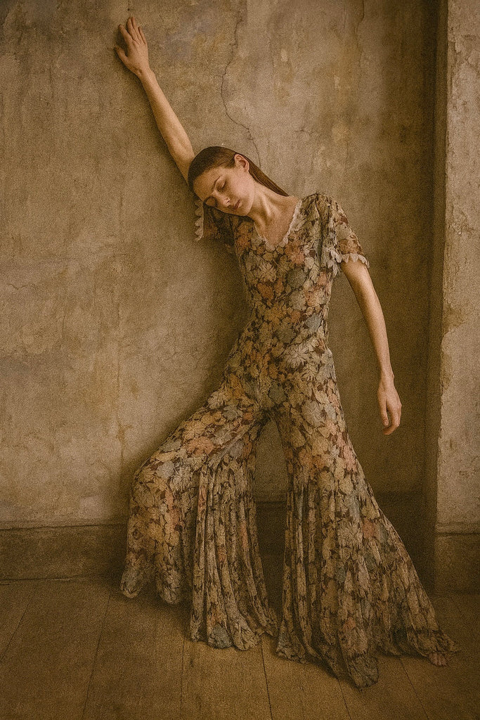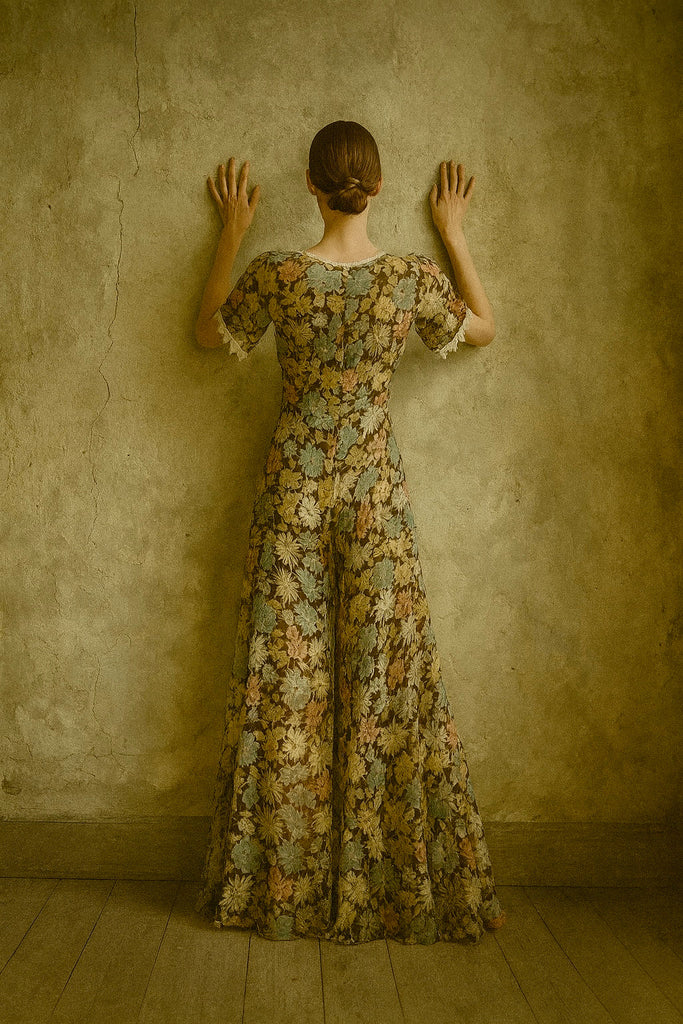 This original 1930s floral chiffon jumpsuit showcases a delicate short-sleeved design finished with a pretty scalloped edge, with a flattering front V-neckline. Its distinctive, flowing long silhouette features dramatic flares that capture the era’s elegance. The adjustable back opening, secured with ties, allows for a customizable fit, combining vintage charm with functional comfort. Ideal for those appreciating authentic period fashion and refined craftsmanship.