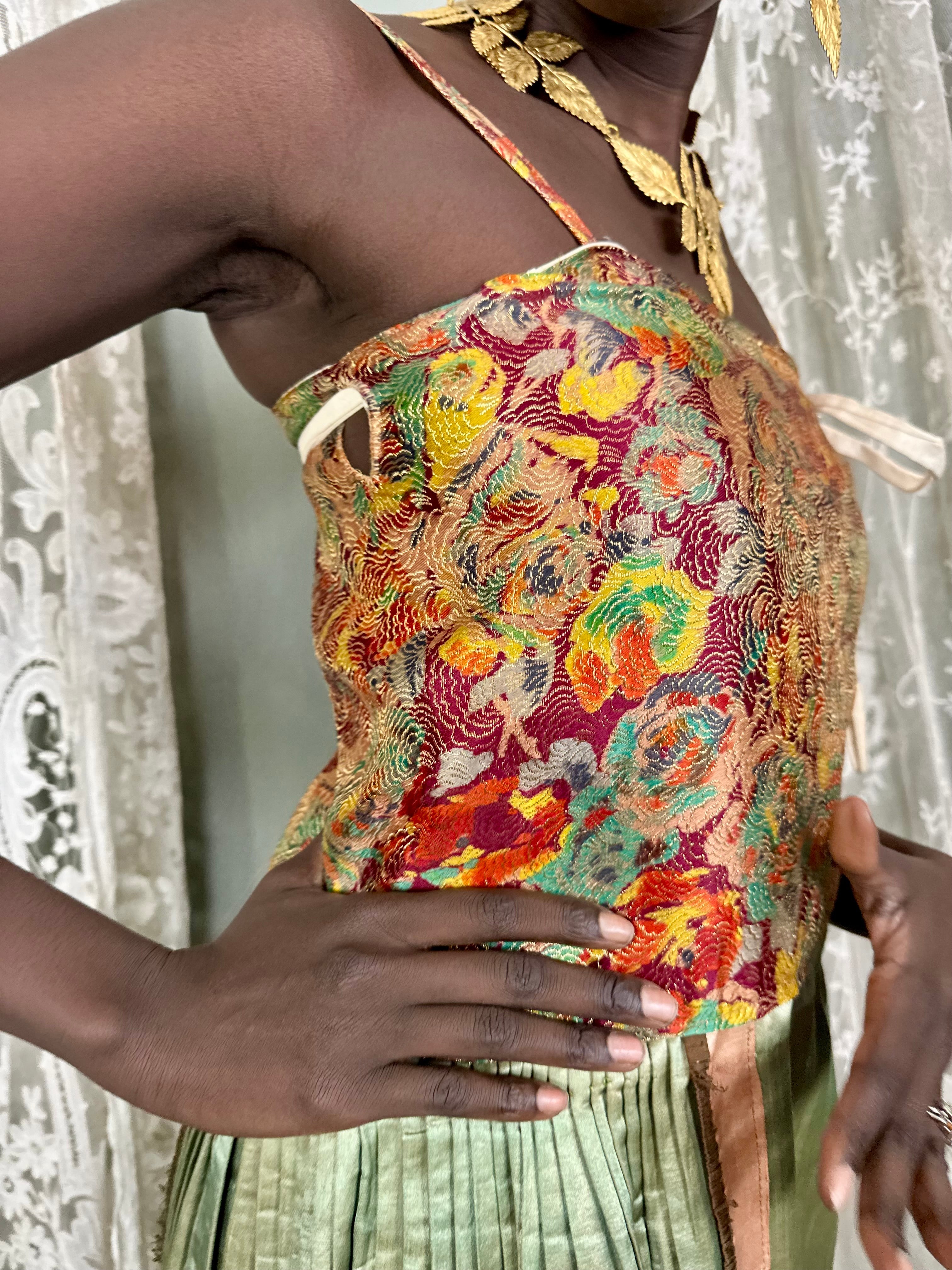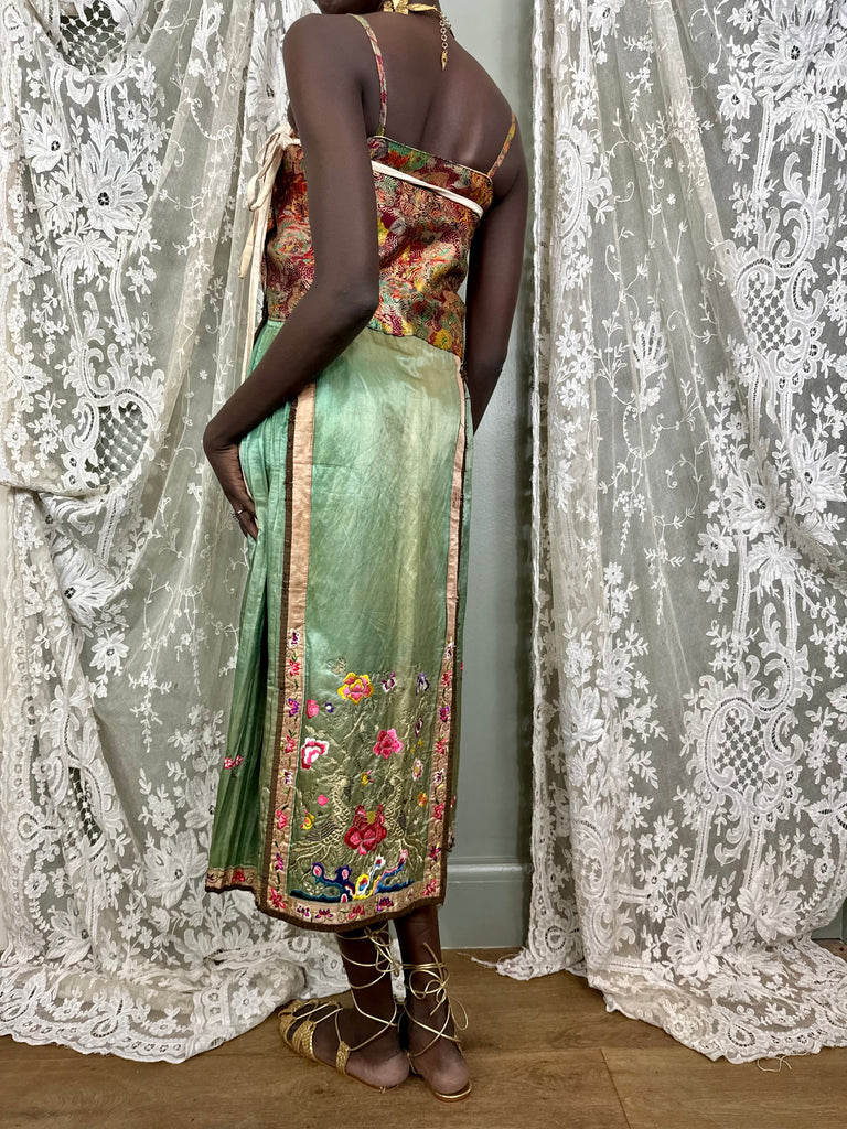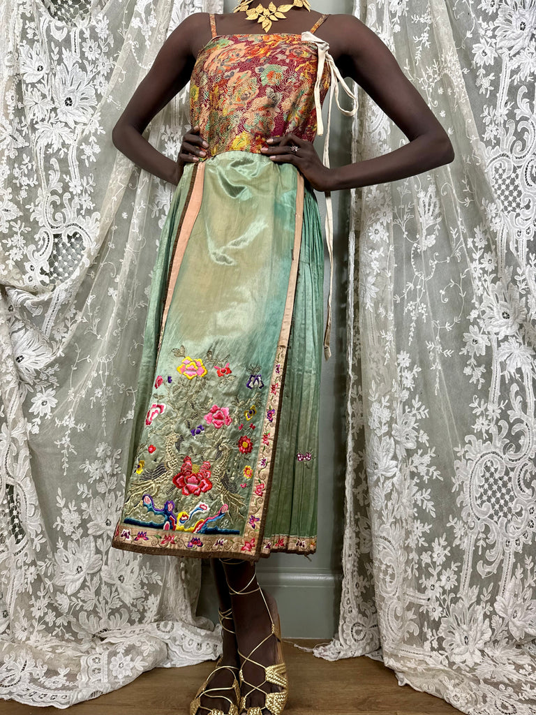 This unique dress is a one of a kind reworked piece, combining a vintage 30s Chinese embroidered skirt with a 20s silk floral lamé top. The pleated skirt features intricate sequin details and vibrant florals, while the pale green silk and matching straps add a touch of elegance. With a wrap design and cream tie, this dress is a timeless addition to any wardrobe.