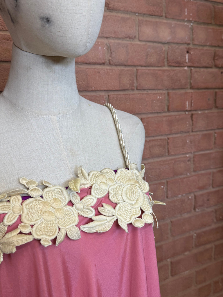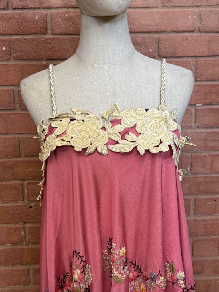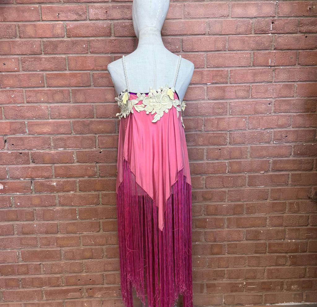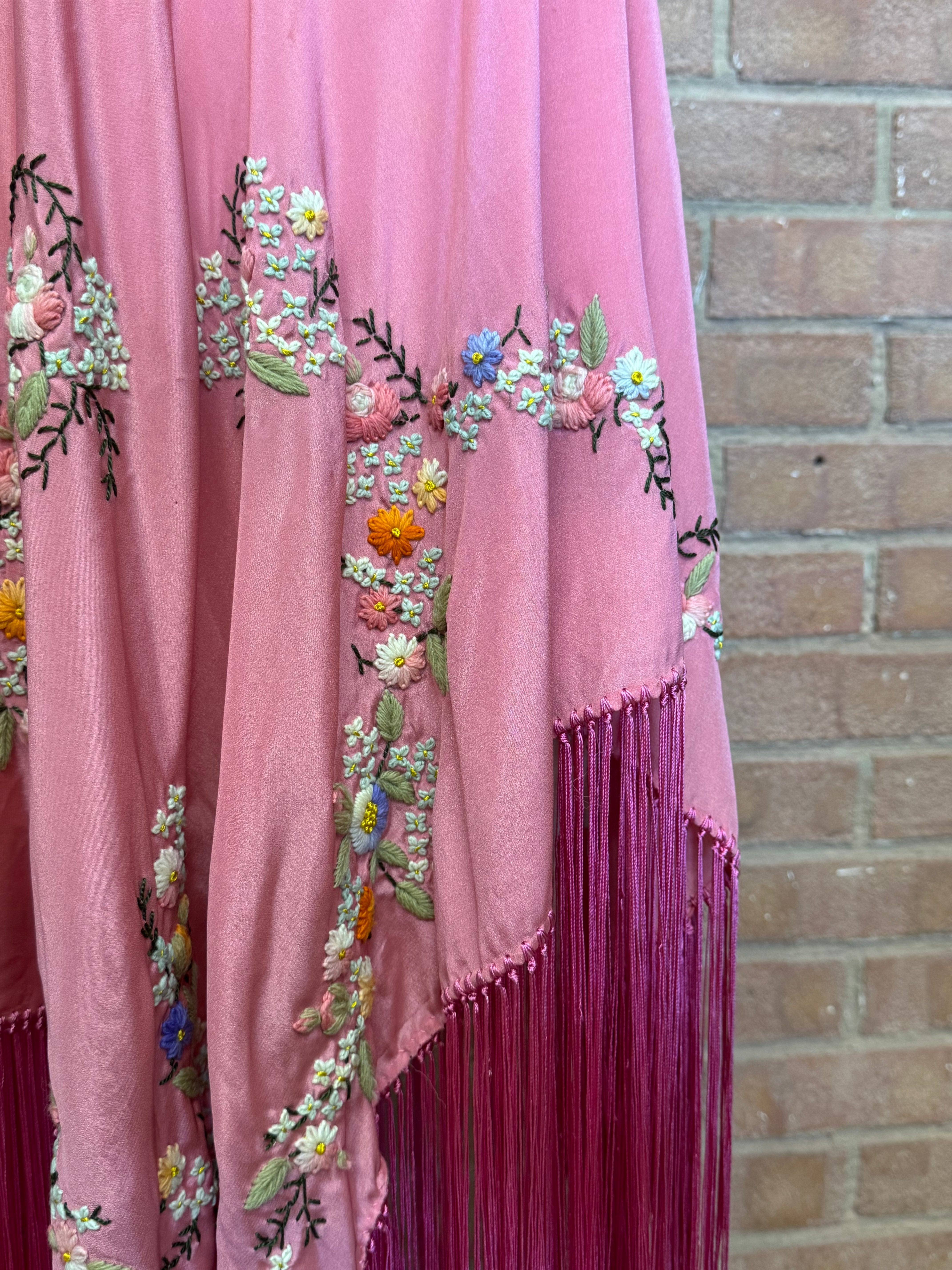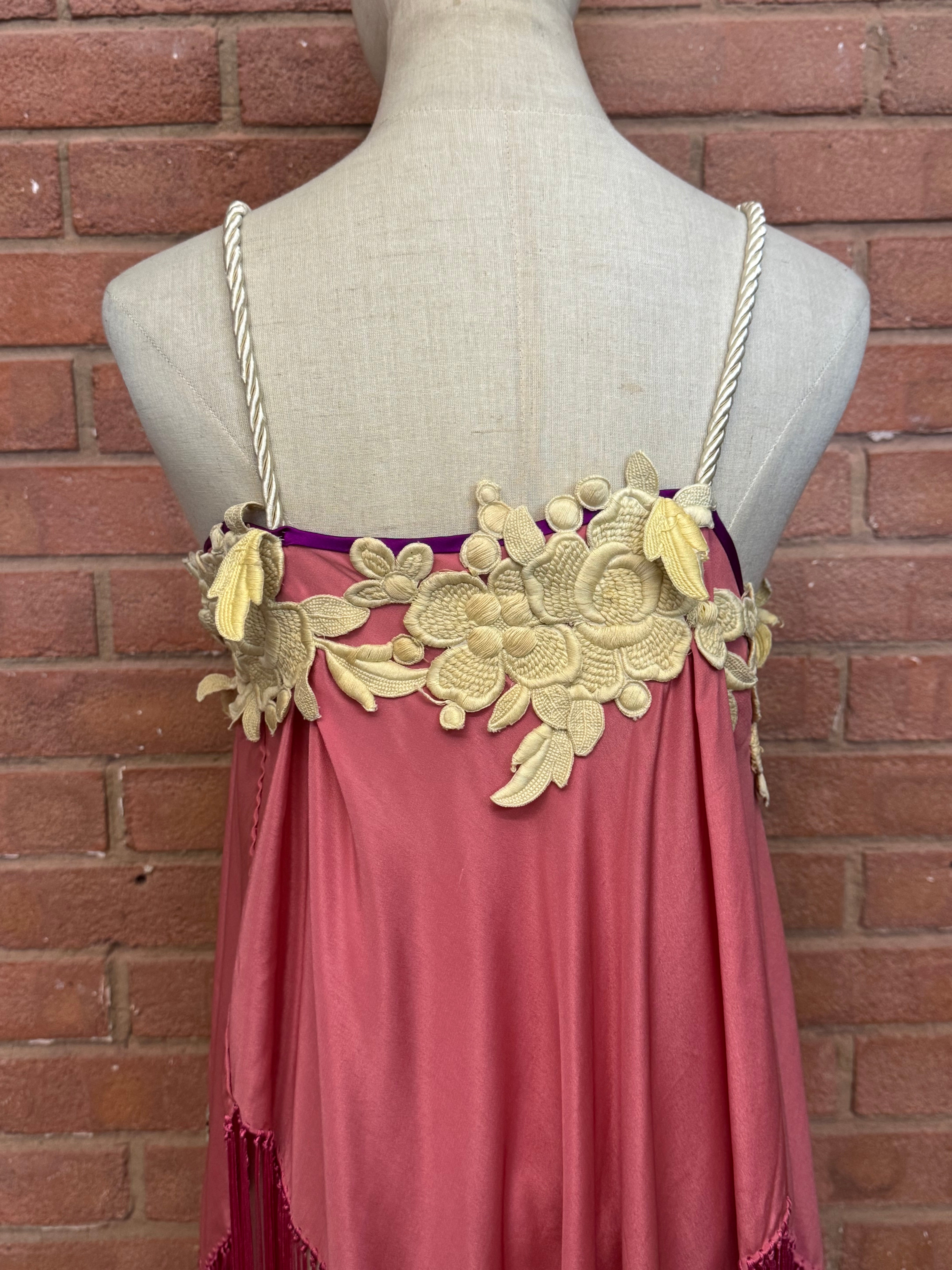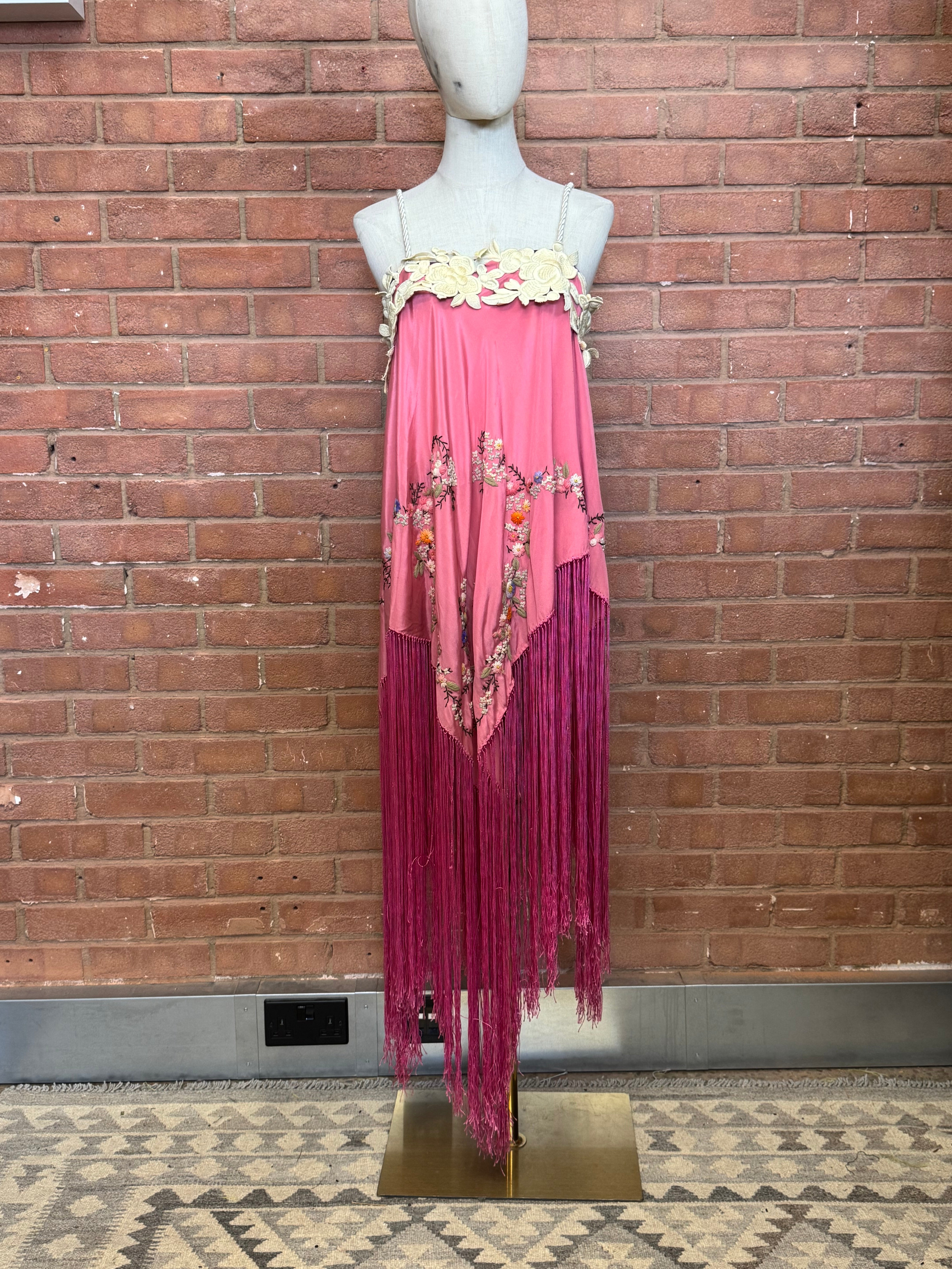 This unique reworked 1930s pink silk fringed scarf tunic showcases intricate handmade floral details and dense floral embroidery on the bust, highlighting expert craftsmanship. The straps, crafted from authentic 1970s braids, add vintage charm. Designed with a loose fit, it offers versatile styling options as a dress or tunic, blending timeless elegance with contemporary wearability.