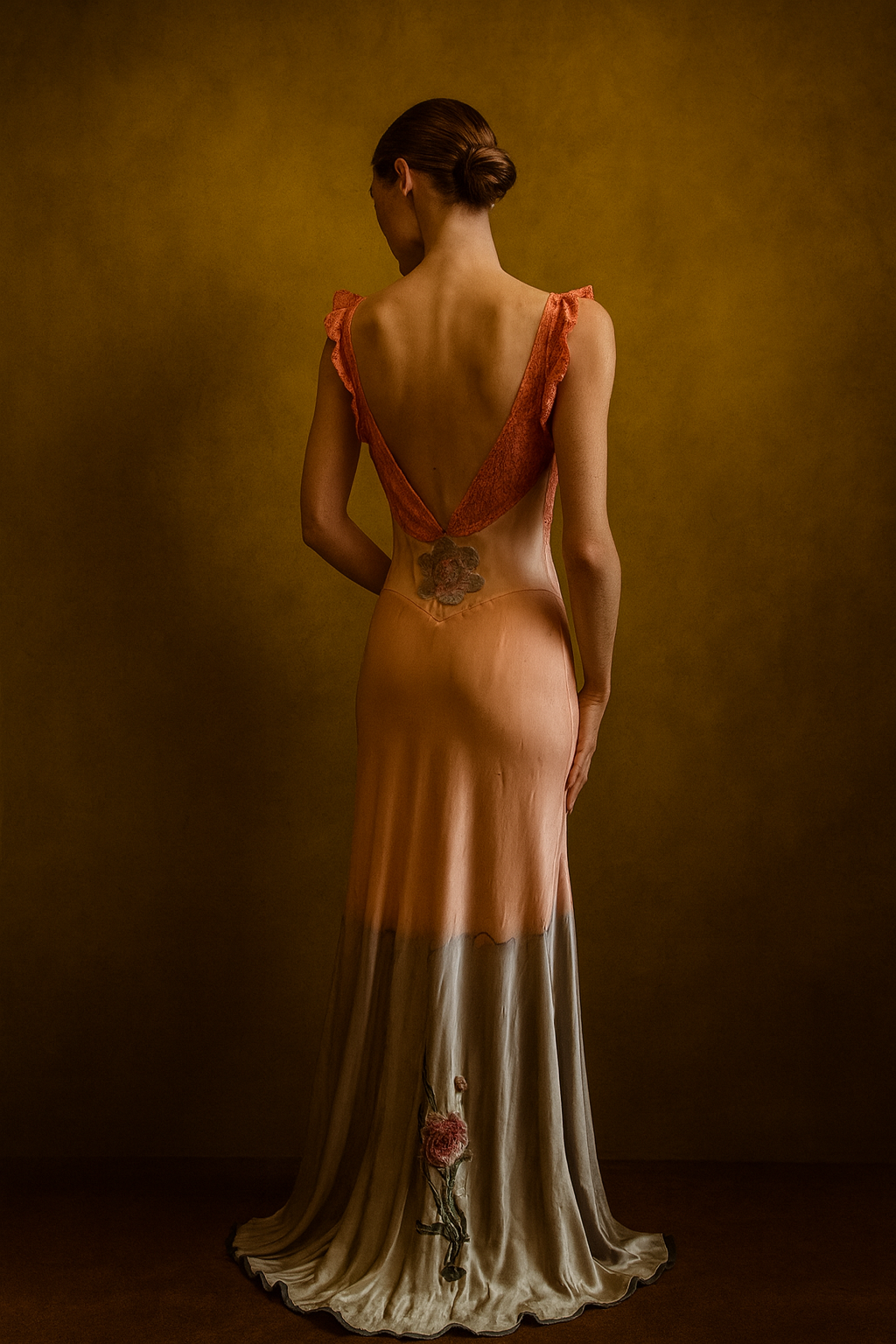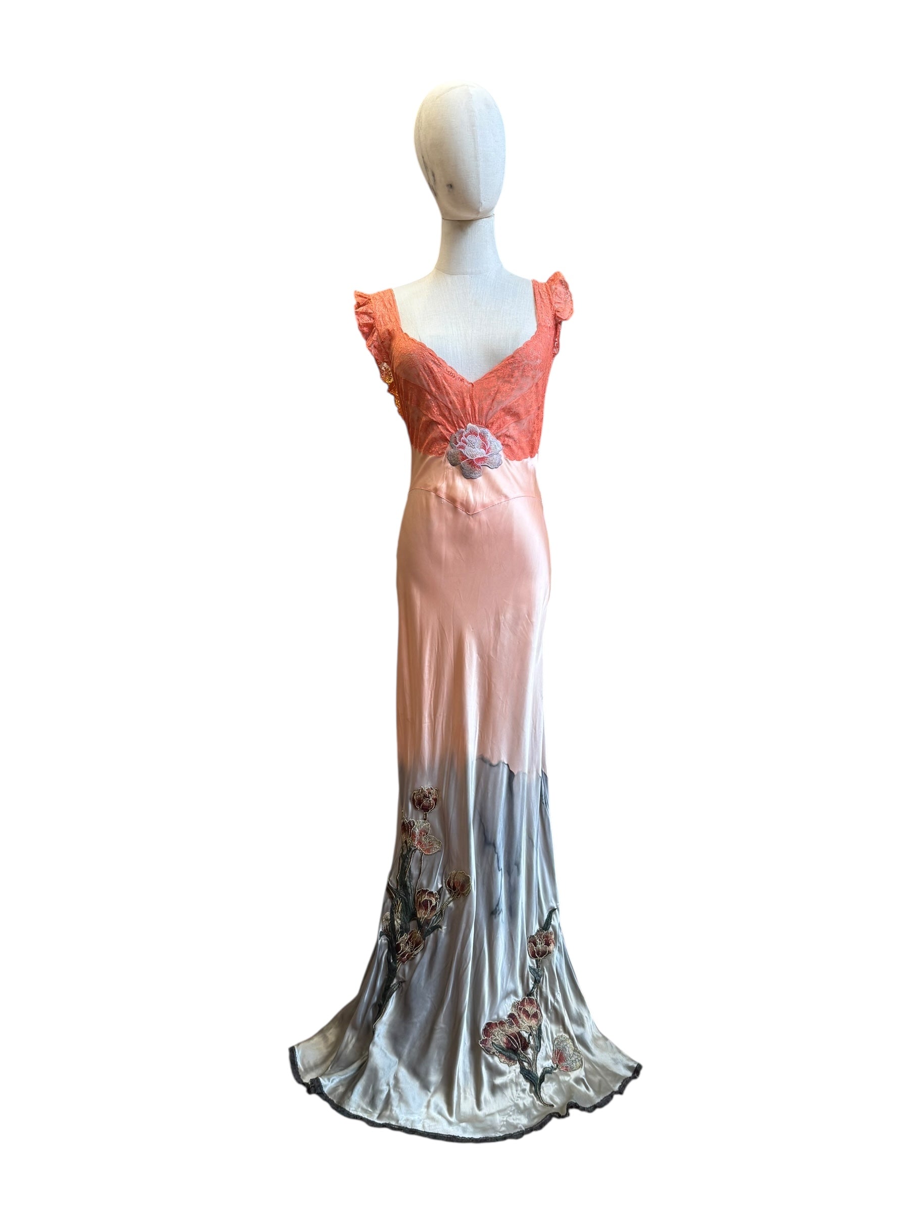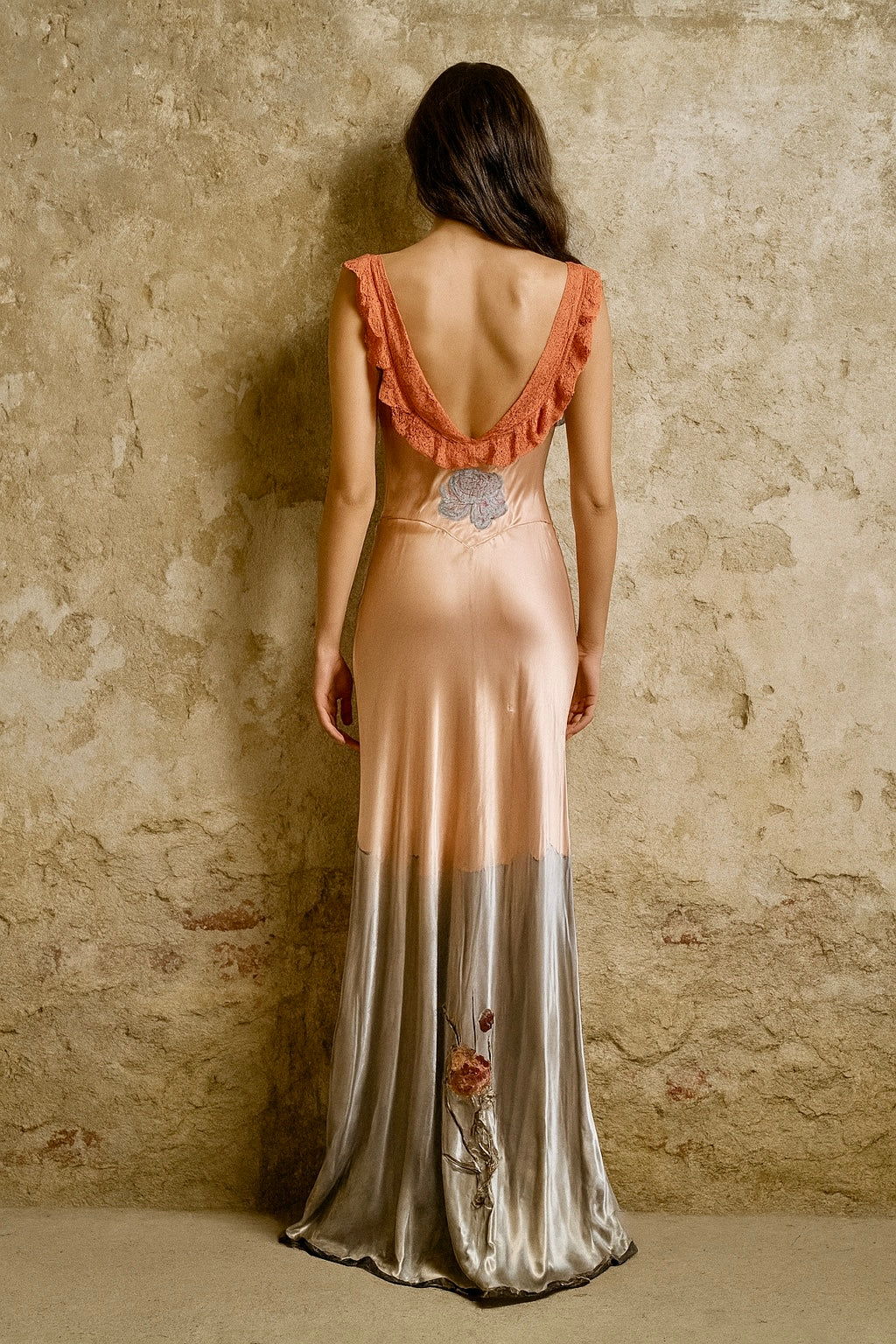 This one of a kind reworked 20s silk and lace dress is a true testament to timeless beauty and skilled craftsmanship. Featuring intricate floral embroidery and a lace bust with a scoop back, this long bias cut silhouette dress exudes elegance. The hand-dyed orange and dark brown hue adds a unique touch to this timeless reinvented piece. Has a side fastening.