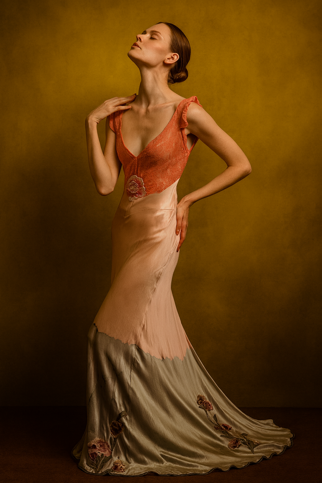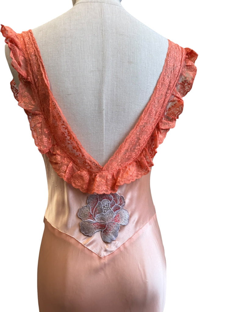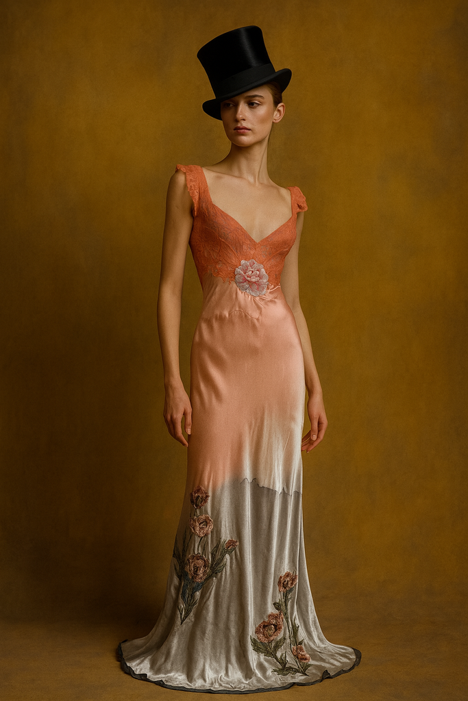 This one of a kind reworked 20s silk and lace dress is a true testament to timeless beauty and skilled craftsmanship. Featuring intricate floral embroidery and a lace bust with a scoop back, this long bias cut silhouette dress exudes elegance. The hand-dyed orange and dark brown hue adds a unique touch to this timeless reinvented piece. Has a side fastening.