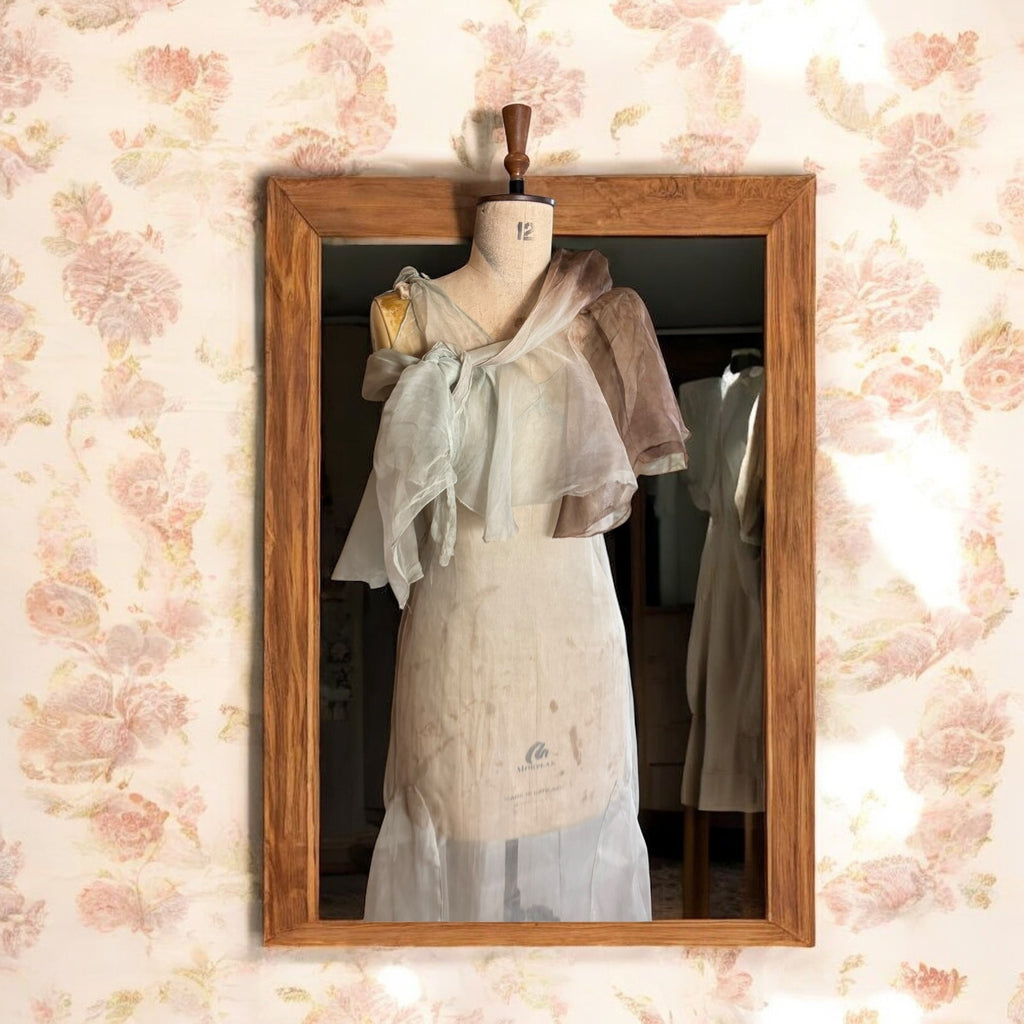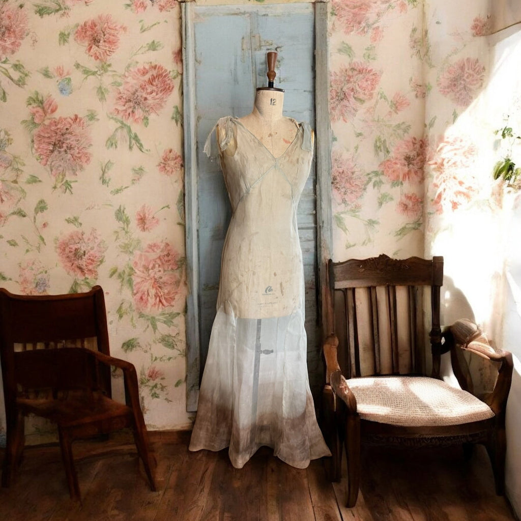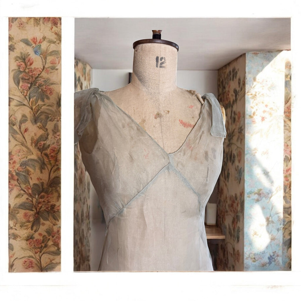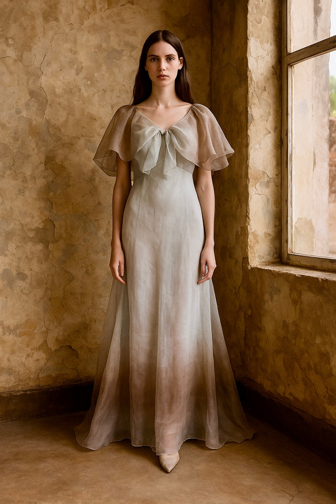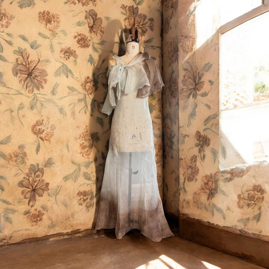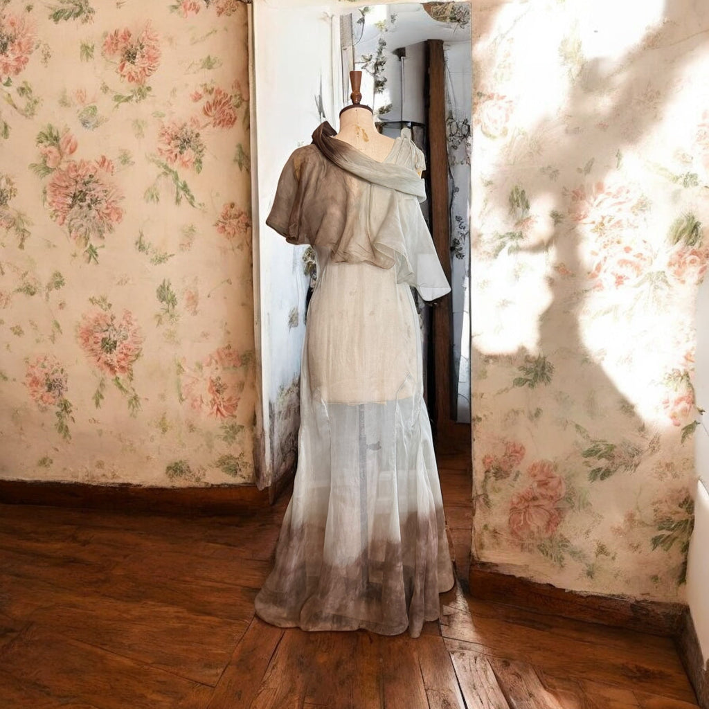 This unique 1930s Seraphine dress showcases a delicate organza fabric with a mint green and brown dip-dyed effect. Featuring a distinctive neckline and bows on the shoulders, its biased cut enhances the elegant fishtail silhouette. Has side fastenings. The matching bolero, designed to tie off the shoulders or wear as a cape, completes this vintage ensemble with refined versatility and period-authentic charm.