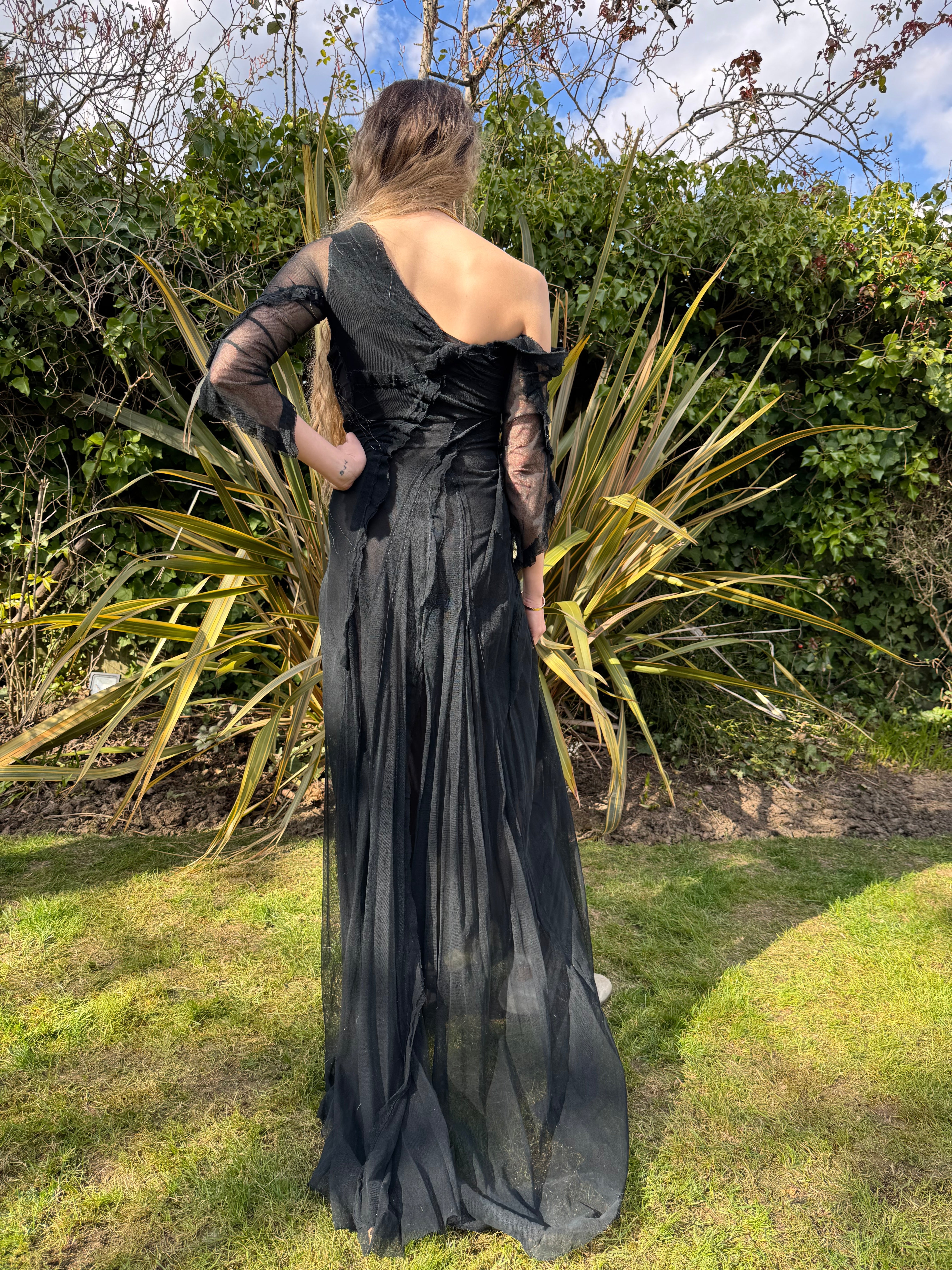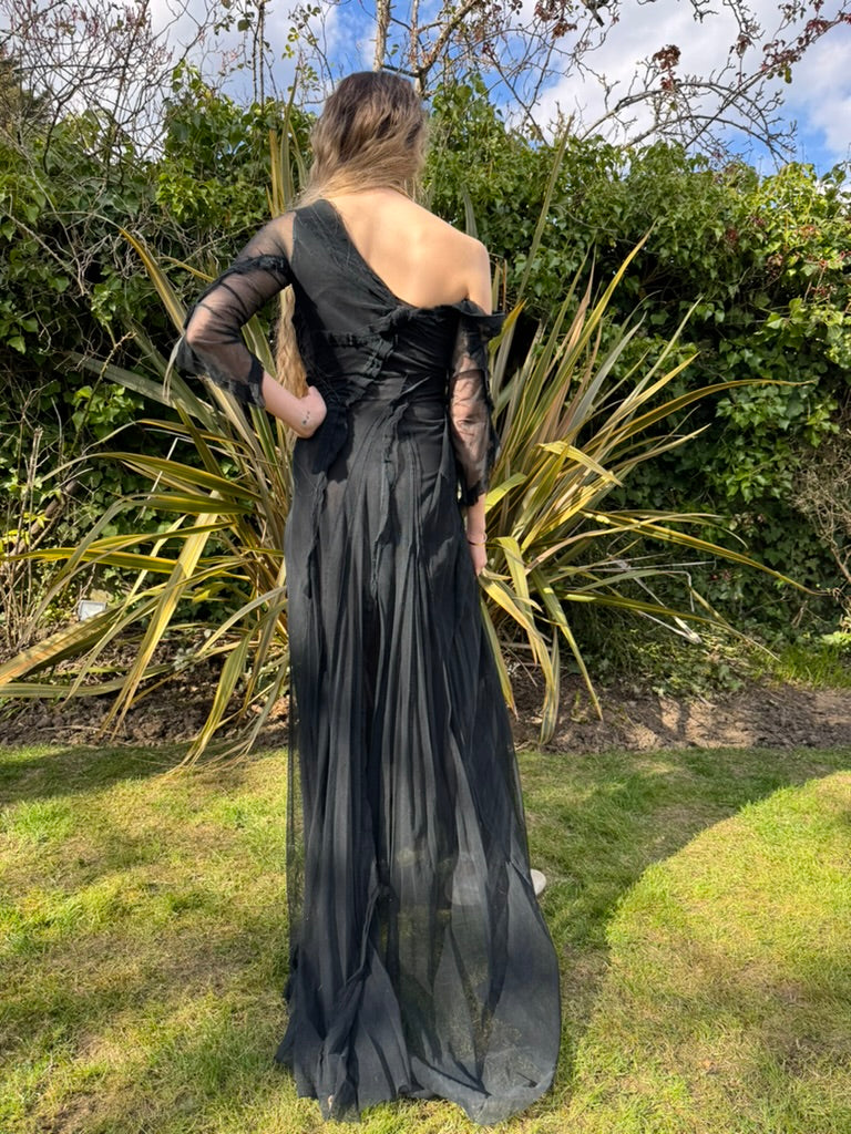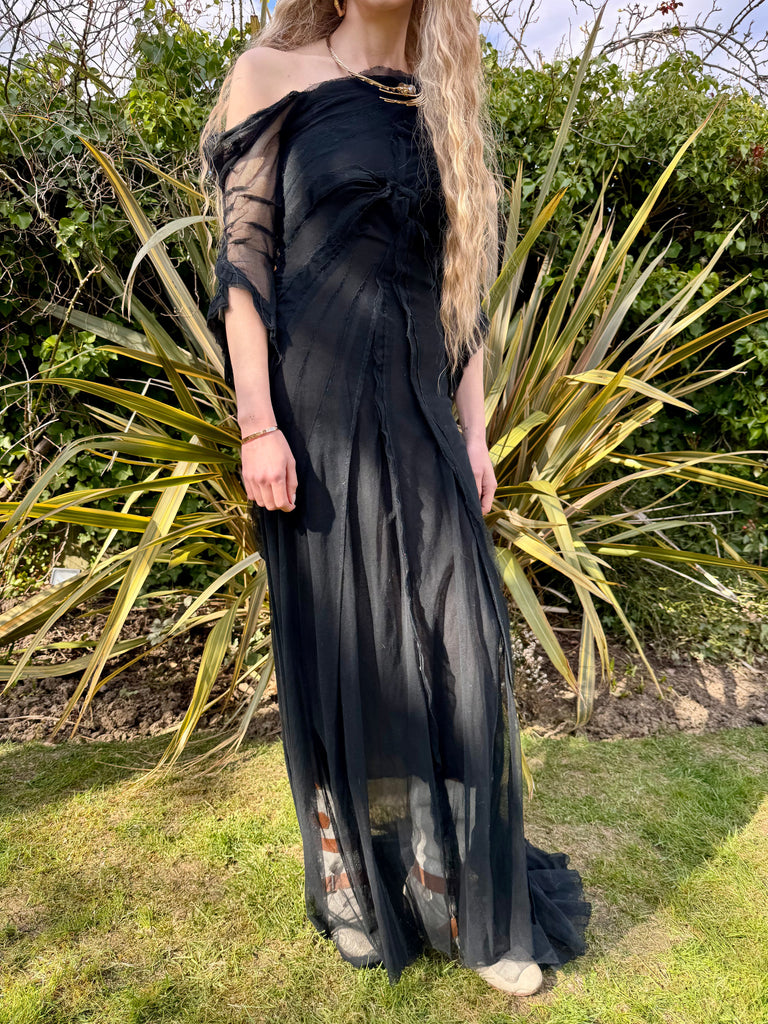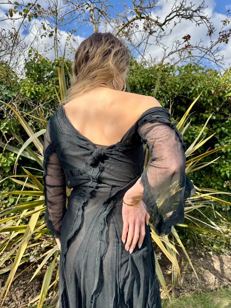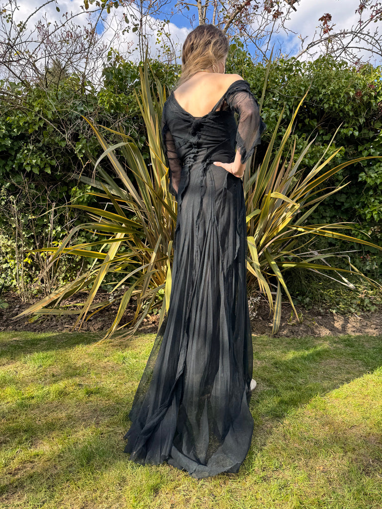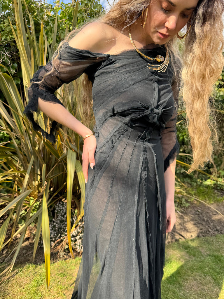 This stunning bespoke black fine cotton net 30s gown features an off-the-shoulder design, half sleeves, a pleated design, and an assymetric hem. Its knotted bust and cascading layers of net create a unique and eye-catching look. This dress is lined in nude for added comfort and elegance. Has a back zip and cinches the body beautifully.