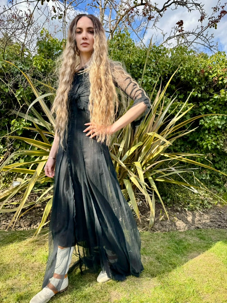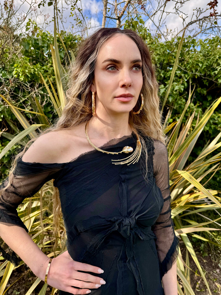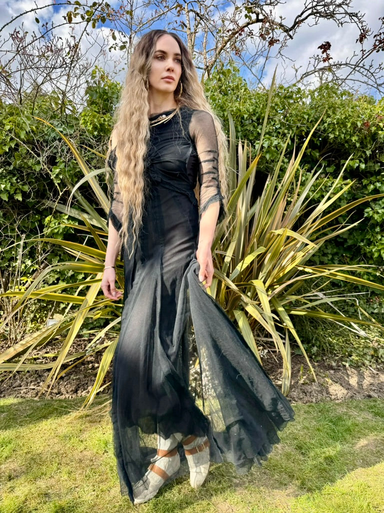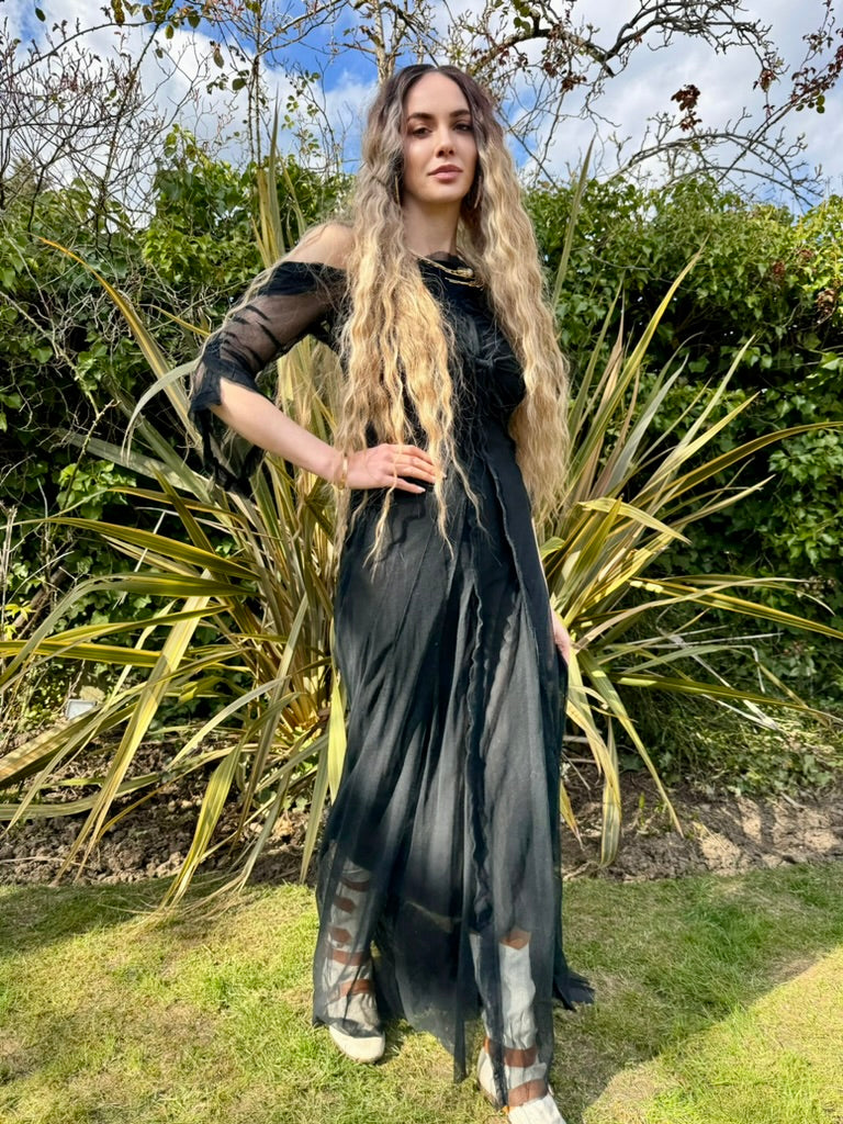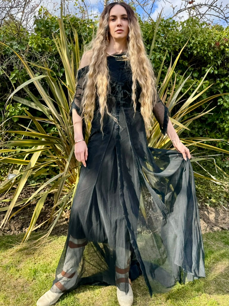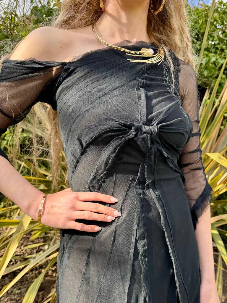 This stunning bespoke black fine cotton net 30s gown features an off-the-shoulder design, half sleeves, a pleated design, and an assymetric hem. Its knotted bust and cascading layers of net create a unique and eye-catching look. This dress is lined in nude for added comfort and elegance. Has a back zip and cinches the body beautifully.