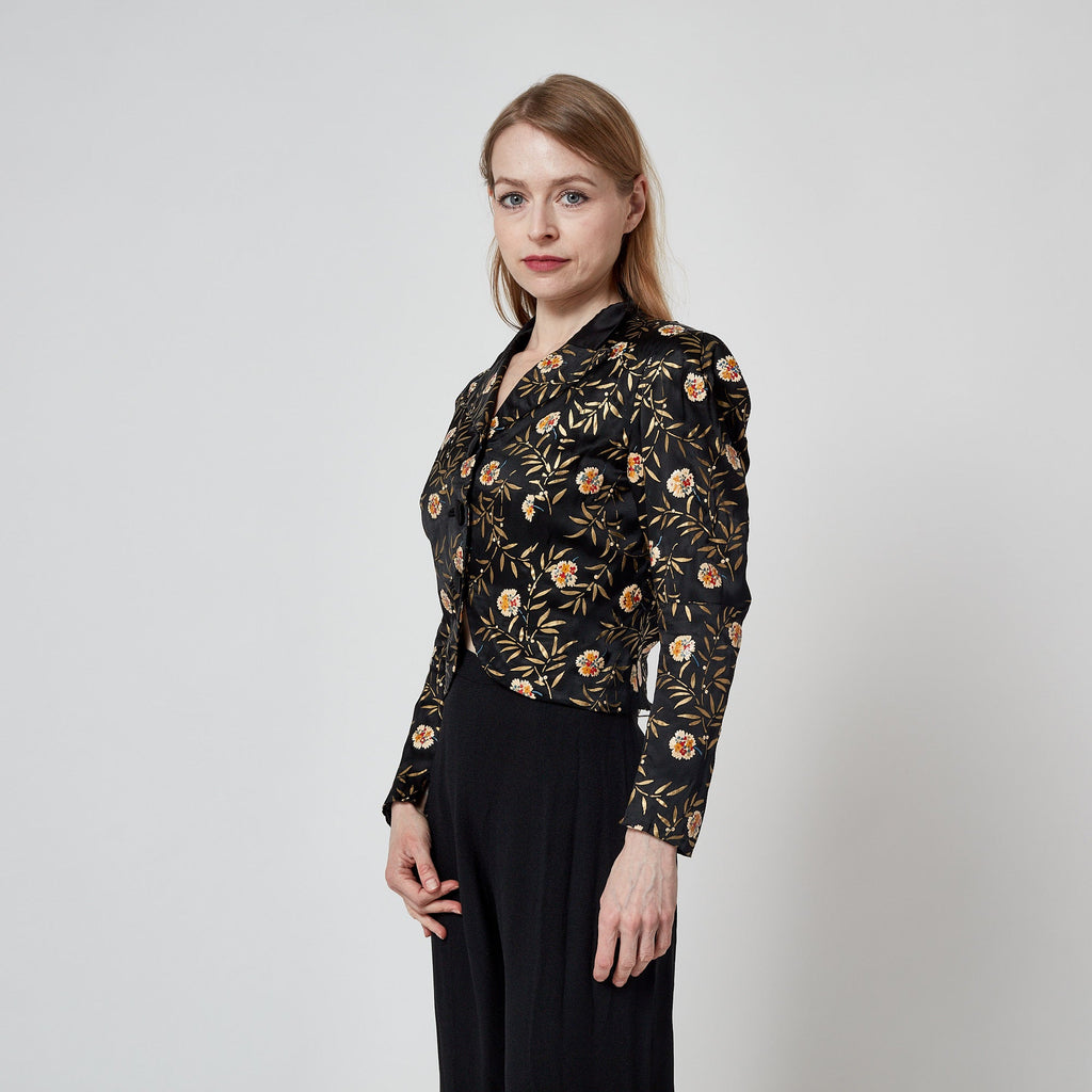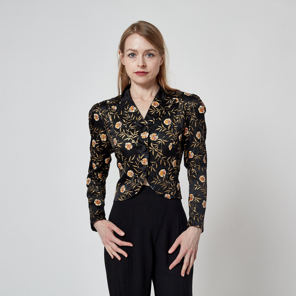 This 1930s Yvonne of Cherbourg hand painted silk jacket is petite and feminine, with deeply considered attention to detail in its construction. The shoulders are dainty, with a subtle puff feature atop of mid length sleeves that taper from just below the elbow. The sharp angles of the regency neckline juxtapose the curve either side of the bodice to the waistline. The three front facing buttons are covered in black silk to match the jacket, and each of the buttonholes are finished with piped silk seams. The waist flatters irrespective of whether worn open or closed. The most striking feature of this piece however, is the beautiful hand painted surface design, a gold leaf motif punctuated with glossy floral decoration in champagne, scarlet, ochre and deep blue. The jacket is in wonderful condition, with no notable flaws bar a tiny part of the fabric on the left sleeve is a little distressed. Would best suit US size 0, UK size 4-6. as there is no give and the sleeves are slender.